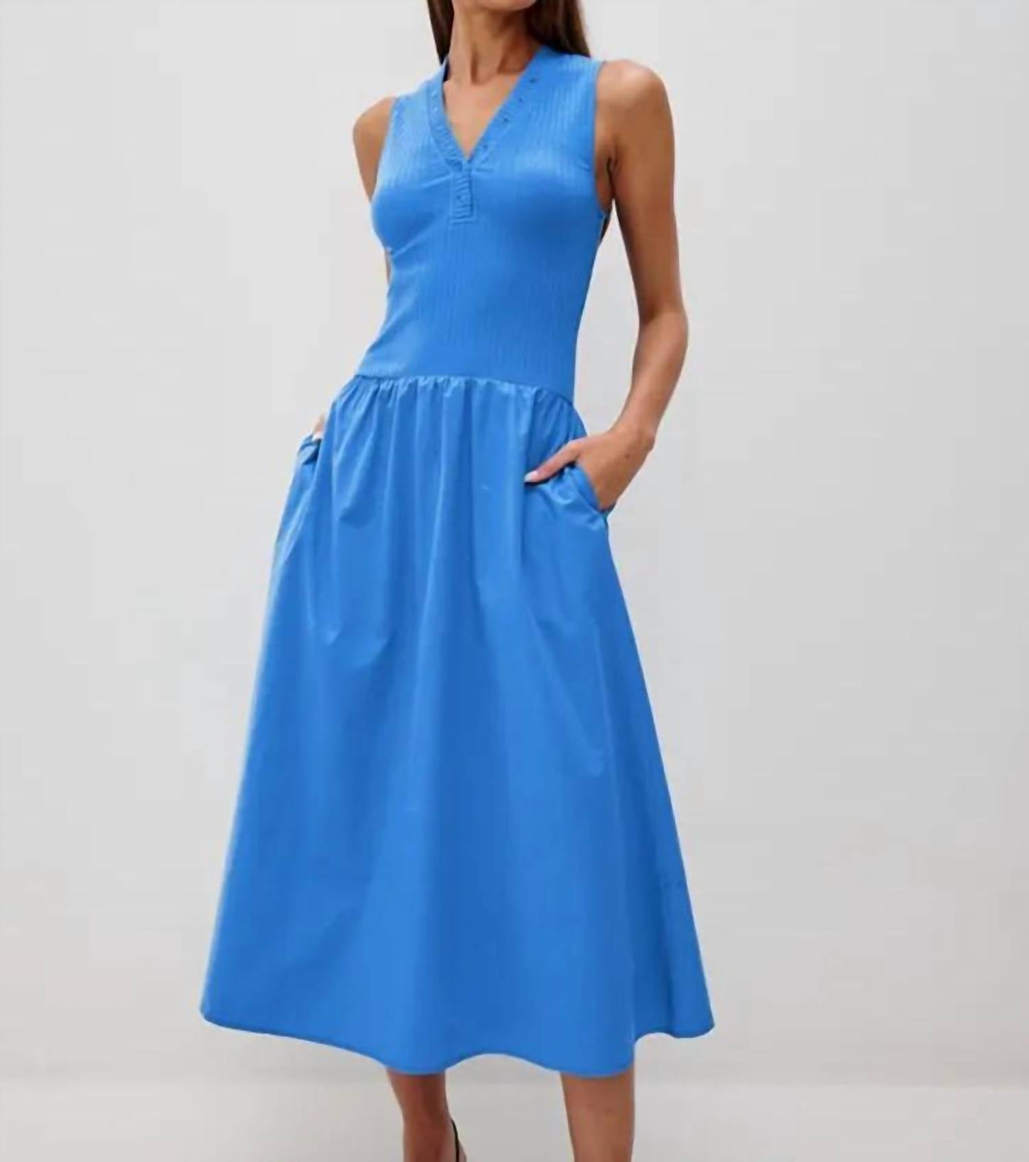 A midi dress so versatile, your options for wearing it are endless. Embrace effortless style with the Rails Currant Dress in French Blue, perfect for your summer getaways. This sundress showcases a sleeveless design with a ribbed cotton blend bodice flowing into a textured A-line poplin skirt, offering a feminine silhouette with a 49.5" garment length. It features a practical snap closure and pockets, adding to its functionality. Crafted with a blend of cotton, spandex, and sustainably produced Tencel® lyocell from an imported origin, the dress demands care with a hand wash and laid flat to dry for lasting elegance.