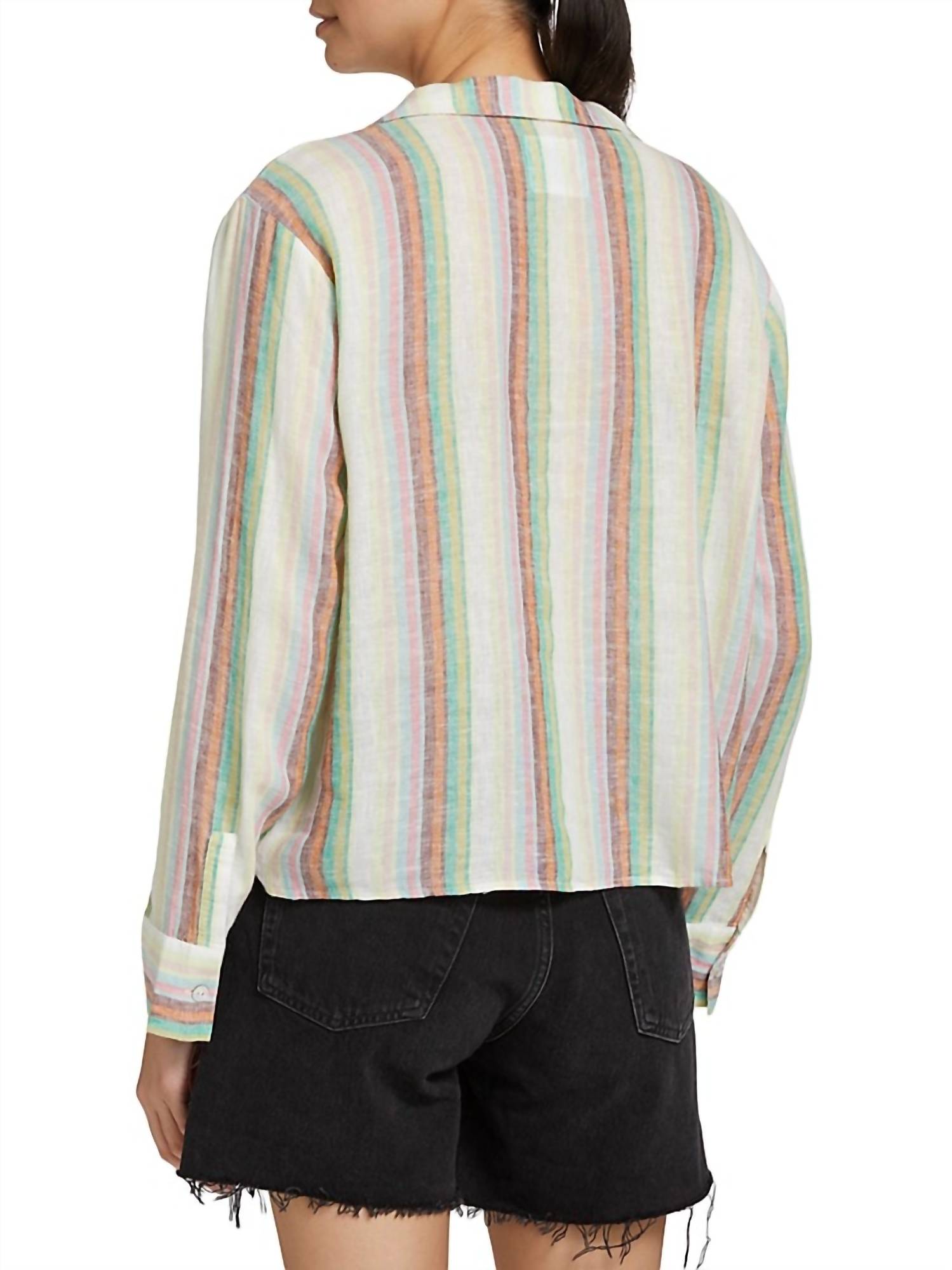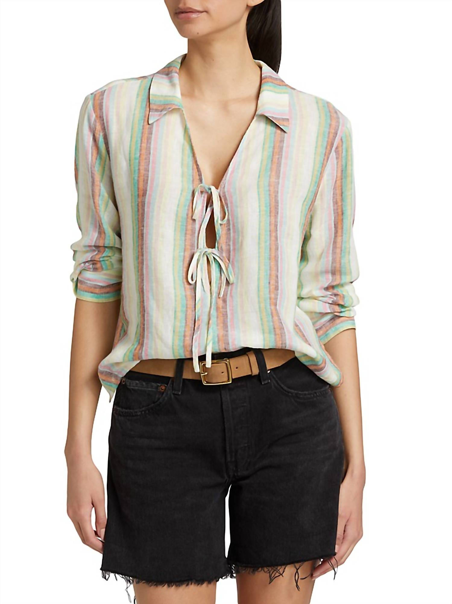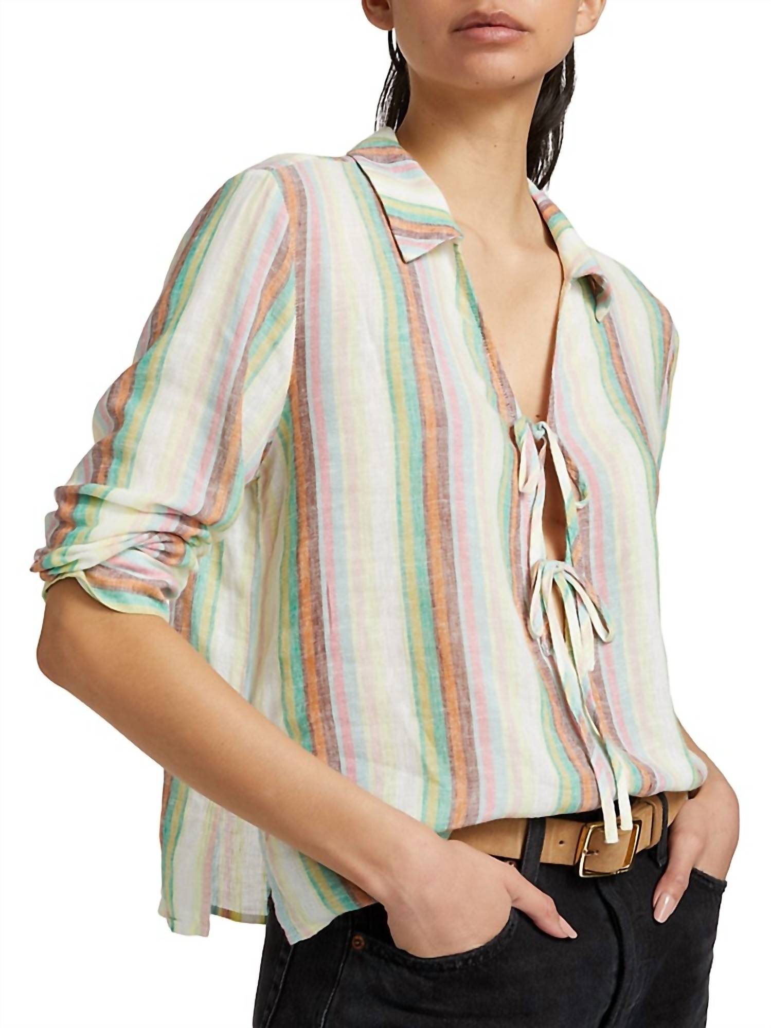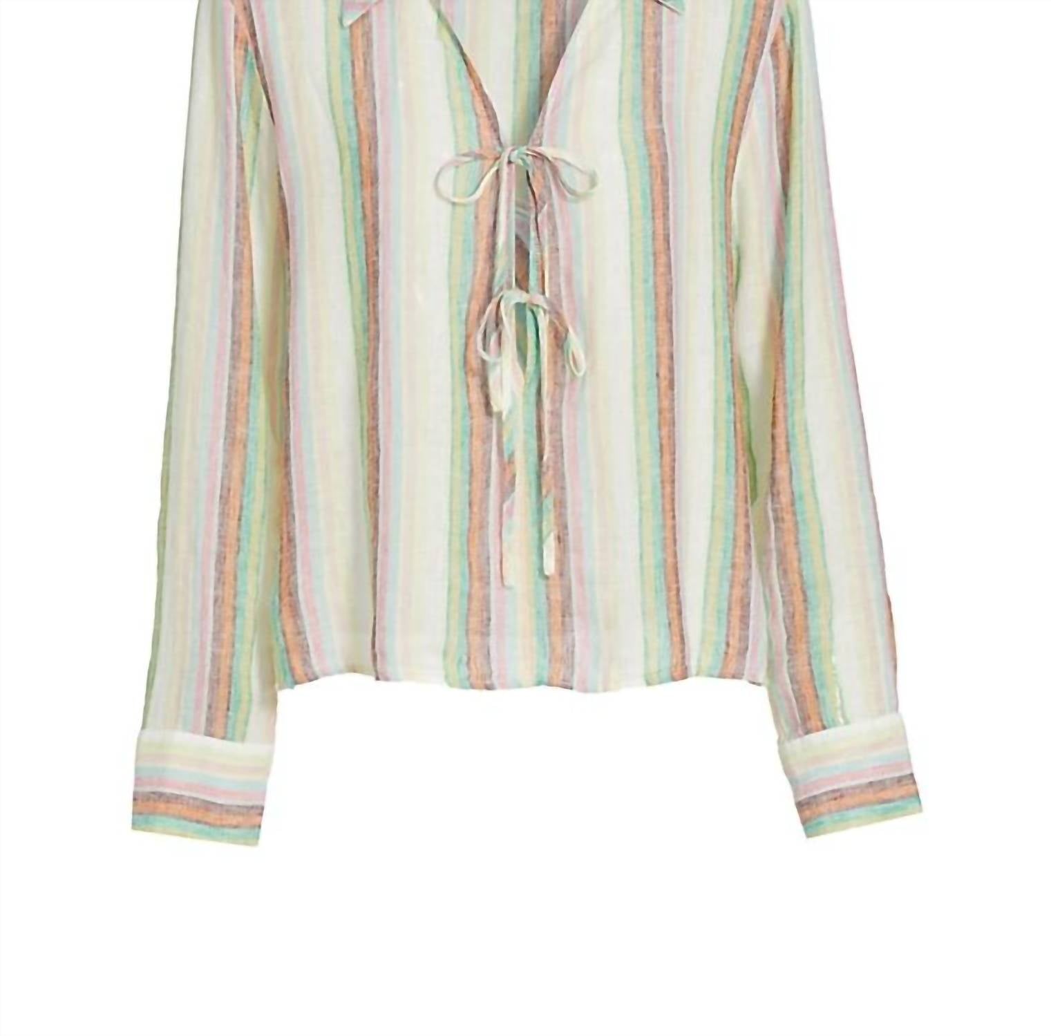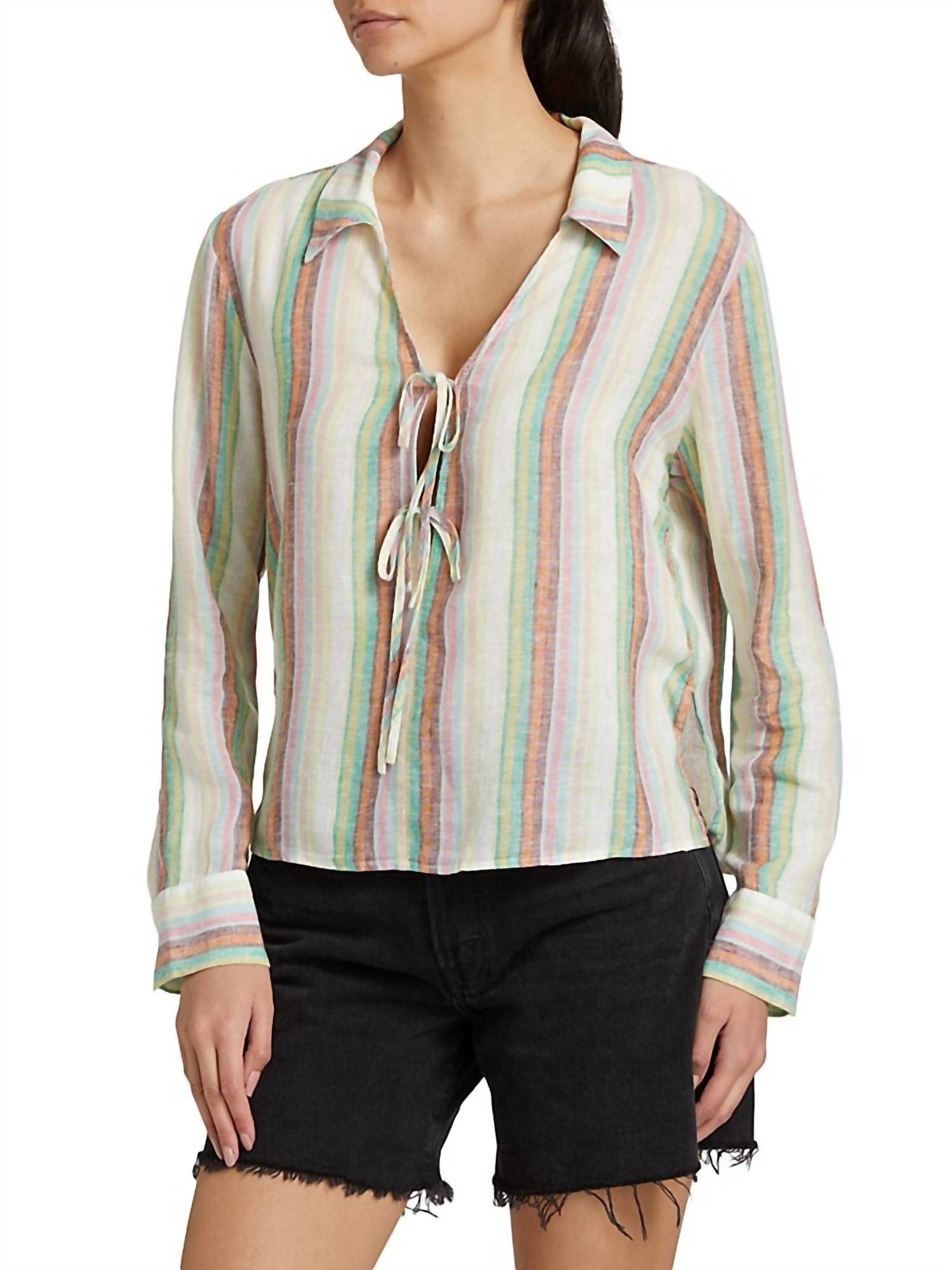 Pair this with your favorite jeans and slides for your next girls night out. Embrace effortless style with the ELM TOP by Rails, a chic addition to any wardrobe. This women's blouse features long sleeves with button cuffs and a spread collar, crafted from a lightweight linen blend (55% Linen, 45% Viscose) for ultimate comfort. The Palais Stripe pattern adds a touch of elegance, while the front tie closure ensures a perfect fit. With a length of about 23" from shoulder to hem, it offers a versatile silhouette, making it a sophisticated choice for any occasion. For care, hand wash is recommended.