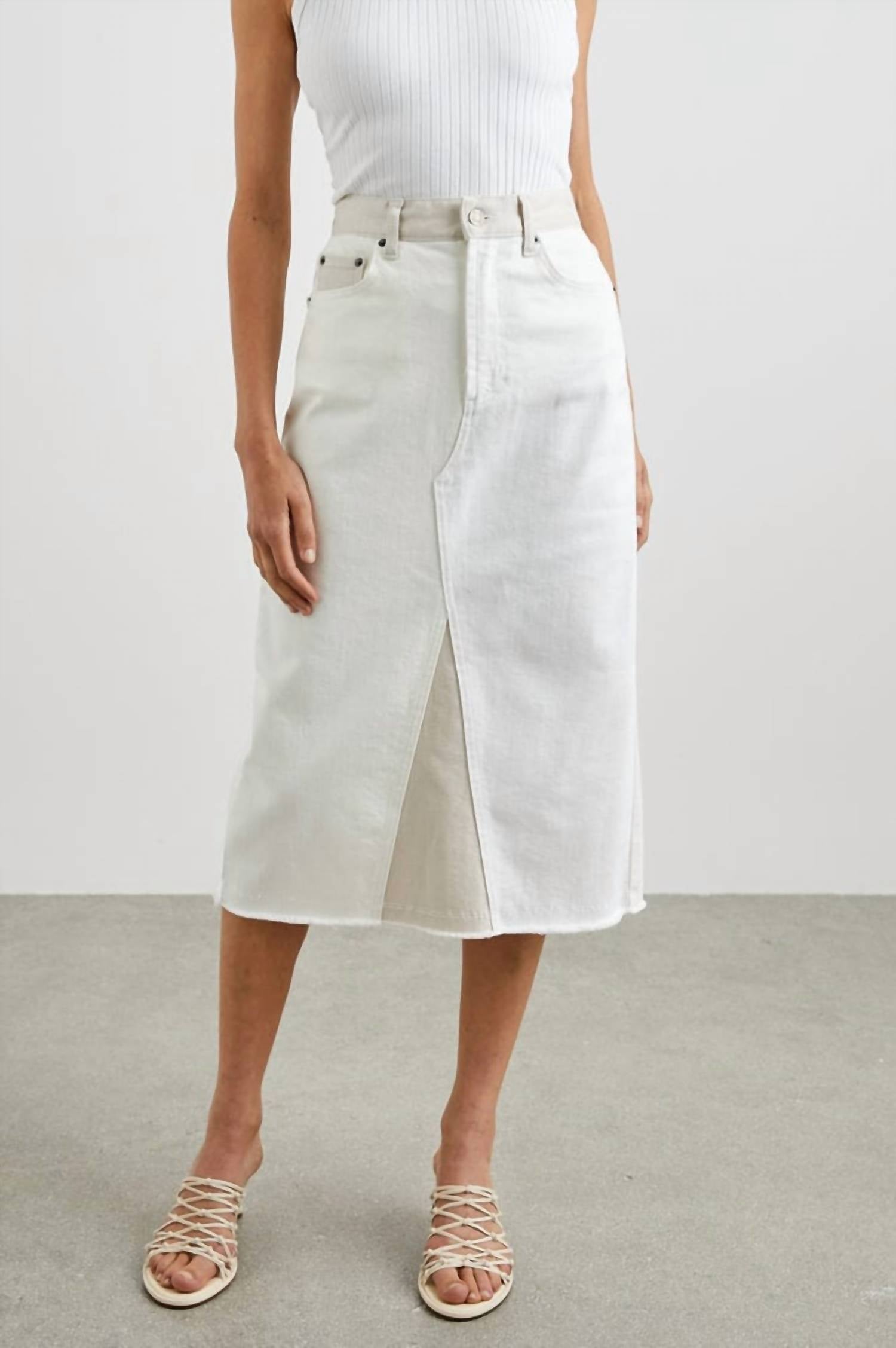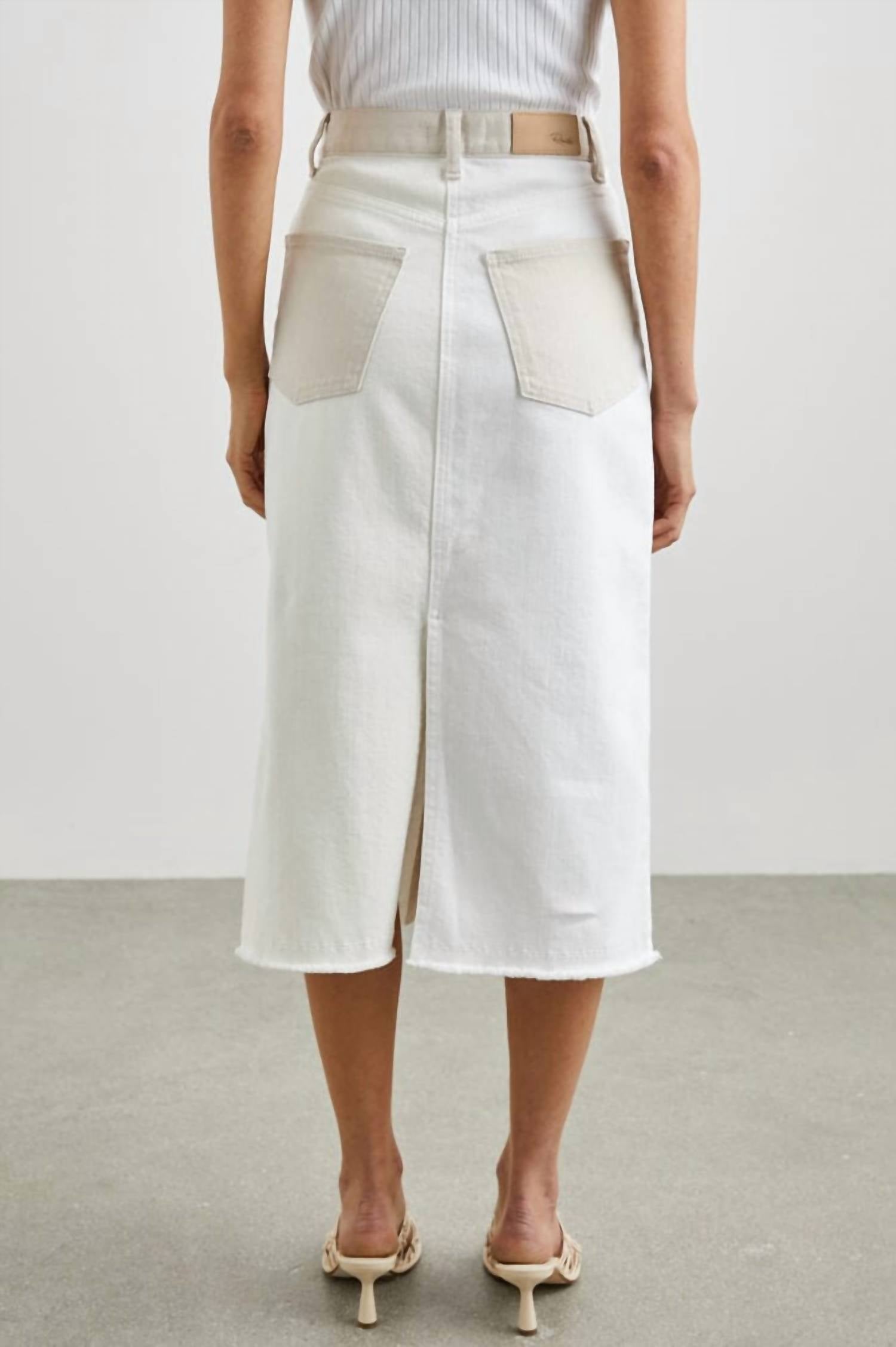 Tuck in your favorite tee for a more casual yet feminine look. Discover the Highland Skirt by Rails, an elegant high-waisted midi piece crafted with precision in Ecru Patchwork. This skirt features a zipper fly, button closure, and a back vent, emphasizing both style and functionality. Made from a comfortable stretch fabric comprising 98% Cotton and 2% Elastane, it promises a flattering fit. Care for it by hand washing and line drying to maintain its pristine condition.