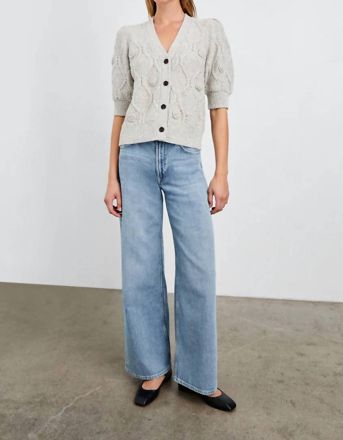 Introducing the Isla Cardigan by Rails, a sophisticated short sleeve piece in grey, charmingly adorned with crochet daisies. This cardigan features an argyle texture with elegant braided buttons, crafted from a warm cotton-wool blend. Composition: 60% Cotton, 30% Nylon, 10% Wool. Closure: Button closure.