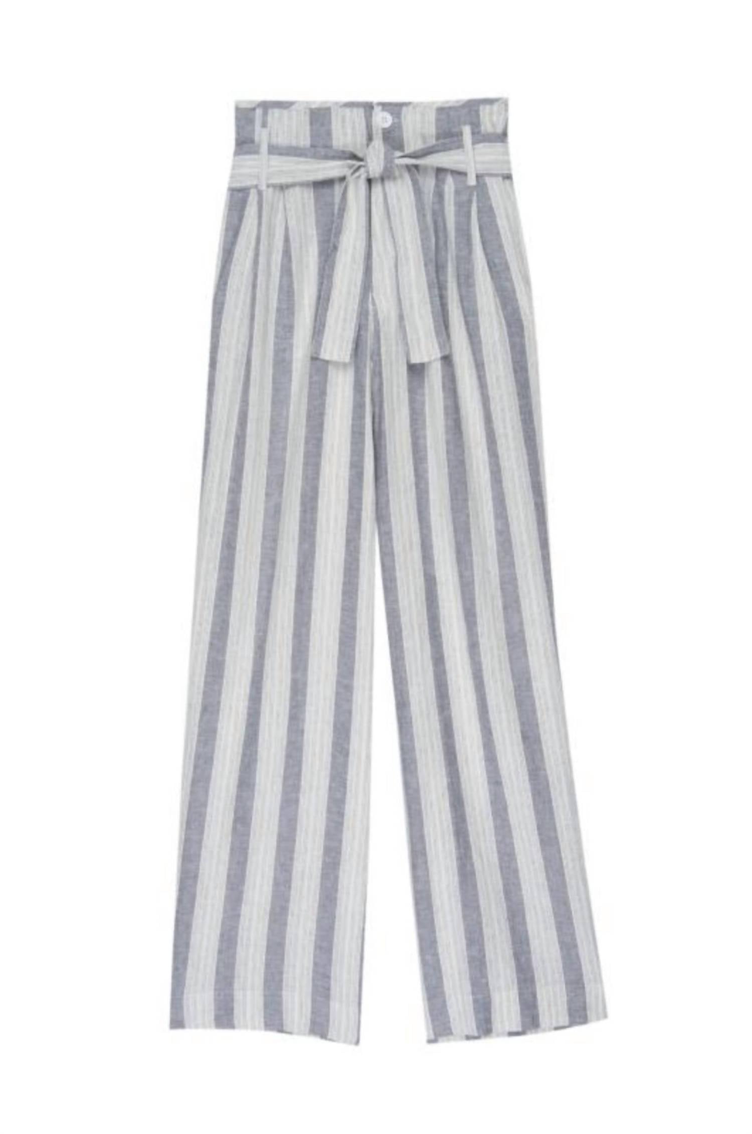 These mid-rise, wide-leg pants are crafted from a lightweight striped linen blend of 55% linen and 45% rayon. Featuring a button fly closure and a self-tie removable belt, they offer a versatile fit that can be adjusted for a personalized look. The minimal fabric at the waist ensures a flatter and more flattering fit. For care, hand wash only. True to size, with an outseam of 42 inches and an inseam length of 28.5 inches, measured from a size Small.