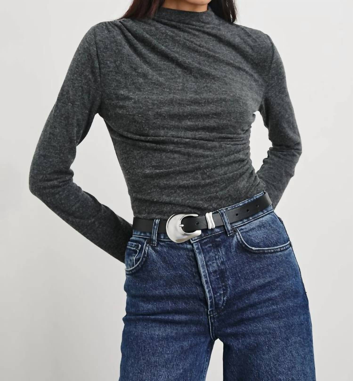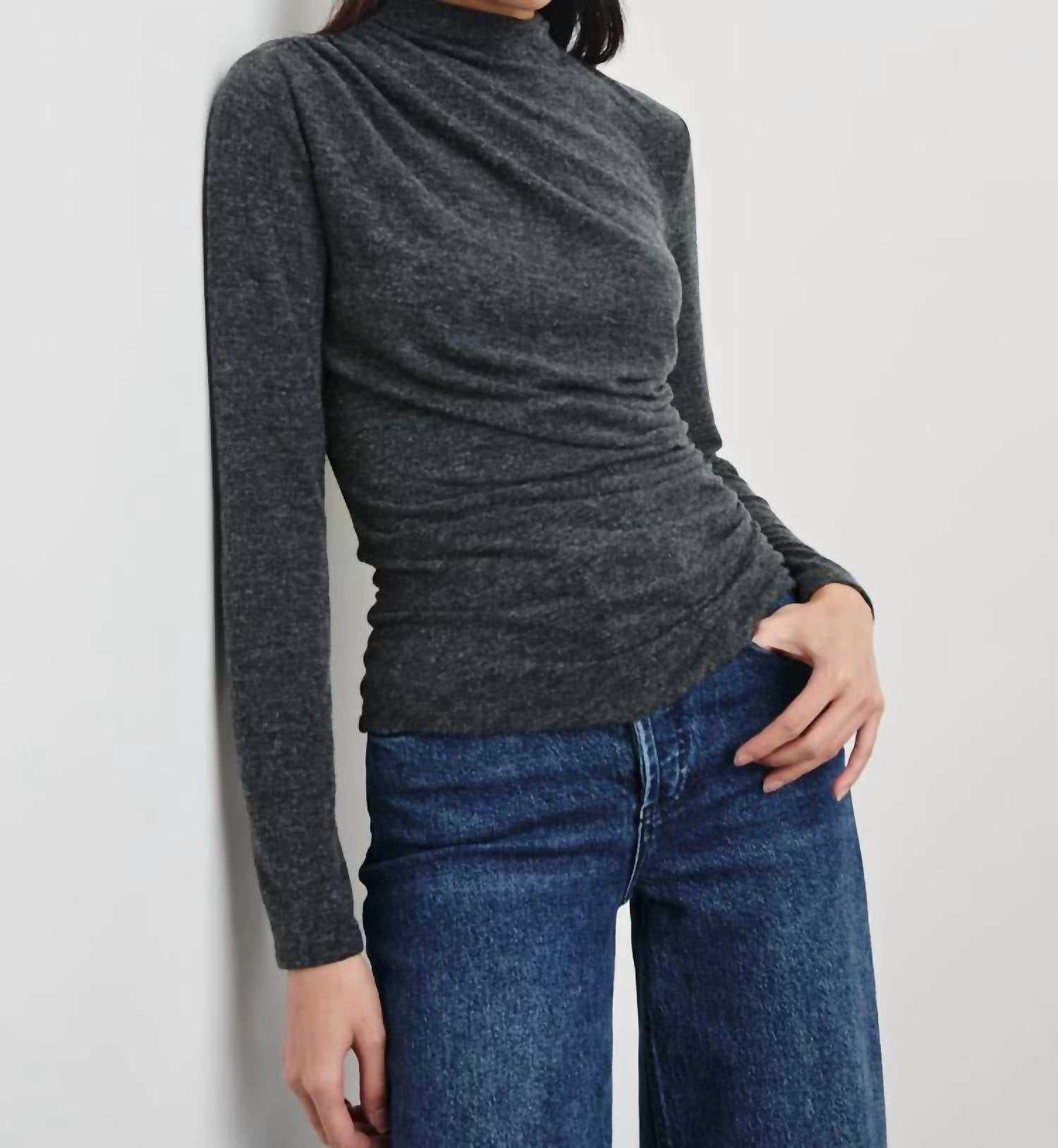 Layer under your favorite sweater or wear tucked into jeans for a perfectly polished winter look. Elevate your wardrobe with the Joelle Sweater by Rails, a chic addition in charcoal designed for contemporary style. This long sleeve sweater is crafted from a soft gauge jersey blend of 83.5% Polyester, 12.5% Rayon, and 4% Spandex, featuring an asymmetrical mock neck with shirring details. Imported and measuring 22 inches in length (measurements from size S), it offers a flattering and versatile fit. Closure: Pull-on. Care: Hand wash and lay flat to dry.