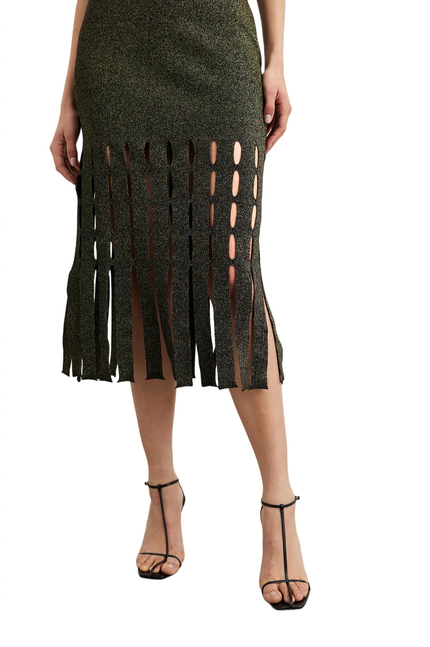 Just add slides or mules and you are good to go. This midi dress features a body-hugging fit with unique cutouts that drape elegantly over the legs. High V neckline. Sleeveless. It is true to size, made from 100% Lurex, and measures 49" in length (from Small). Dry clean only. Imported.