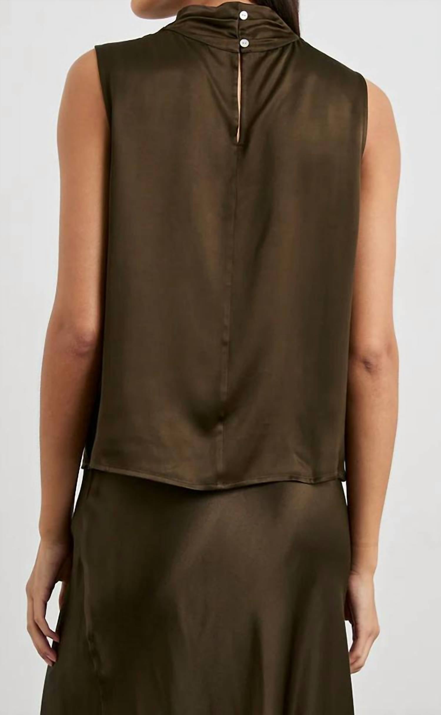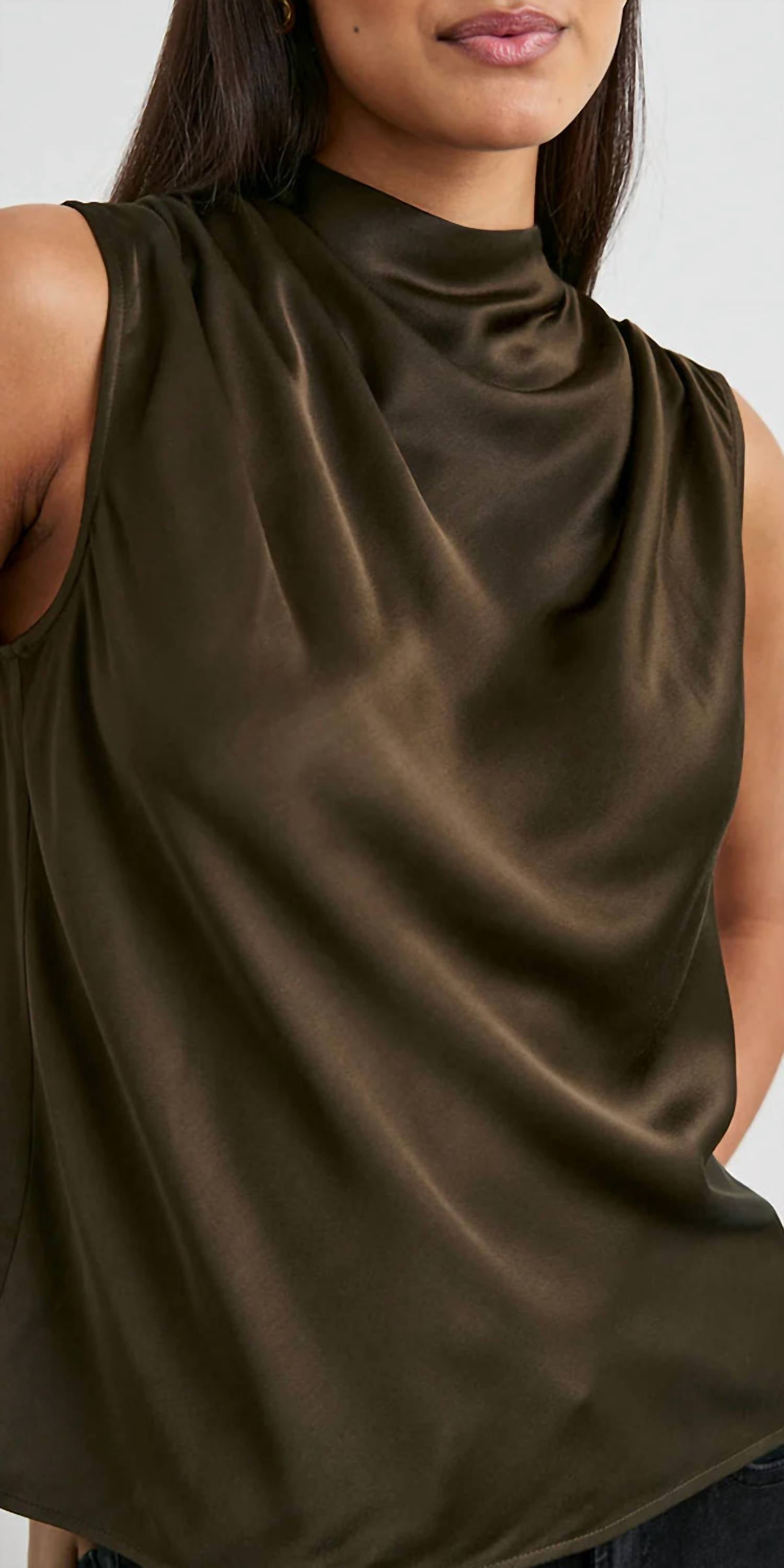 Pair this with your favorite jeans and slides for your next girls night out. The Kaleen Top by Rails is a sophisticated sleeveless piece in an elegant dark moss hue, perfect for an evening event. Expertly crafted from 55% Rayon and 45% Viscose satin back crepe, it features a draped mock neck and a fluid silhouette with a traditional camisole fit. Made with a solid pattern and a button closure, it brings a touch of quiet luxury to your spring wardrobe. Origin: Imported.
