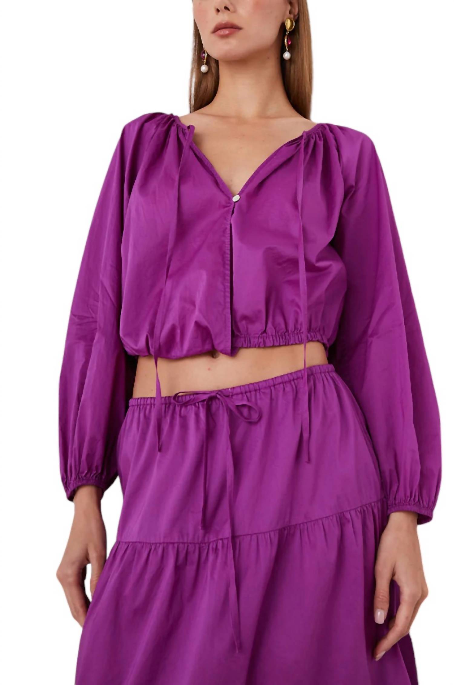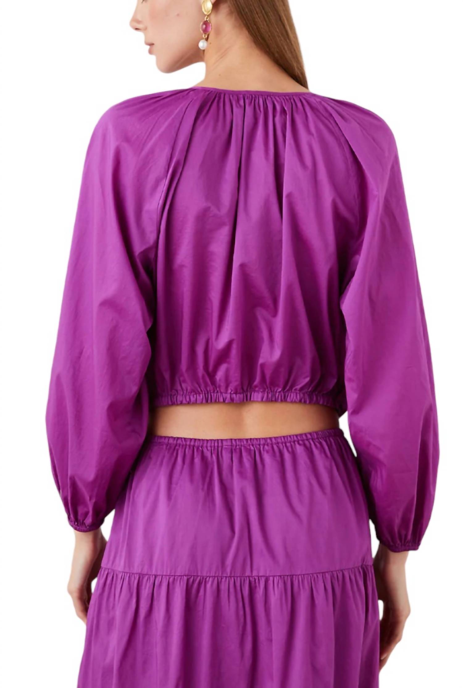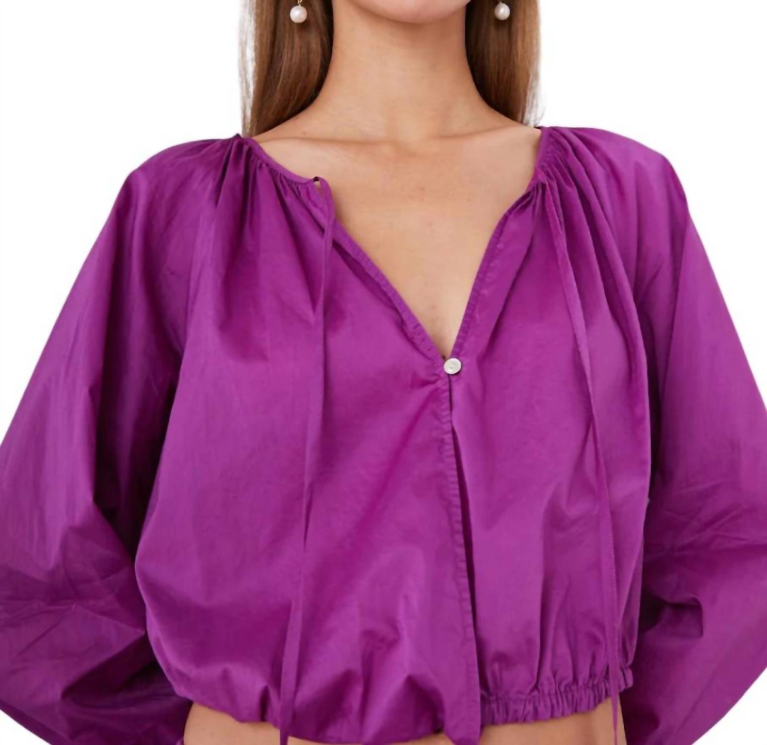 The perfect long sleeve tee that goes with just about anything.The Katia Top features a billowy shape, midriff hem, and soft shirring details. It has a plunging neckline with a tie for adjustable coverage and a crossover detail from the V-neck to the hem for added dimension. Made from ultra-lightweight 100% cotton in a berry color. Recommended to order true to size. Front body length: Right 17 3/4", Left 17 1/4" (measured from size Small). Model is wearing size S. Hand wash cold.