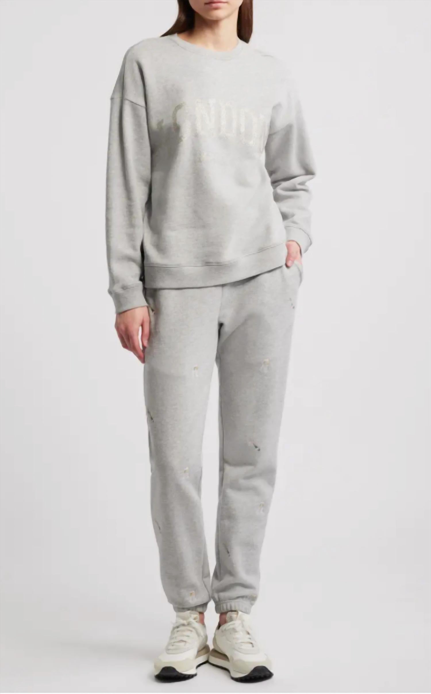 The perfect pant for running around town and looking cool while doing it. Elevate your loungewear with the Kingston High-Rise Jogger by Rails, crafted from 100% cotton in a versatile grey hue. This jogger offers an adjustable fit with its elastic waist and cuffed leg style, enhanced by a drawcord closure and delicate champagne embroidery.