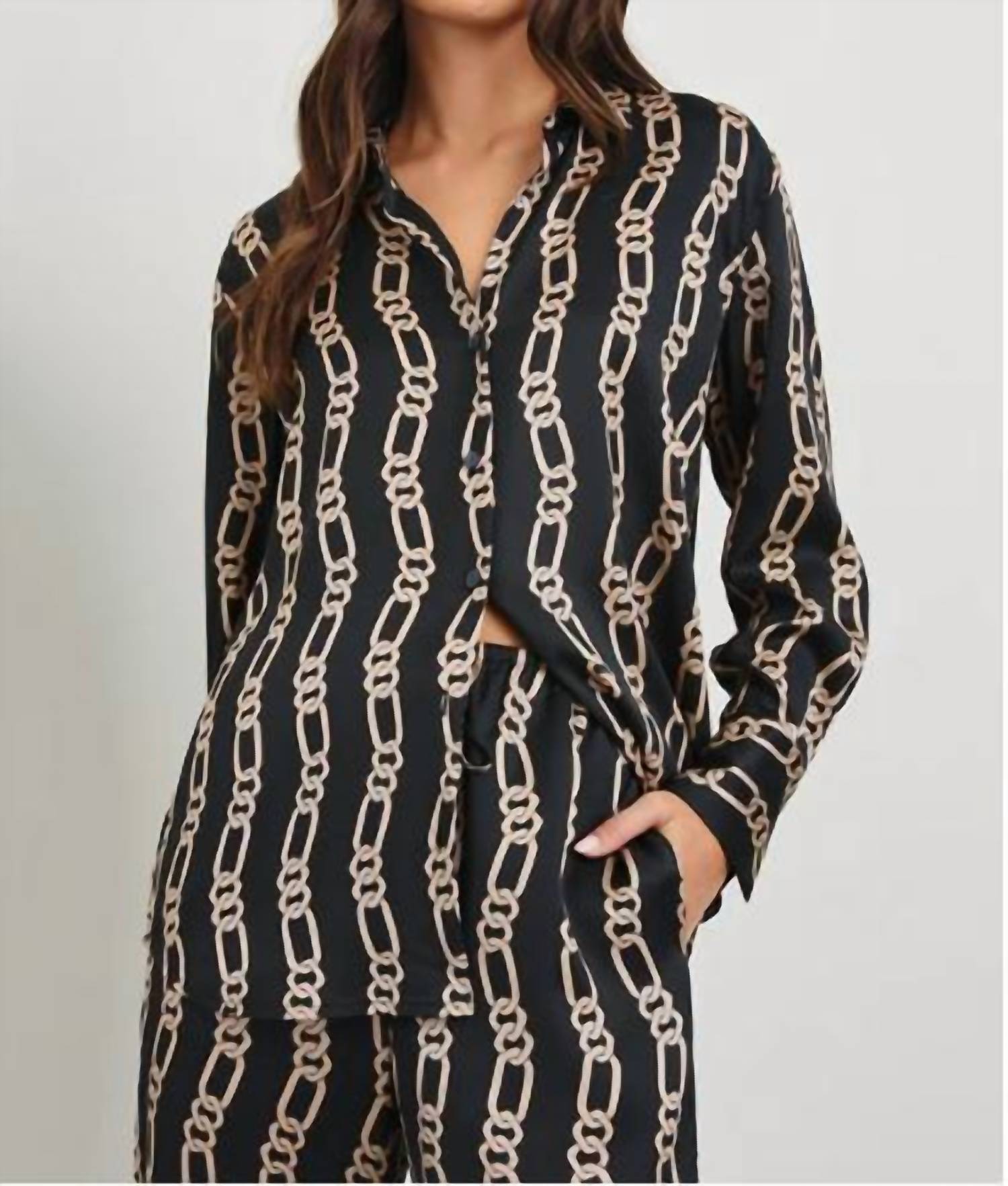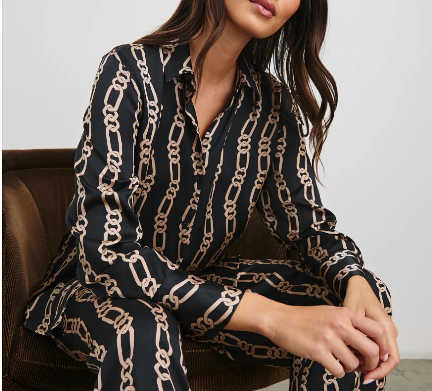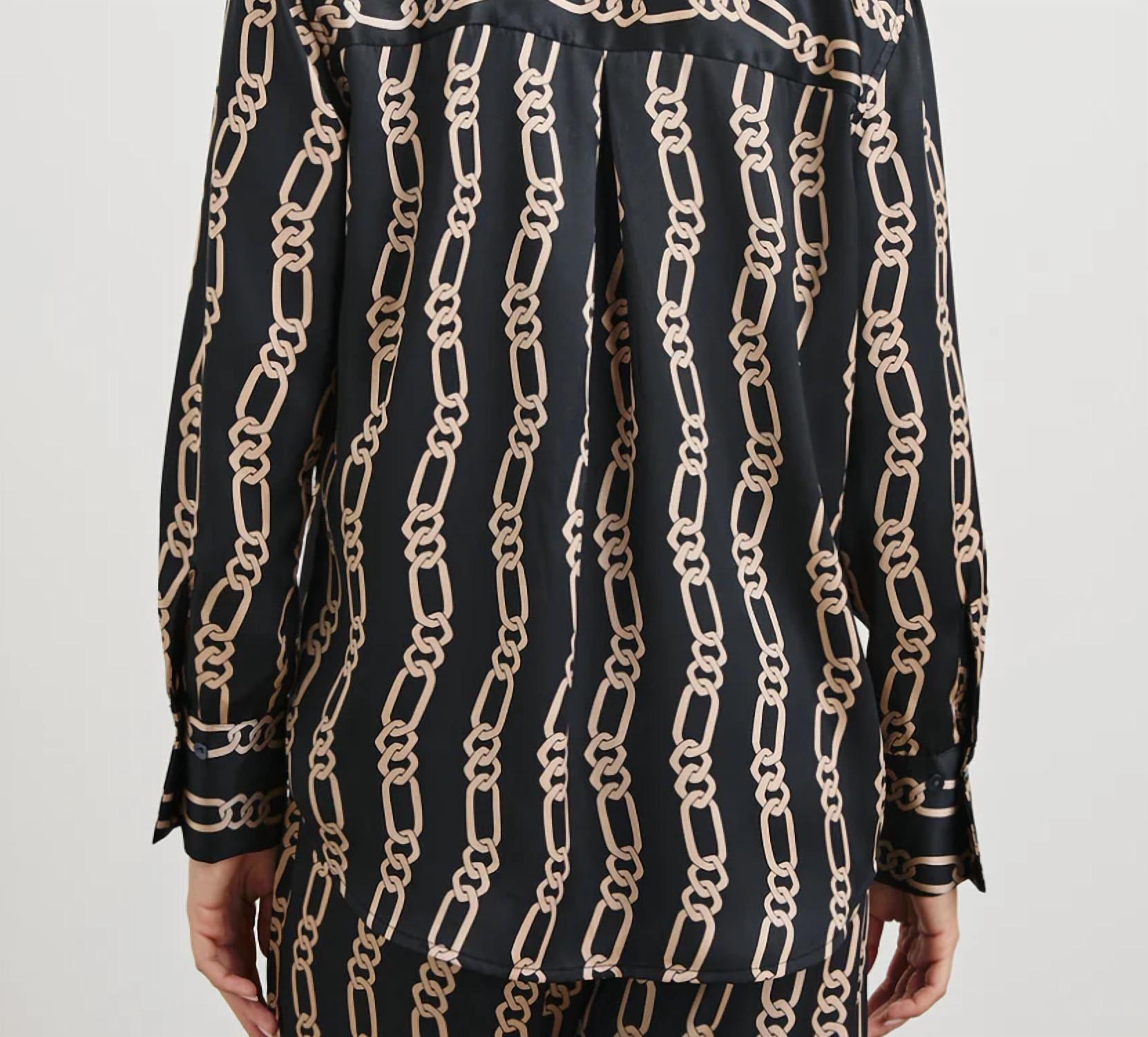 Crafted in shiny twill, this soft and sleek button-down features a relaxed body in a statement-making chain-link print. Tuck in, layer over a tank, or pair with the Damani Pant for an instant outfit.