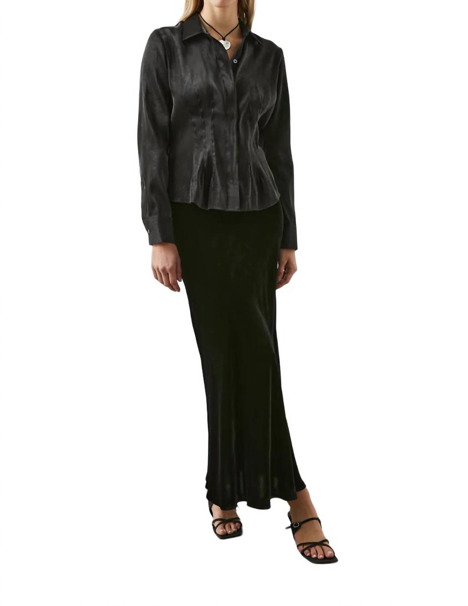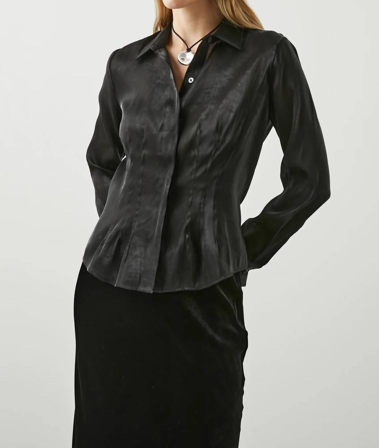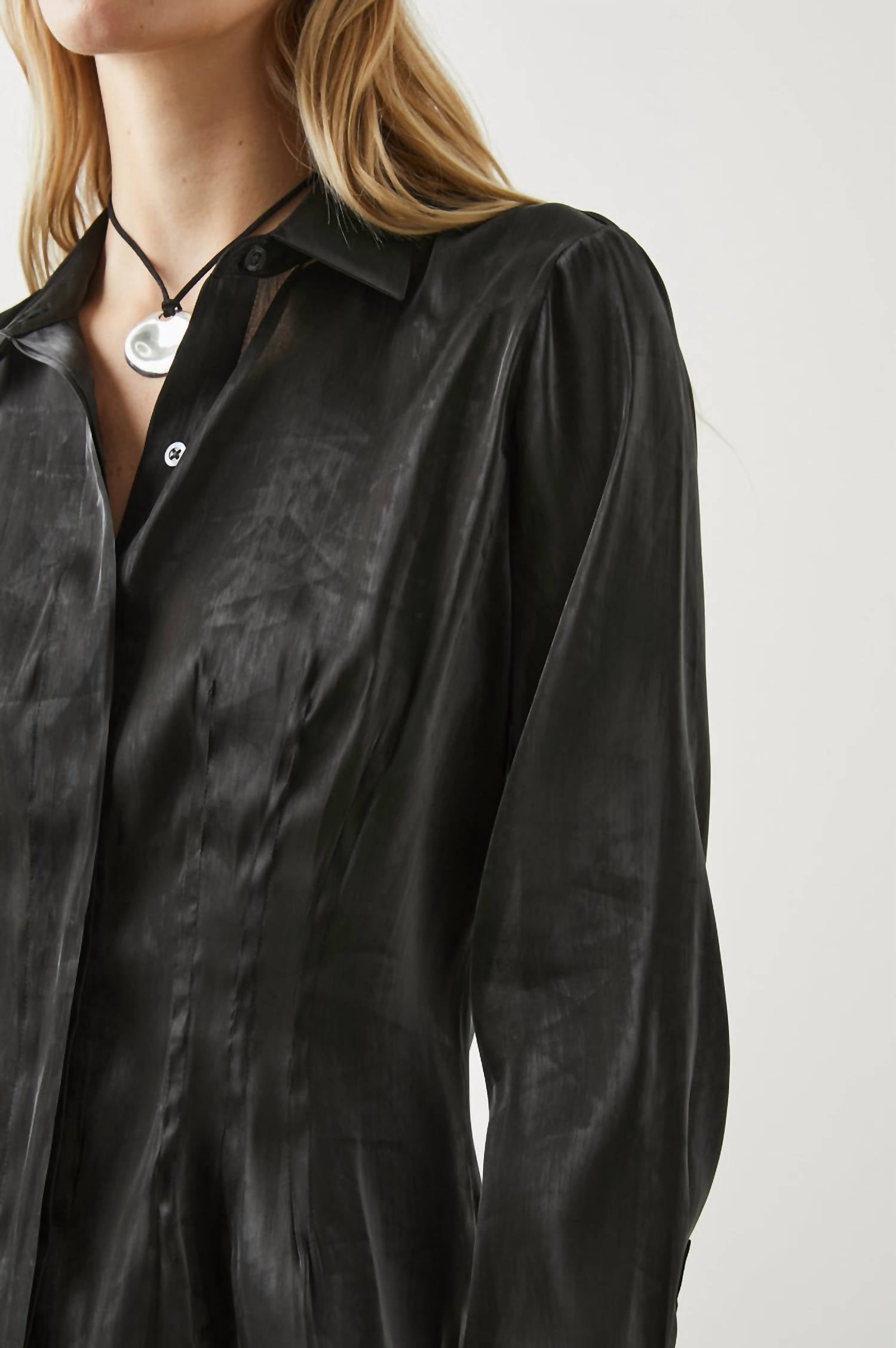 A classic button down shirt that will never go out of style.This top features flattering darting details across the front and back. Made from soft, high-quality organza, it has long sleeves and a collar. 100% Polyester. Imported. Recommend ordering true to size. Front body length: 22 1/4" (measured from Small). Dry clean only.