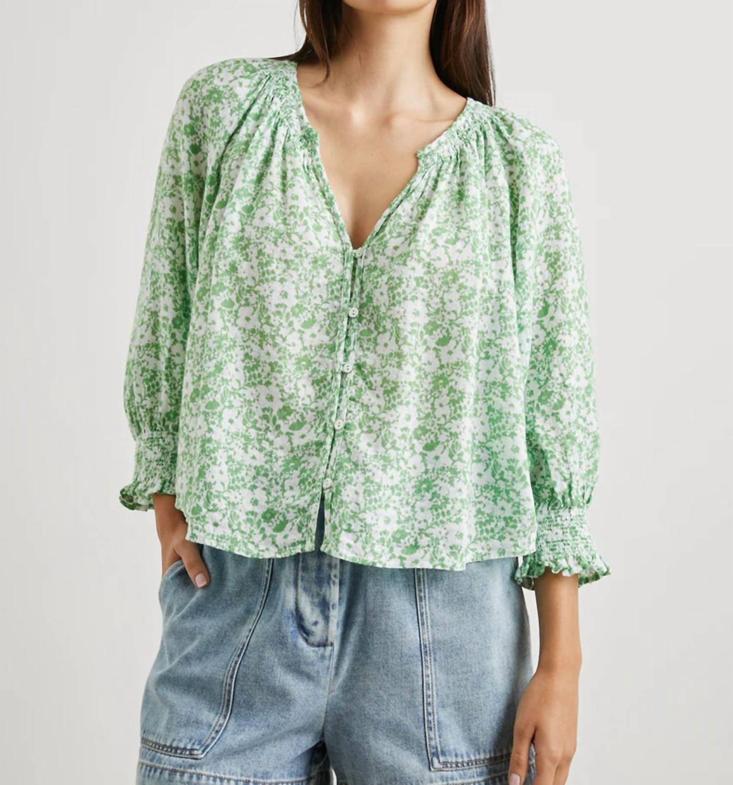 Discover the Mariah Top by Rails, a beautifully crafted piece in a green texture floral pattern that adds charm to any outfit. This long sleeve tee features a comfortable pull-on closure and elegant natural shell buttons for a touch of sophistication. Made from a soft linen blend composed of 55% Linen and 45% Rayon, it offers a relaxed fit with elastic smocked detailing at the cuffs. For care, simply hand wash and line dry.