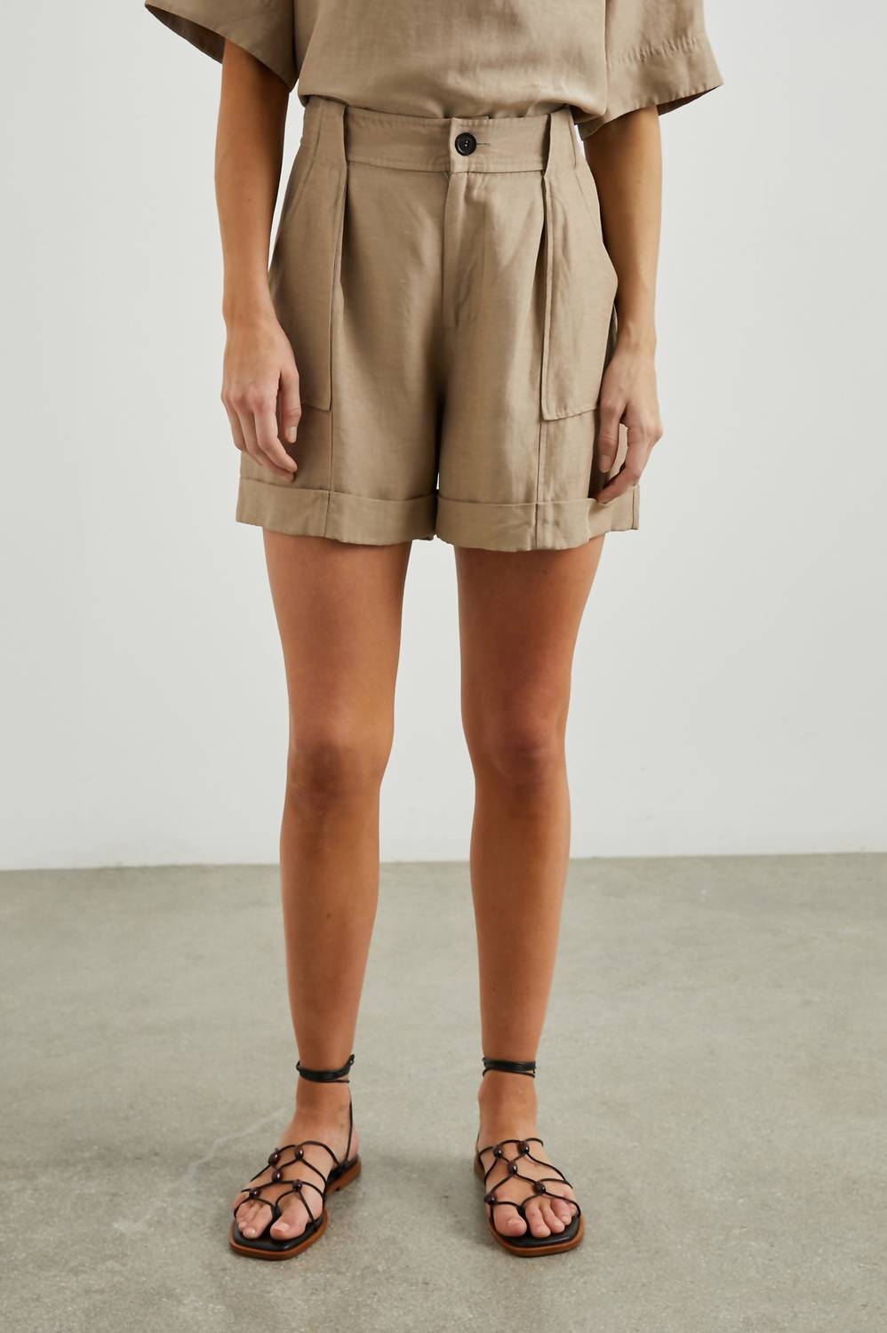 Elevate your wardrobe with the Maryam Short by Rails, perfect for travel and springtime occasions. Designed in a sophisticated safari color, these high-waist shorts feature a luxurious blend of 60% Viscose and 40% Linen. With refined detailing around the pockets and chic faux horn blond buttons for a secure button closure, these shorts pair effortlessly with a tucked cami or the Juniper top for a complete set. Inseam measures 4.5 inches with a front rise of 11 7/8 inches. Care: Dry clean only.