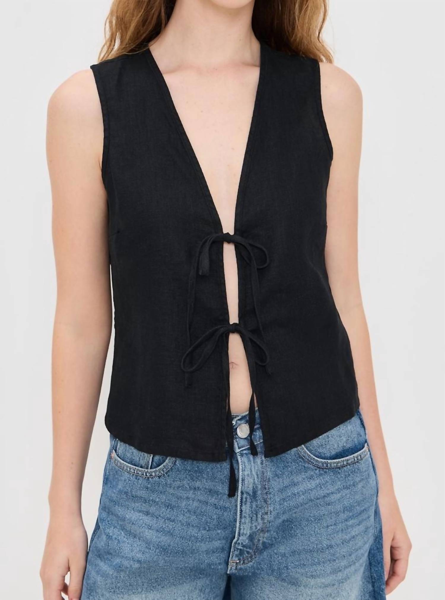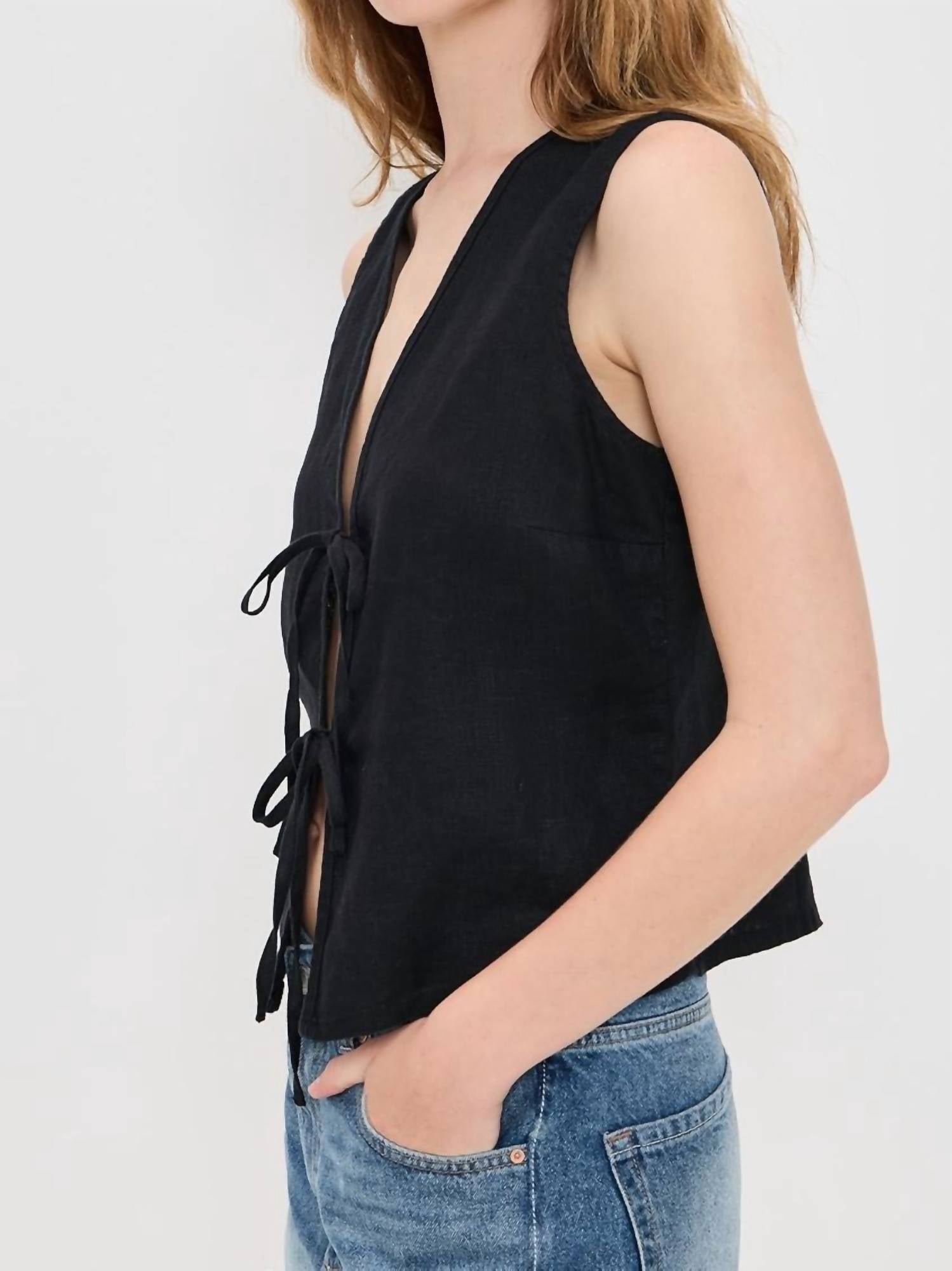 This classic tank top is perfect for layering and cute enough to wear on its own. Elevate your vacation wardrobe with the Oregon Linen Top by Rails, a chic piece in timeless black. This sleeveless, cropped top showcases a V-neckline and an eye-catching tie closure at the front for a touch of elegance. Crafted from 100% luxurious heavyweight linen, it offers a lightweight, non-stretch linen weave. Originating from Vietnam, this top requires dry cleaning to maintain its pristine look.