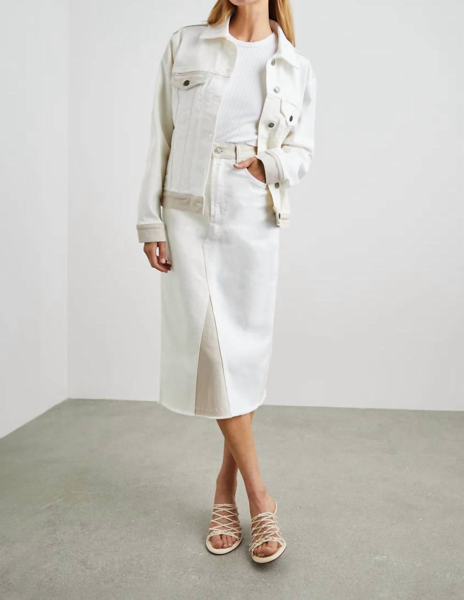 Show off just the right amount of skin in this beautifuly designed midi length skirt. High-waisted midi skirt in a sophisticated ecru hue, perfect for a fresh spring look. Crafted with a 98% cotton and 2% elastane composition. Features a convenient button closure and a stylish back vent, boasting a skirt length of 29.5 inches measured from size 27. Made with a comfort stretch fabrication. Designed to fit true to size. Care for it easily with machine wash cold, tumble dry low, and warm iron instructions, avoiding dry cleaning to maintain its patchwork charm.