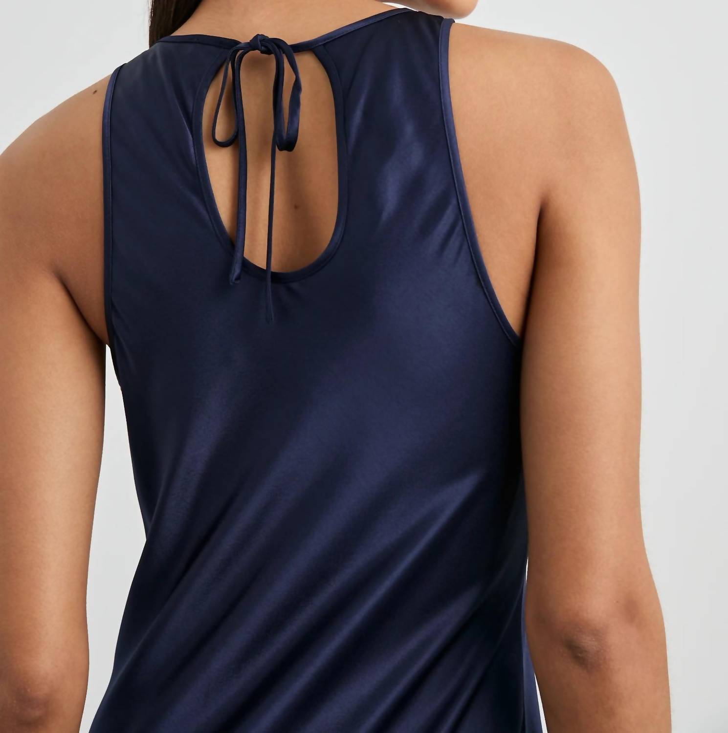 A midi dress so versatile, your options for wearing it are endless. Discover the Solene Dress by Rails, an embodiment of understated elegance in a rich navy hue. Crafted from a blend of 55% Rayon and 45% Viscose, this sleeveless midi dress boasts a lightweight satin crepe with a unique lustrous look. The sheath silhouette is perfect for warm days, featuring an adjustable tie closure at the back. Ideal for those who appreciate fine craftsmanship and comfortable sophistication.