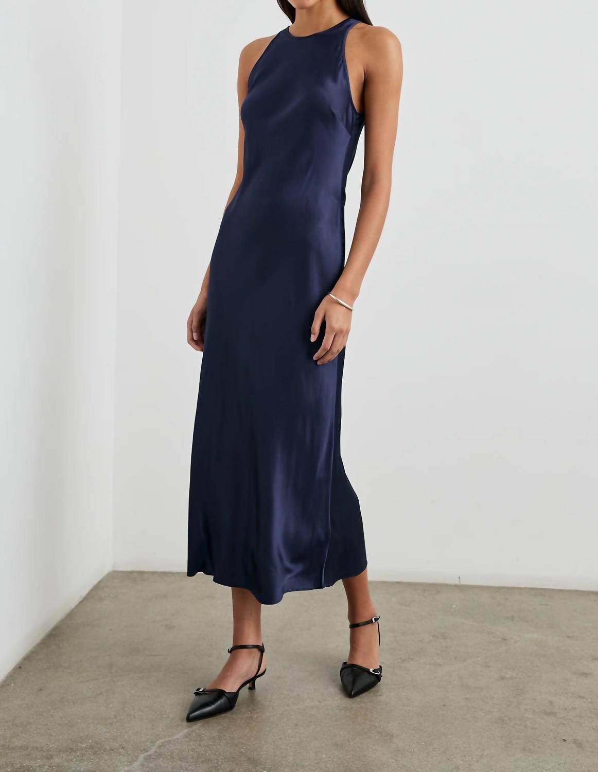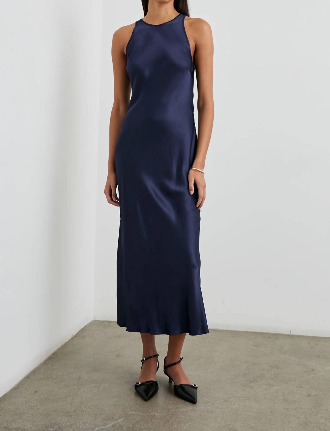 Discover the Solene Dress by Rails, an embodiment of understated elegance in a rich navy hue. Crafted from a blend of 55% Rayon and 45% Viscose, this sleeveless midi dress boasts a lightweight satin crepe with a unique lustrous look. The sheath silhouette is perfect for warm days, featuring an adjustable tie closure at the back. Ideal for those who appreciate fine craftsmanship and comfortable sophistication.