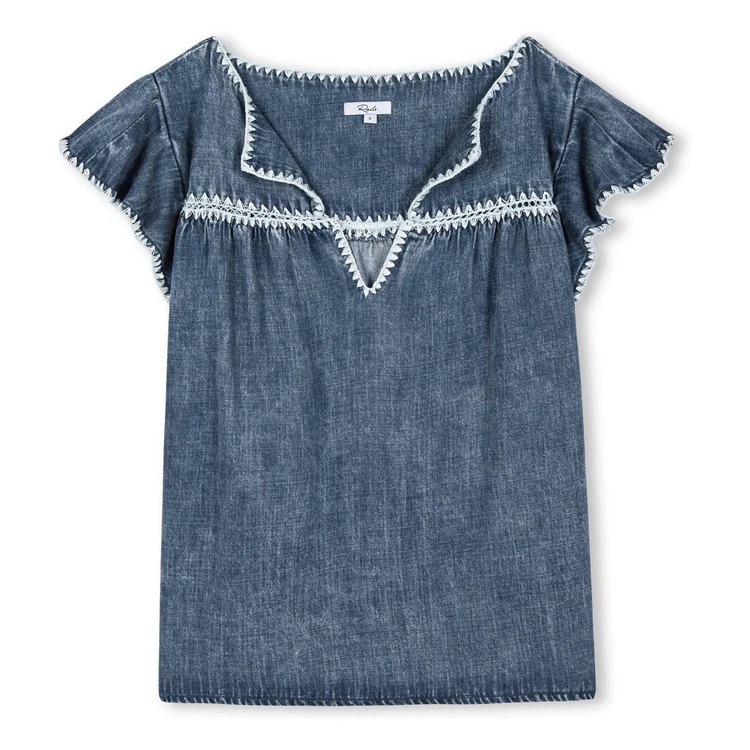 A timeless blouse that will never go out of style. Elevate your spring wardrobe with the Tafia Cap Sleeve Top by Rails, showcasing a chic denim look with a textured blue finish. This blouse features short cap sleeves and a flattering V-neckline with a flowy fit for unparalleled comfort. It boasts contrasting embroidered trim and detailing, adding a touch of elegance to the pullover style. Composition: 75% Tencel™ and 25% Rayon. Care: Hand wash. Crafted for a refined vacation look, this top is perfect for warm weather occasions.