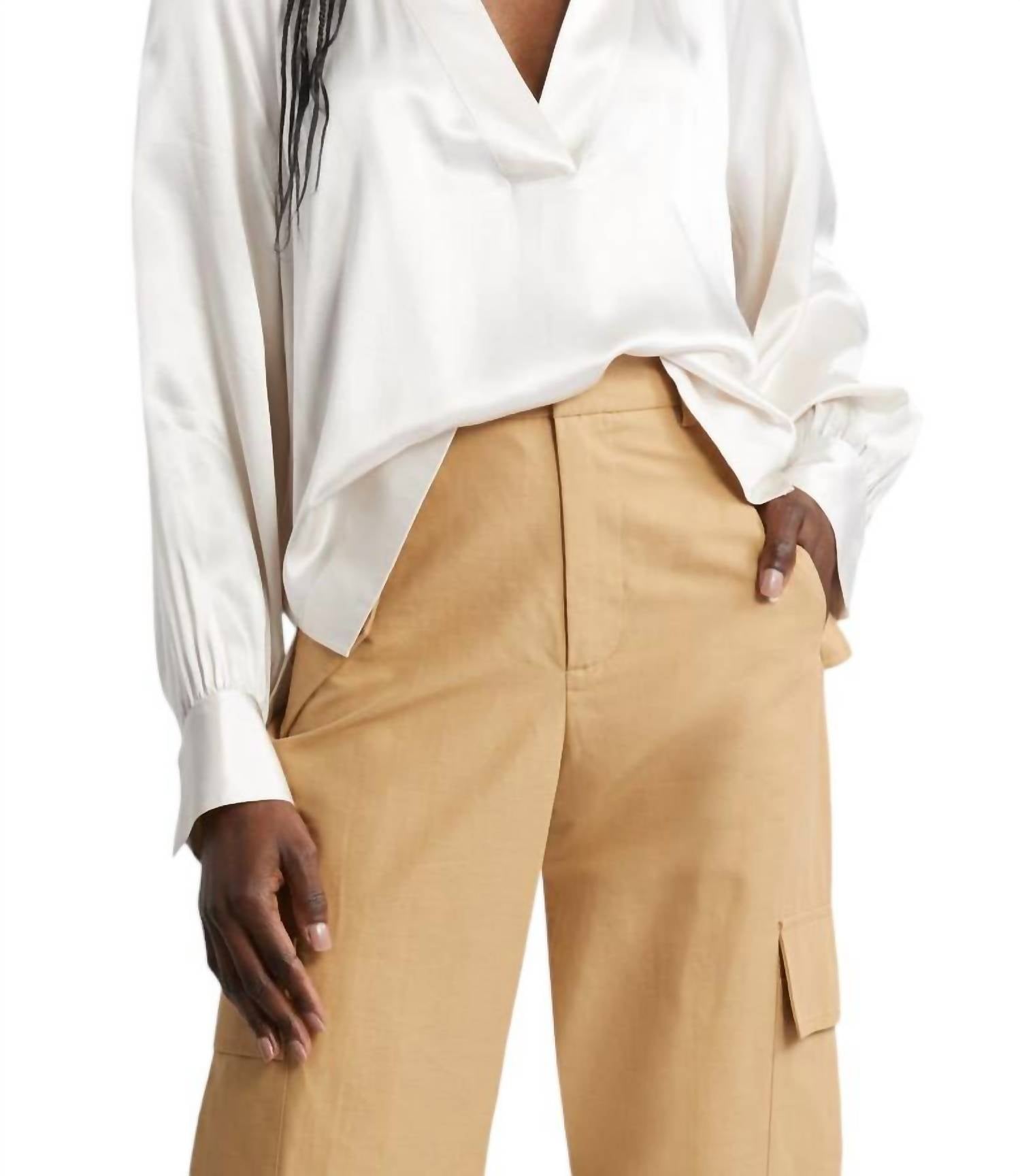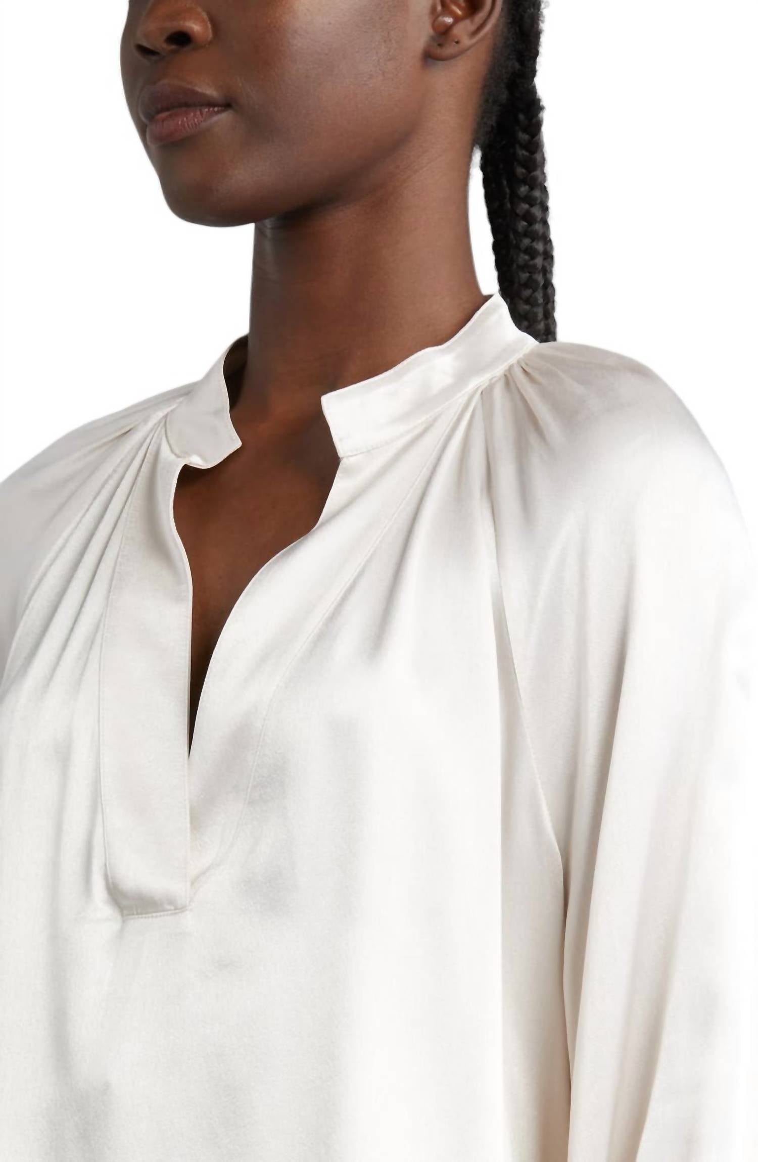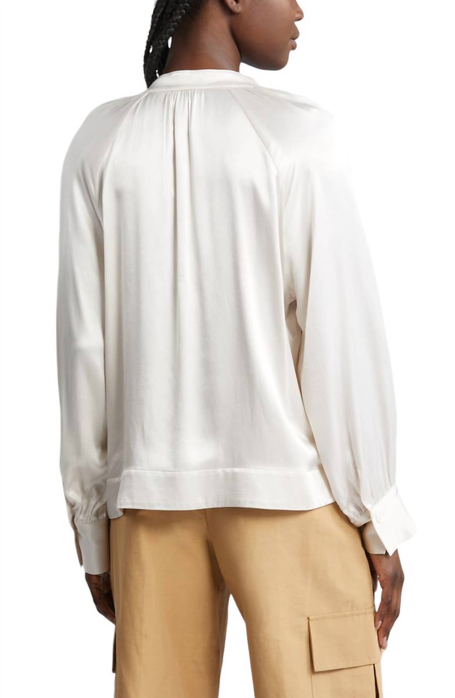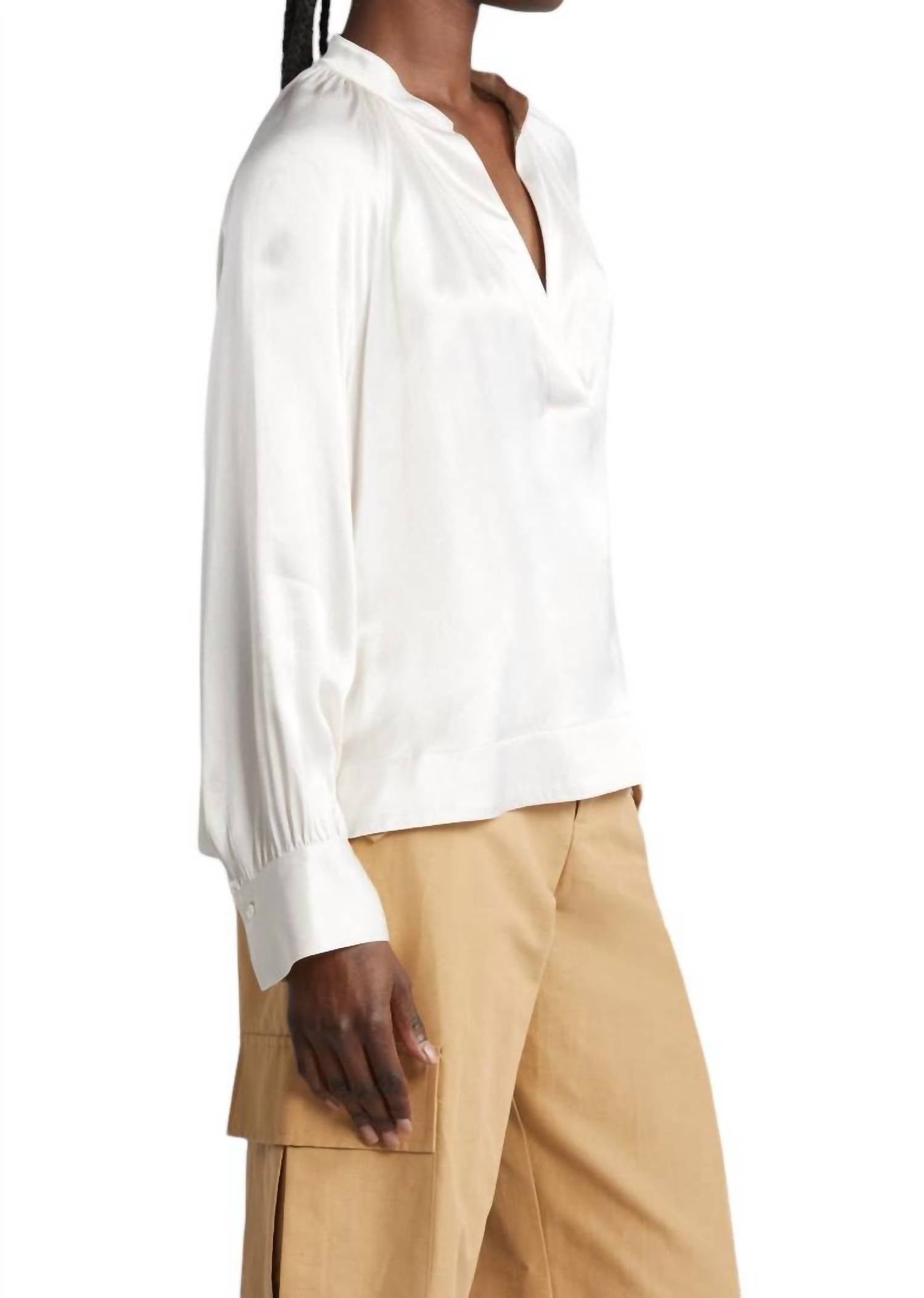 A versatile blouse that works from desk to dinner!This blouse is crafted from matte satin and features raglan sleeves with gentle gathers at the neck. It has a band collar, V-neck, and long sleeves with button cuffs. Made from 55% rayon and 45% viscose, it is dry clean only. True to size with a length of approximately 23 inches (size Medium).