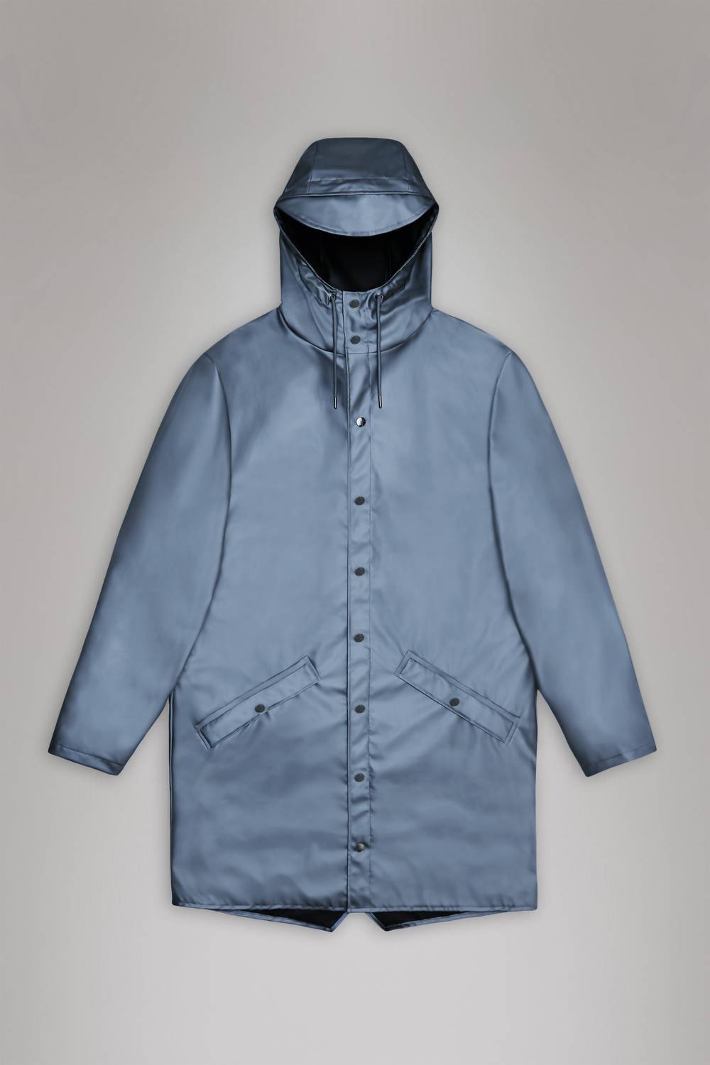 Embrace the rain in style with the Contemporary Long Jacket by Rains, a unisex raincoat that fuses functionality with a minimalist design. It features long sleeves and is made from lightweight, waterproof 100% polyester with a polyurethane coating, complete with ultrasonically welded seams for durability. The jacket offers a 36.02-inch length with a snap closure, adjustable cuffs, a drawstring hood with a cap brim, and double welded slanting flap pockets for practicality. Care is simple: machine wash in cold water at 30°C without fabric softeners.