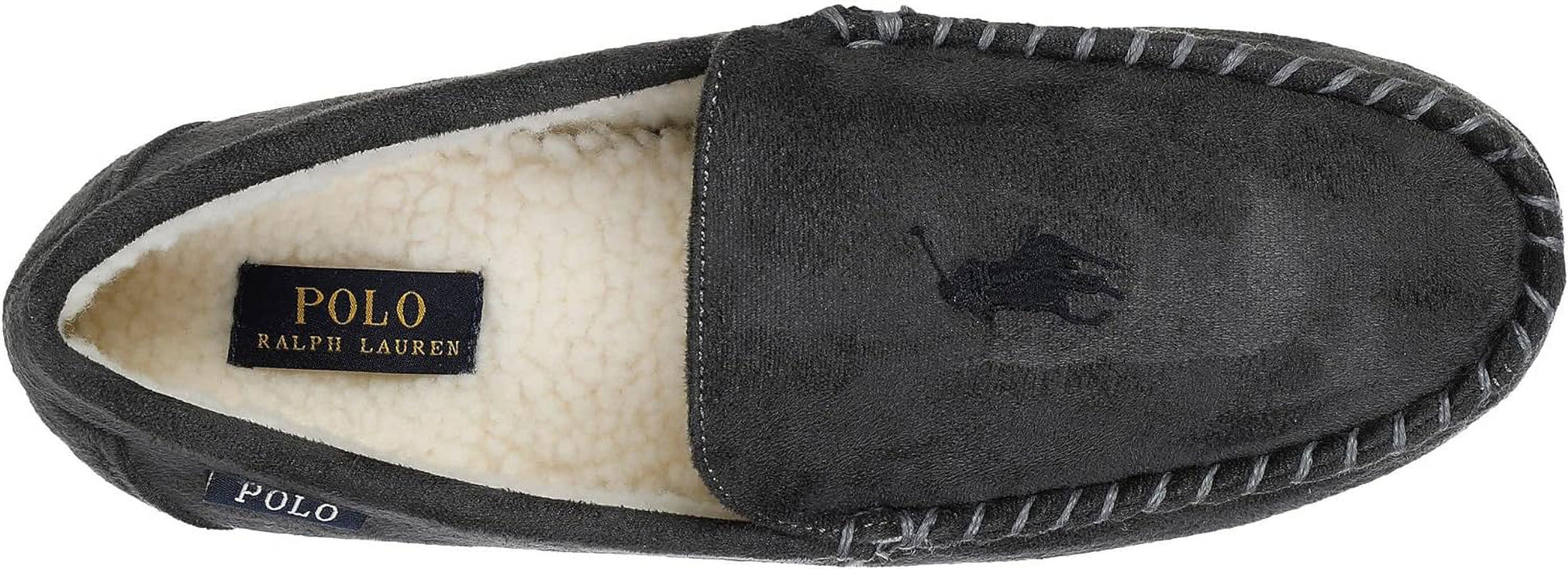 Grey | Lightweight | Soft Inner Lining | Moccasin Style | Durable Sole | Ralph Lauren Branding | Rubber Outsole | Cushioned Footbed | Flat Heel | Slip-On Design | Luxurious Feel | Indoor/Outdoor Usage | Comfort Fit