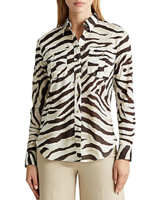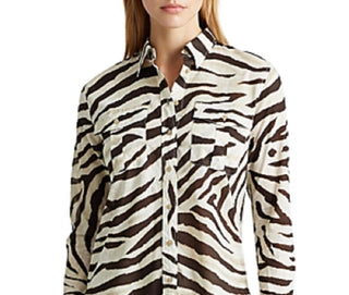 Ralph Lauren Women's Animal Print Long Sleeve Collared Button Up Top Beige/Brown Size Medium