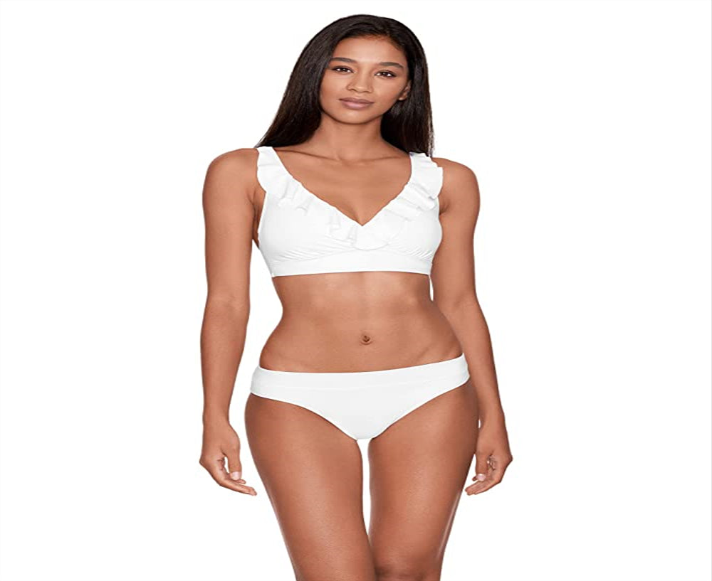 ; The LAUREN Ralph Lauren Beach Club Solid Ruffle Underwire Bra Top features a plunge neckline| playful ruffle applique| adjustable shoulder straps and soft removable cups for desired fit and shape creating a warm weather look everyone will want to duplicate| Secure hook closure strap through the center of the back| 83% nylon| 17% elastane| Hand wash cold