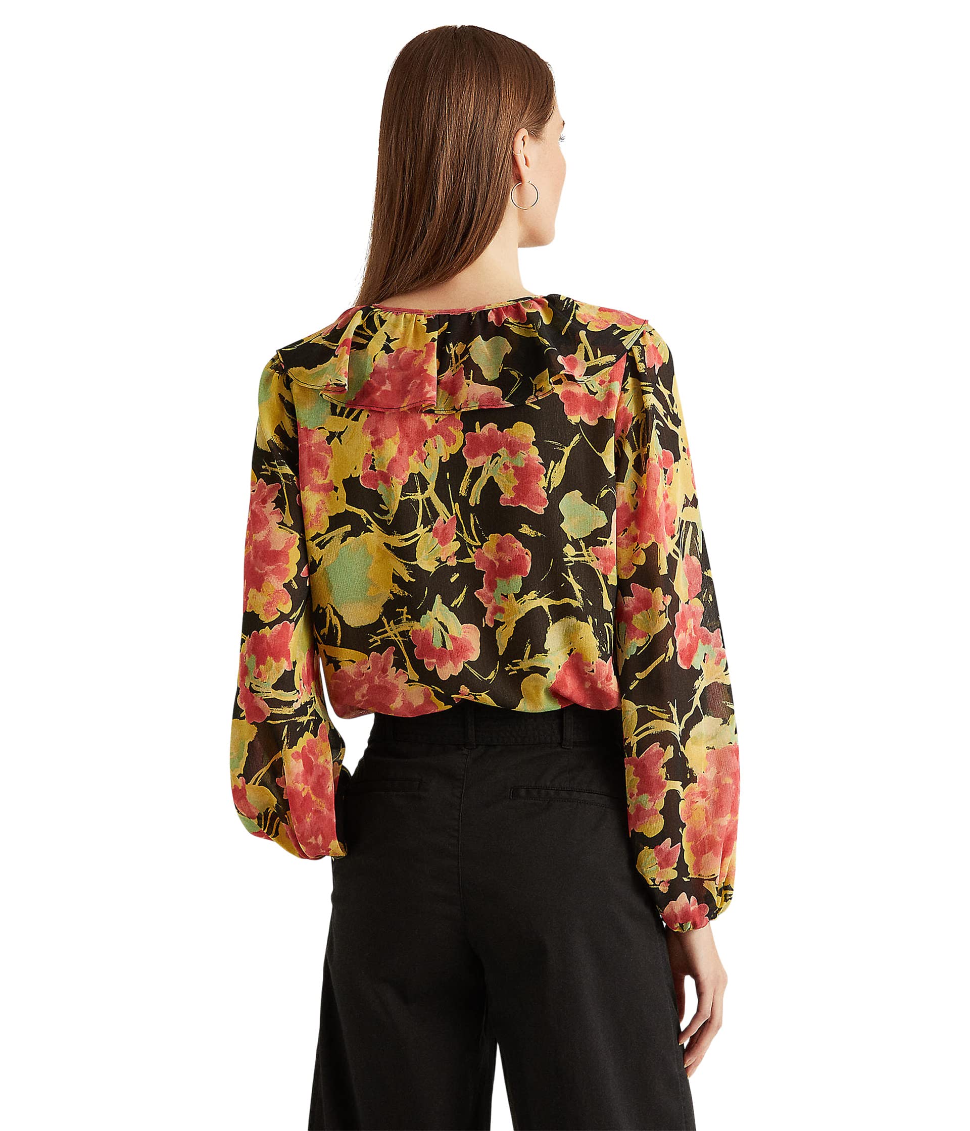 135 Ralph Lauren BLACK MULTI FLORAL CRINKLE WOMEN BLOUSES* Ralph Lauren Women's Size Chart* Distinguished by the season's elegant floral motif| the Ralph Lauren® Floral Crinkle Georgette Blouse is sure to add style to any outfit.* Relaxed fit.* Ruffle-trimV-neckline with a self-tie accent.* Puffed long sleeves with elasticized cuffs.* Intended to hit at the hip.* 100% polyester.* Dry clean.* Imported.