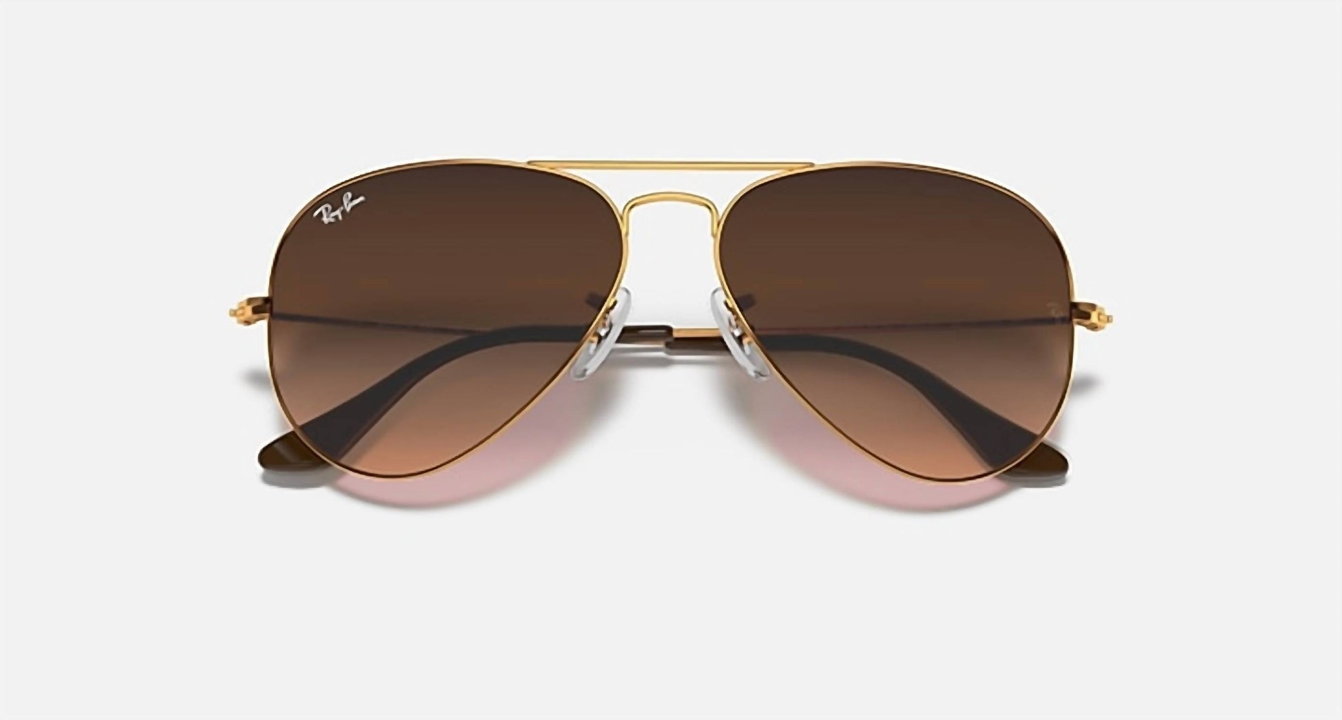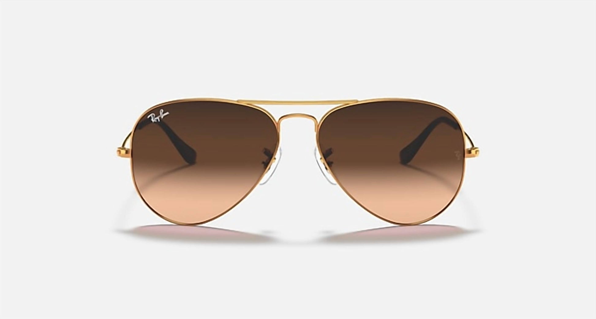 Elevate your eyewear collection with the Aviator Small Non Polarized Sunglasses RB3025 – 9001A5 by Ray-Ban. Crafted from premium metal, these glasses feature a polished light brown frame with matching temples, enhancing their classic aviator shape. The gradient pink/brown lenses add a touch of sophistication and complement the polished light brown hue. Specifications include a narrow to average fit, with measures of 55mm width, 14mm bridge width, lens height of 47.5mm, and temple length of 135mm.