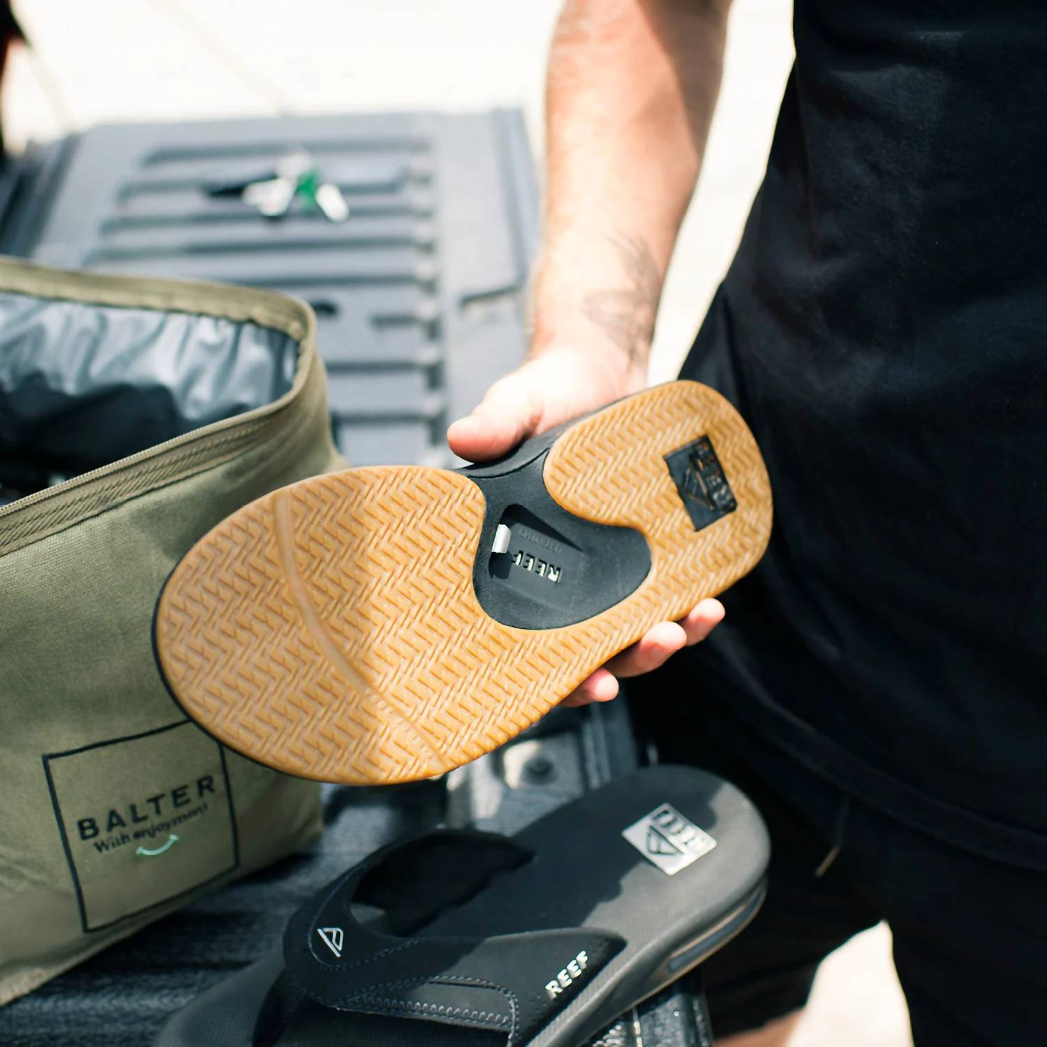 Discover the REEF Fanning Flip-flops with a unique built-in bottle opener, perfect for any beach day or summer adventure. Designed in a tan and navy colorway, these flip-flops feature a synthetic nubuck upper with a comfortable padded jersey liner. The compression molded EVA footbed offers support with a 360-degree heel airbag, while a herringbone rubber outsole ensures durability. With an open toe design and flat heel for a relaxed fit, these medium-width sandals embody the athleisure trend, combining functionality with laid-back style.