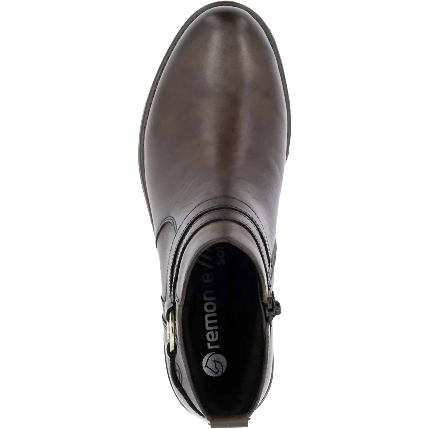 Say hello to the perfect, most versatile boot. The ankle height makes this style easily transition from day to night. Wear them with your favorite skinny jeans and tee for a more laid back look, or pair them with your favorite mini dress and jacket for a night out on the town. Discover the perfect blend of comfort and style with the Women's Arielle Leather Booties by Remonte in a chic nougat hue. These ankle boots feature smooth leather uppers with a convenient side zipper for easy wear, complemented by a unique round decorative element. Enjoy the comfort of a removable padded insole and a supportive polyurethane sole, all atop a low 1.2" block heel. Ideal for the minimalist trend this fall, these booties are versatile enough for a Thanksgiving dinner party, catering to medium foot width with a round toe shape.