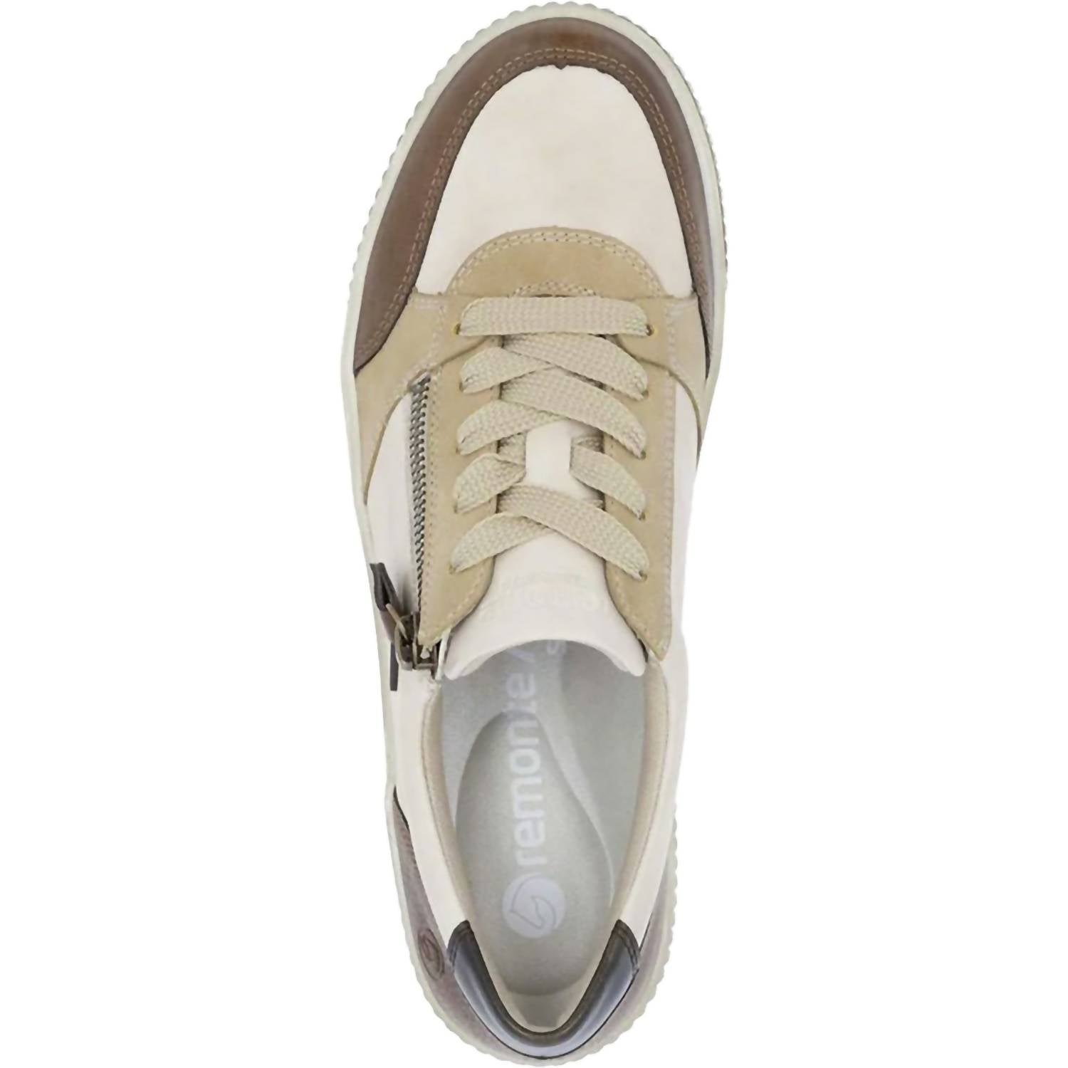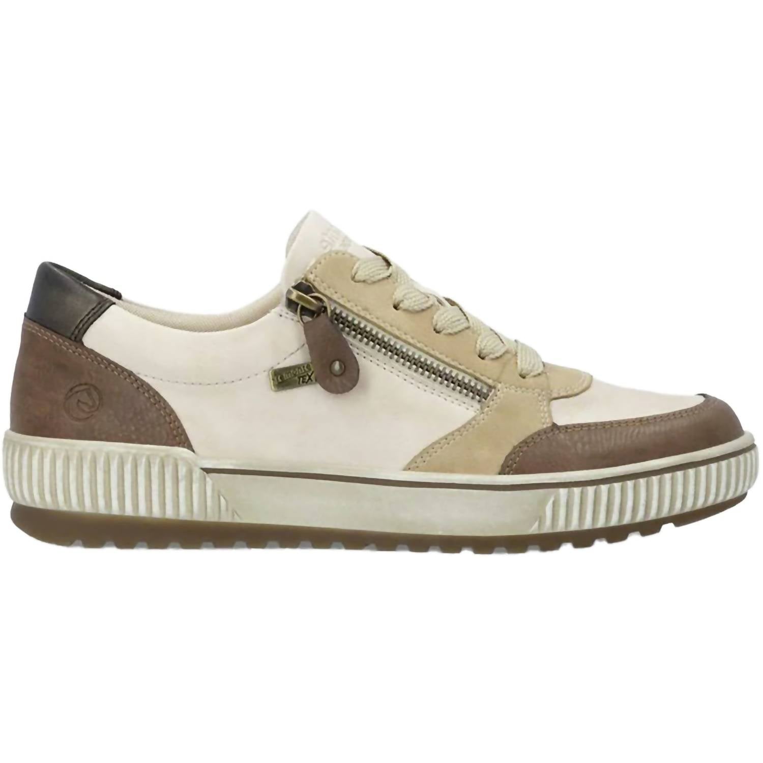 When fashion and function come together seamlessly. The Women's Maditta Leather Sneaker by Remonte is a perfect blend of fashion and function, crafted from a colorful combination of chestnut, sand, and marble leather. This sneaker features both a lace and zip closure and a water-resistant upper, making it ideal for travel or casual outings. It includes a removable insole and offers a comfortable 1.4" flat heel for everyday wear. The thermoplastic elastomer sole provides support and durability, embracing the 90s fashion trend for an updated, stylish look.
