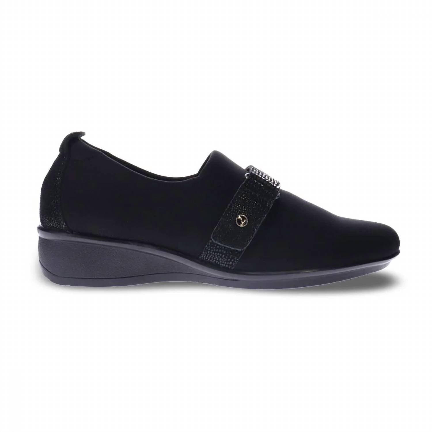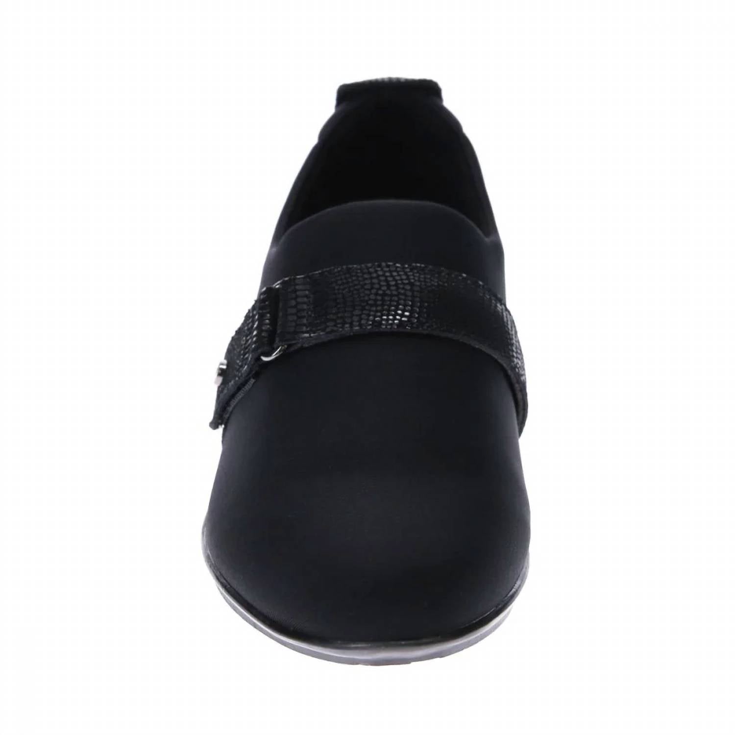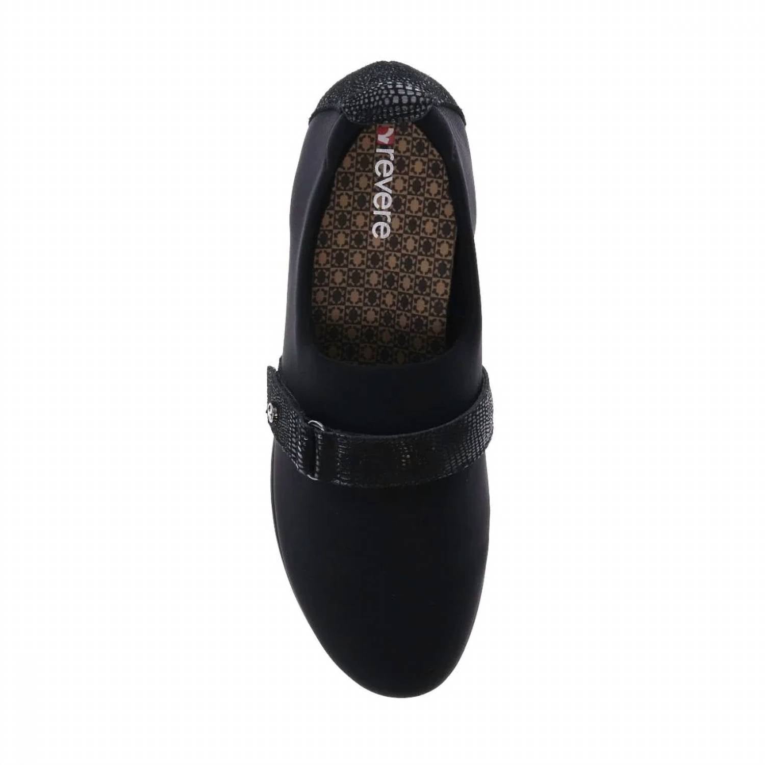 Loafers so versatile you can wear them with just about anything. Discover the Revere Women's Genoa Slip-on Shoes in an elegant Black Lizard finish, perfect for all-day wear with a refined touch. These slip-ons feature a sophisticated adjustable animal print strap and provide outstanding comfort with stretch textile uppers and a removable contoured footbed. Each pair includes a Forefoot Cushion Zone and matching strap extenders for added customization, along with a 1.5-inch heel height for a slight lift. Designed for women, this versatile shoe offers a wider fit for enhanced comfort.