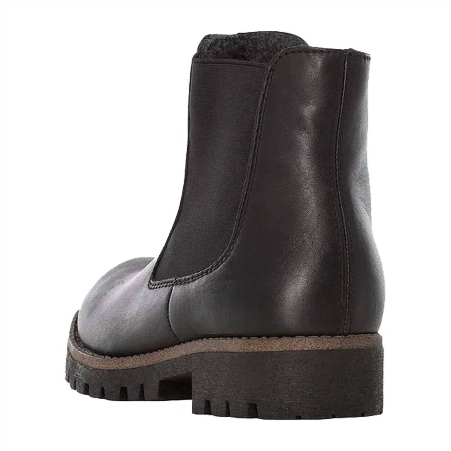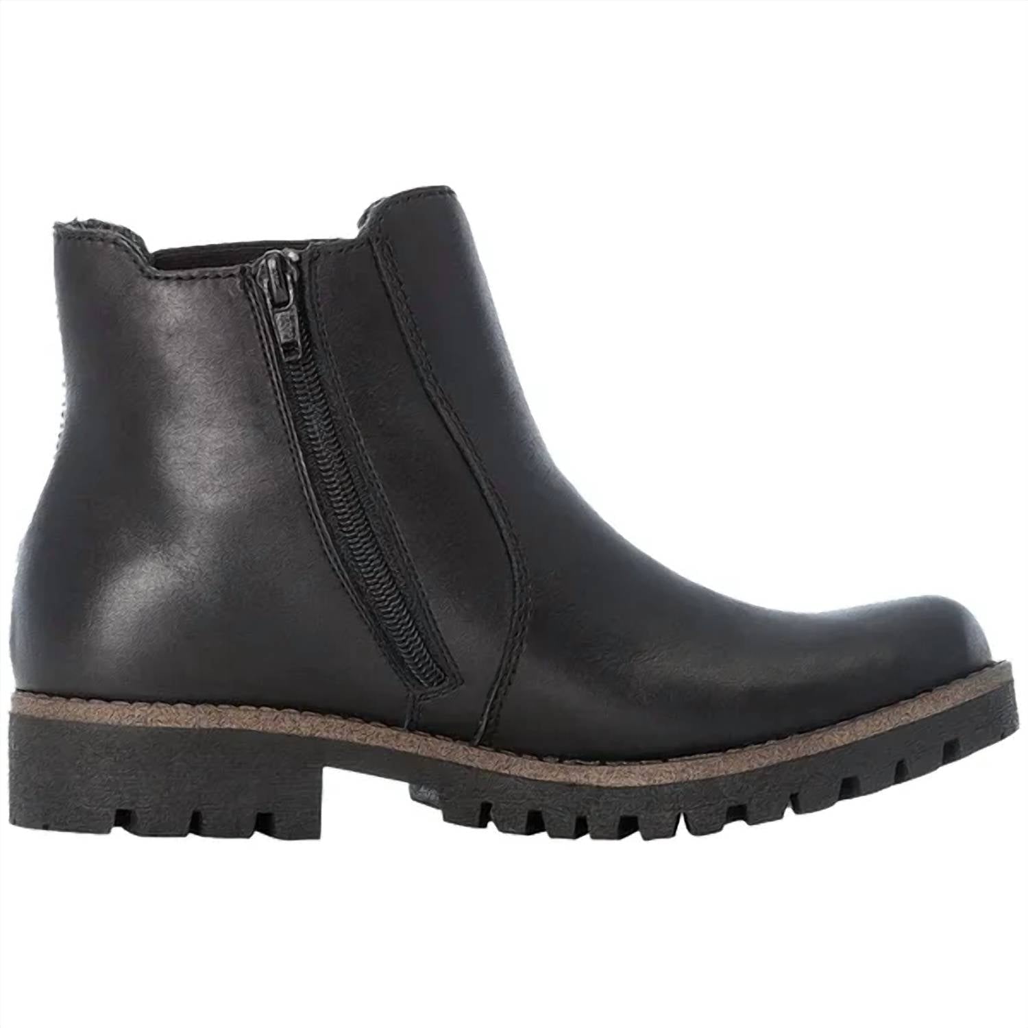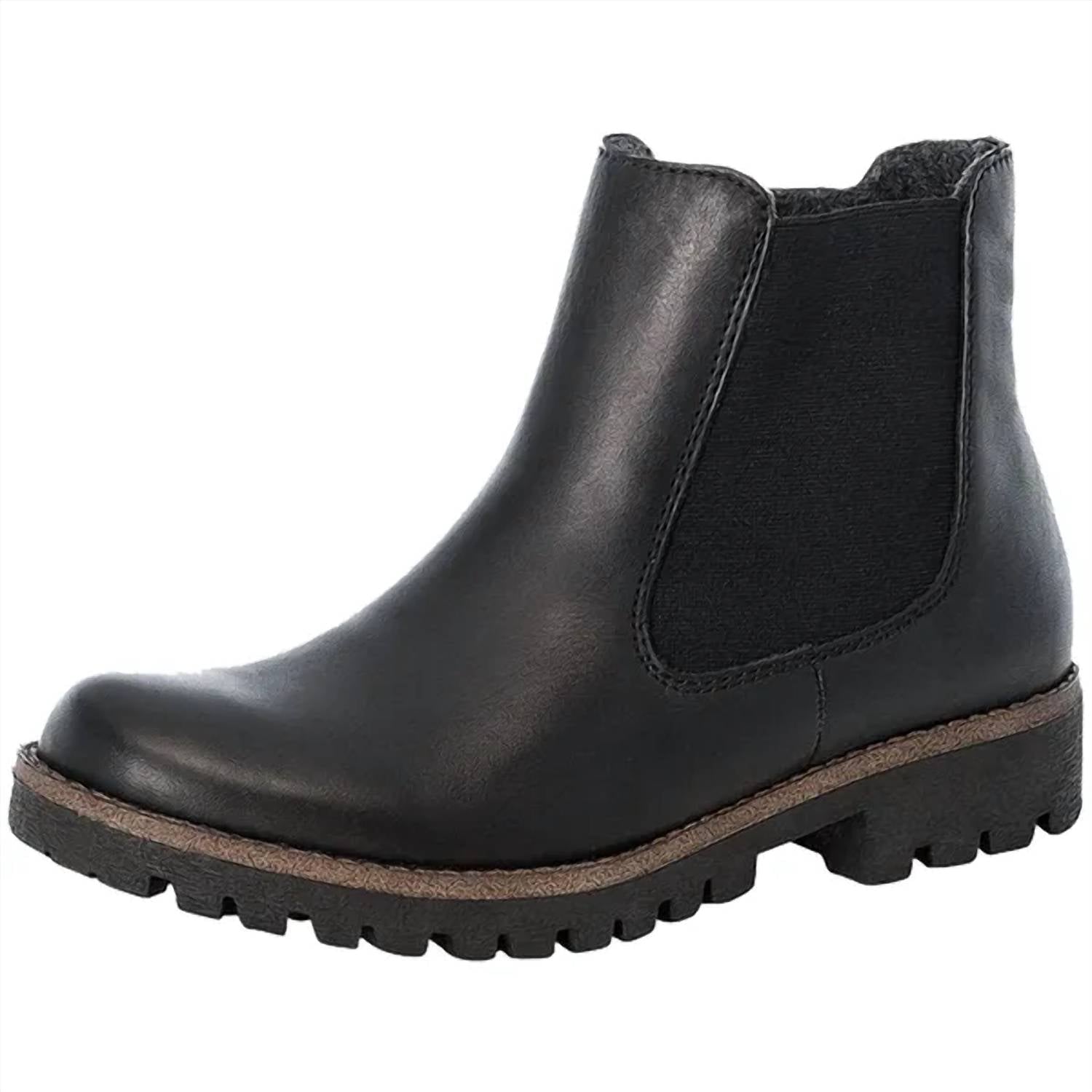 Say hello to the perfect, most versatile boot. The ankle height makes this style easily transition from day to night. Wear them with your favorite skinny jeans and tee for a more laid back look, or pair them with your favorite mini dress and jacket for a night out on the town. Step confidently into fall with the Women's Payton Boot by RIEKER, a stylish yet practical Chelsea ankle boot. Crafted from soft, durable leather in classic black, these boots feature a low block heel measuring 1 1/4"-2" for comfortable support. A cozy fleece interior and a side zipper offer warmth and ease of wear, while contrasting elastic goring ensures a customized fit. Perfectly versatile with cuffed jeans or a sweater dress, these boots are your wintertime walkability companion.