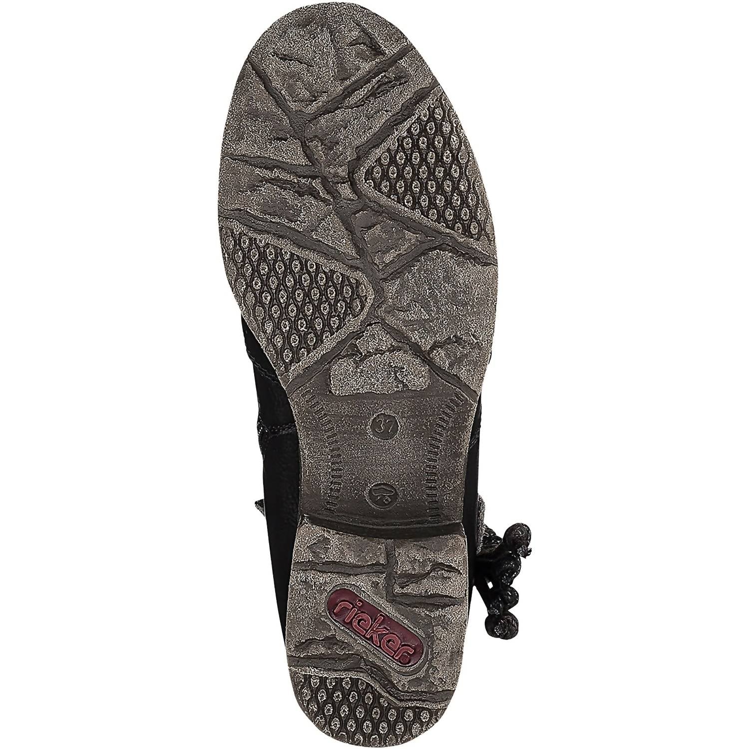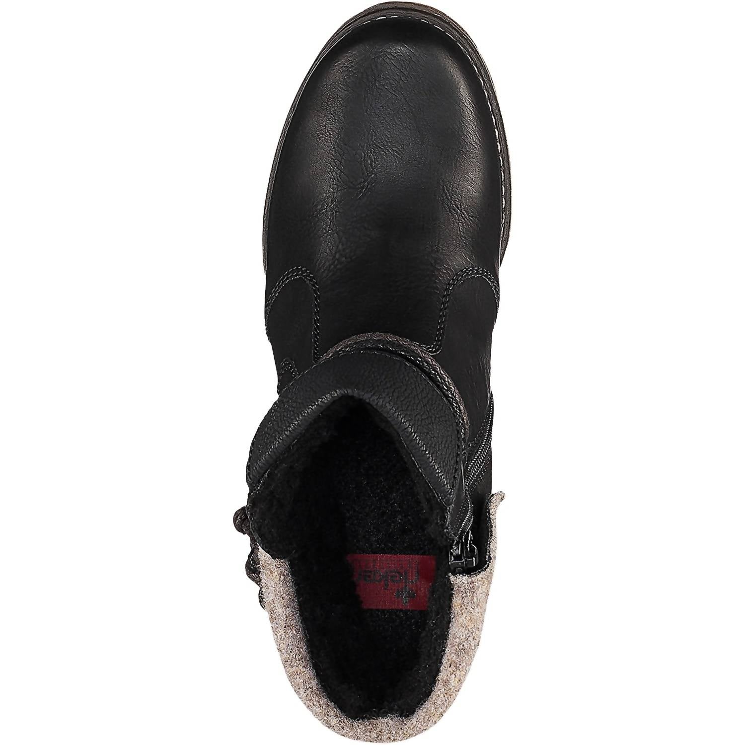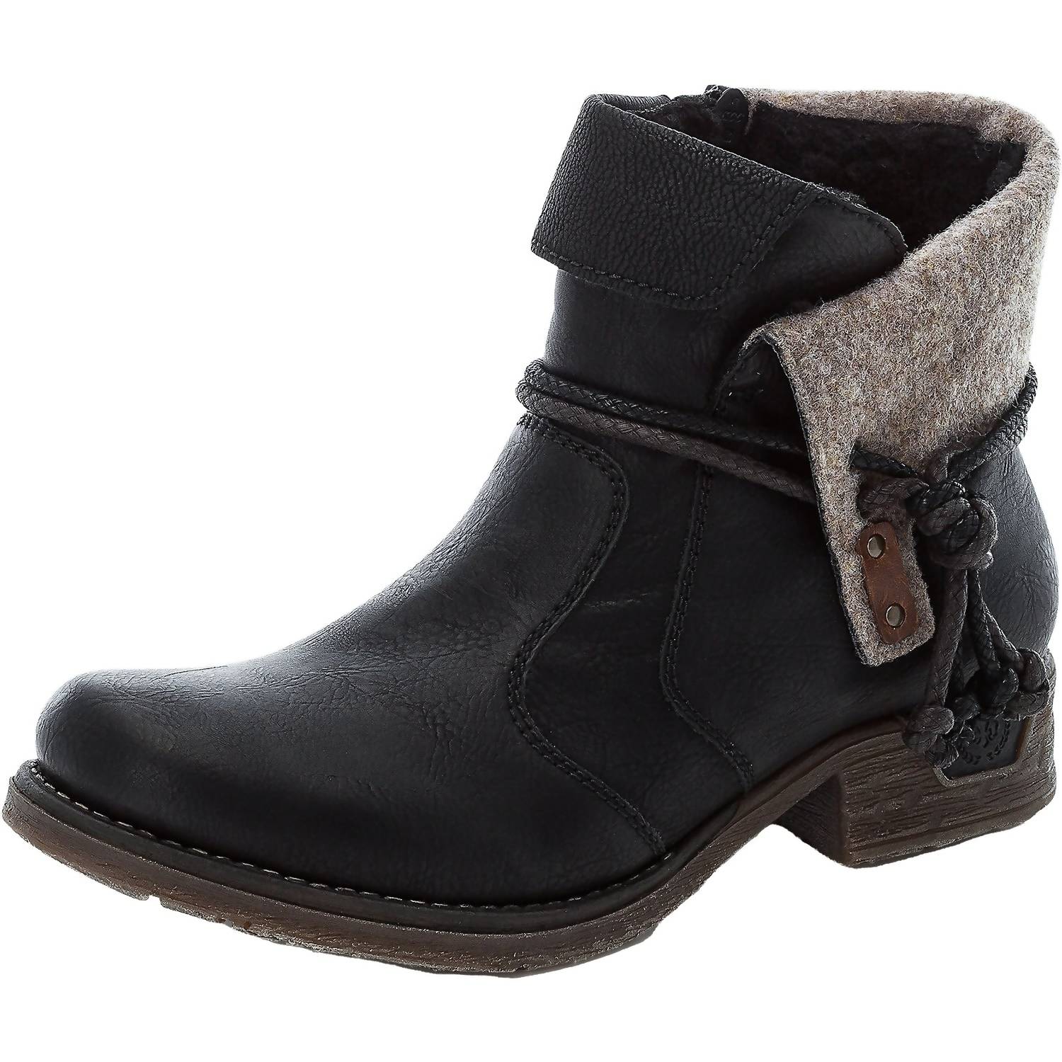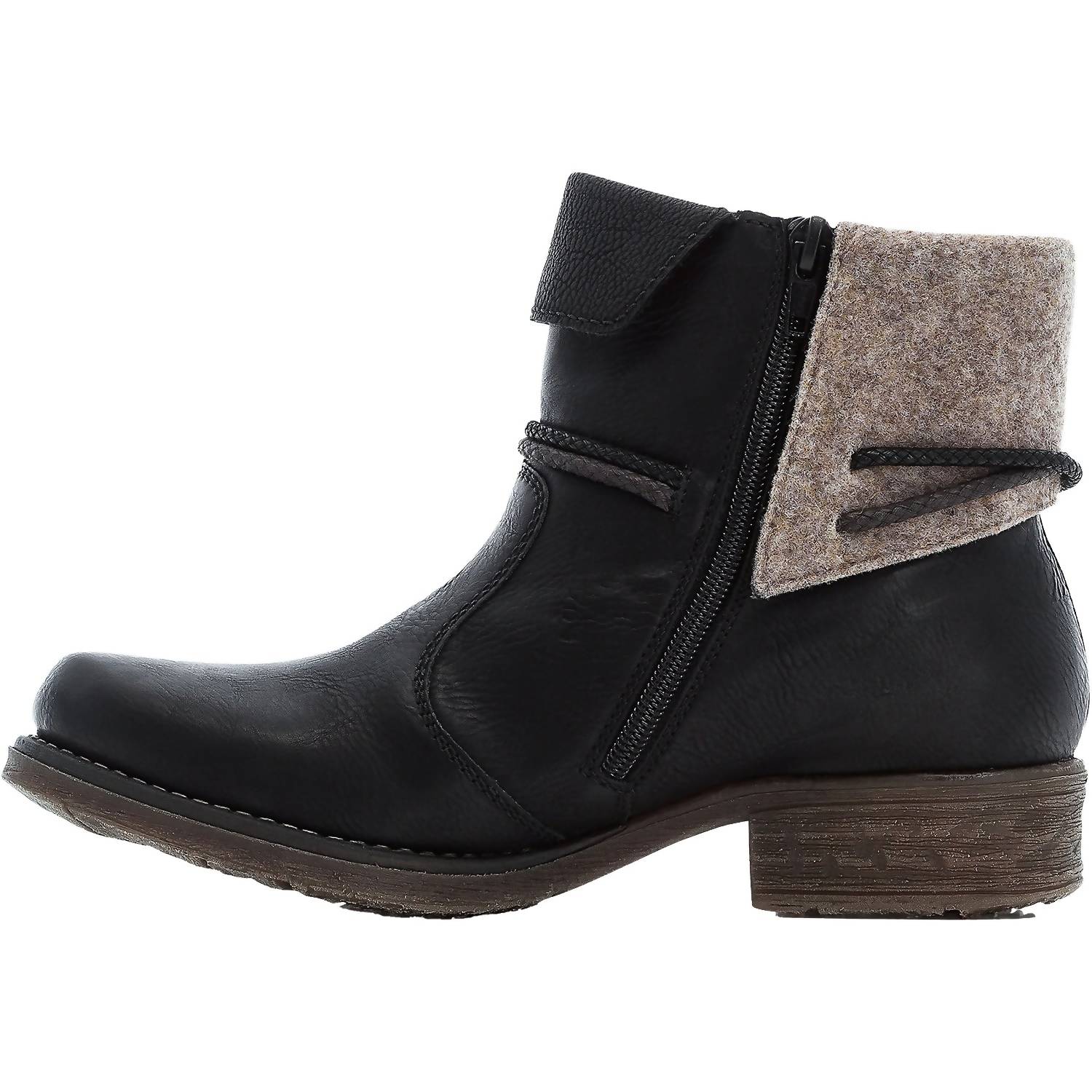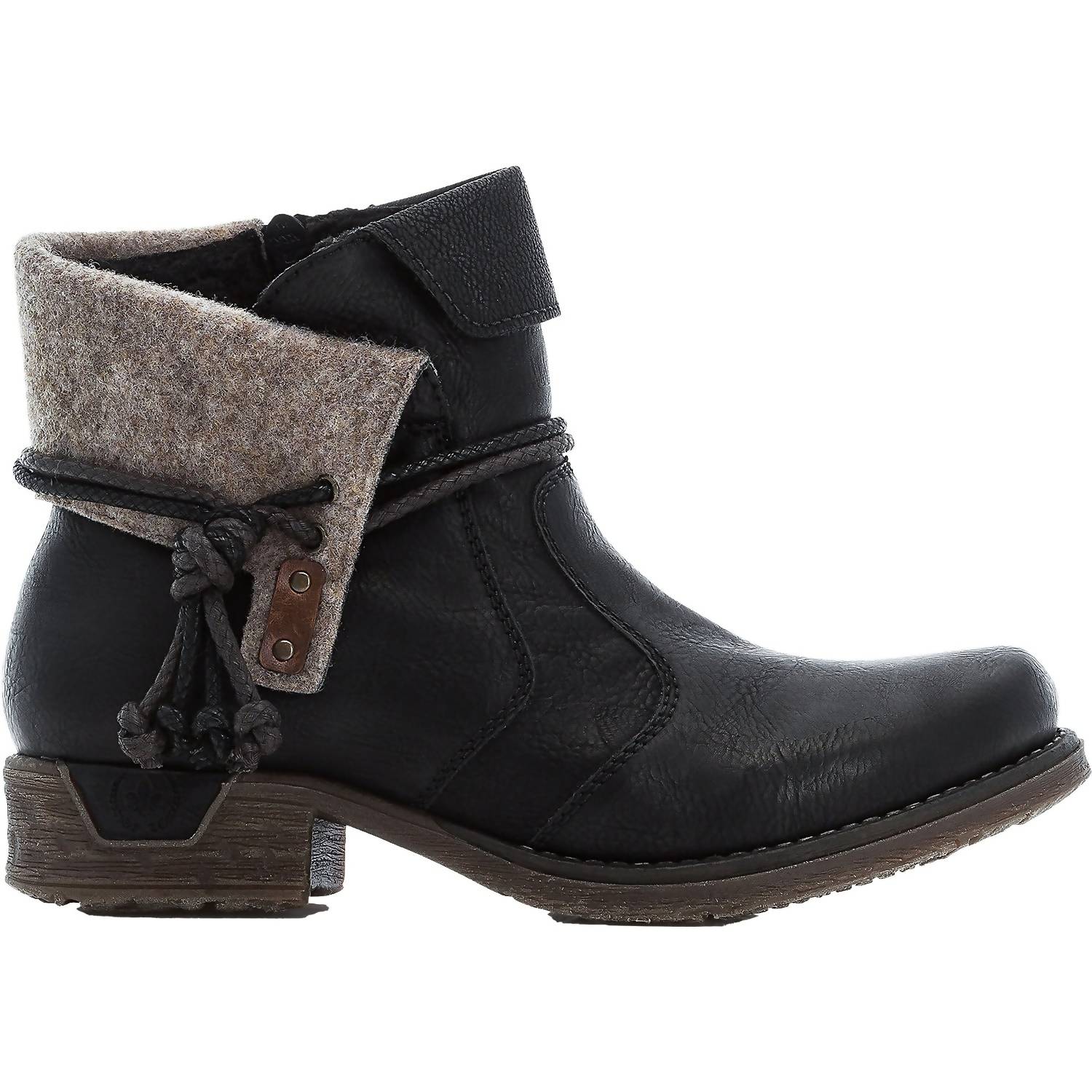 Say hello to the perfect, most versatile boot. The ankle height makes this style easily transition from day to night. Wear them with your favorite skinny jeans and tee for a more laid back look, or pair them with your favorite mini dress and jacket for a night out on the town. Step into comfort and style with the RIEKER Women's Side Zip Ankle Booties in Schwarz/Schwarz/Wood Synthetic. Featuring a synthetic upper with fabric trim, this boot includes a fashionable rope detail and a side zipper closure for easy wear. Designed with a warm textile lining and Rieker's comfort insole, these booties offer a cushioned feel, while the durable rubber sole and a 1.5-inch block heel provide durability and a touch of elevation. Ideal for fall fashion and versatile enough for travel or Thanksgiving occasions, this minimalist design maintains all-day comfort.