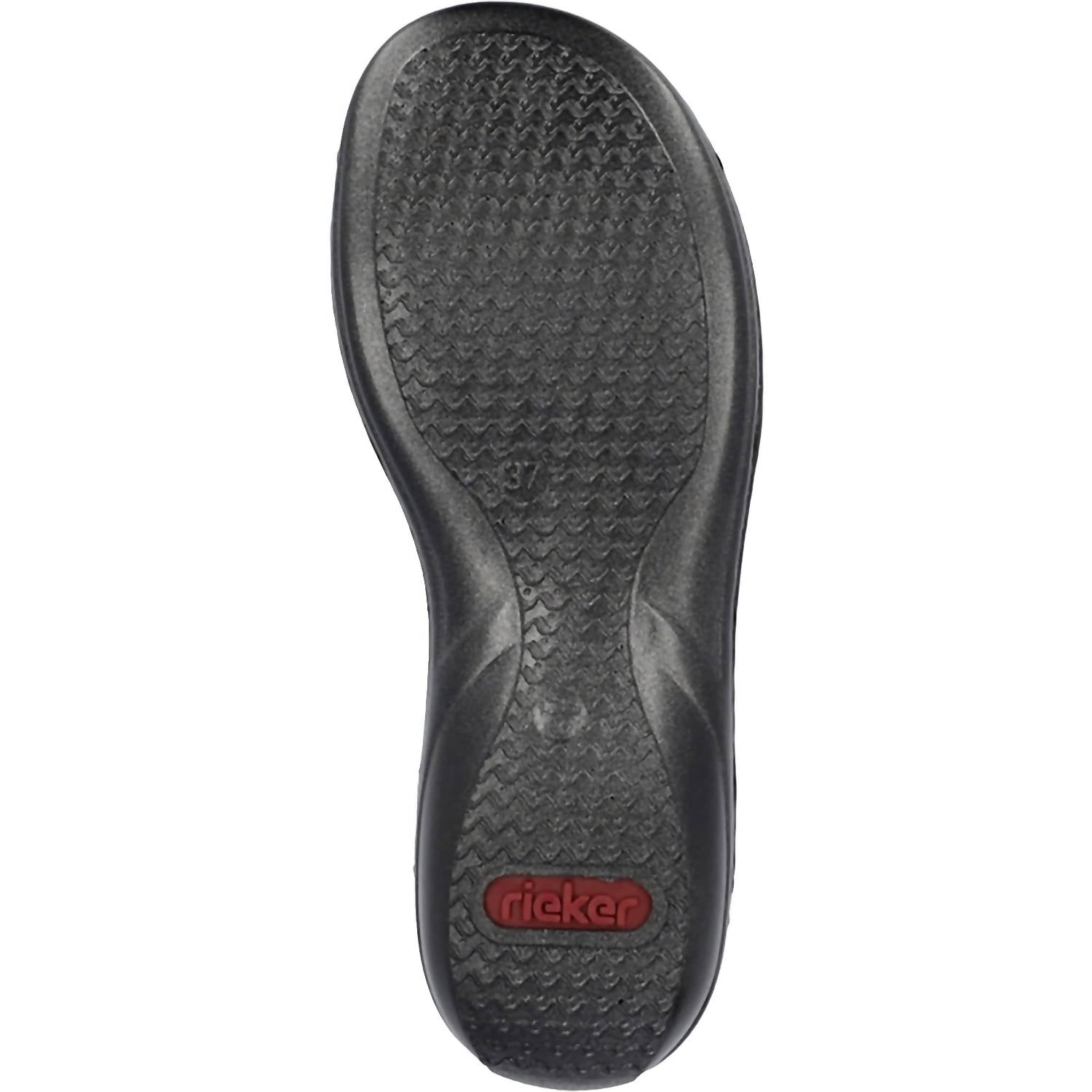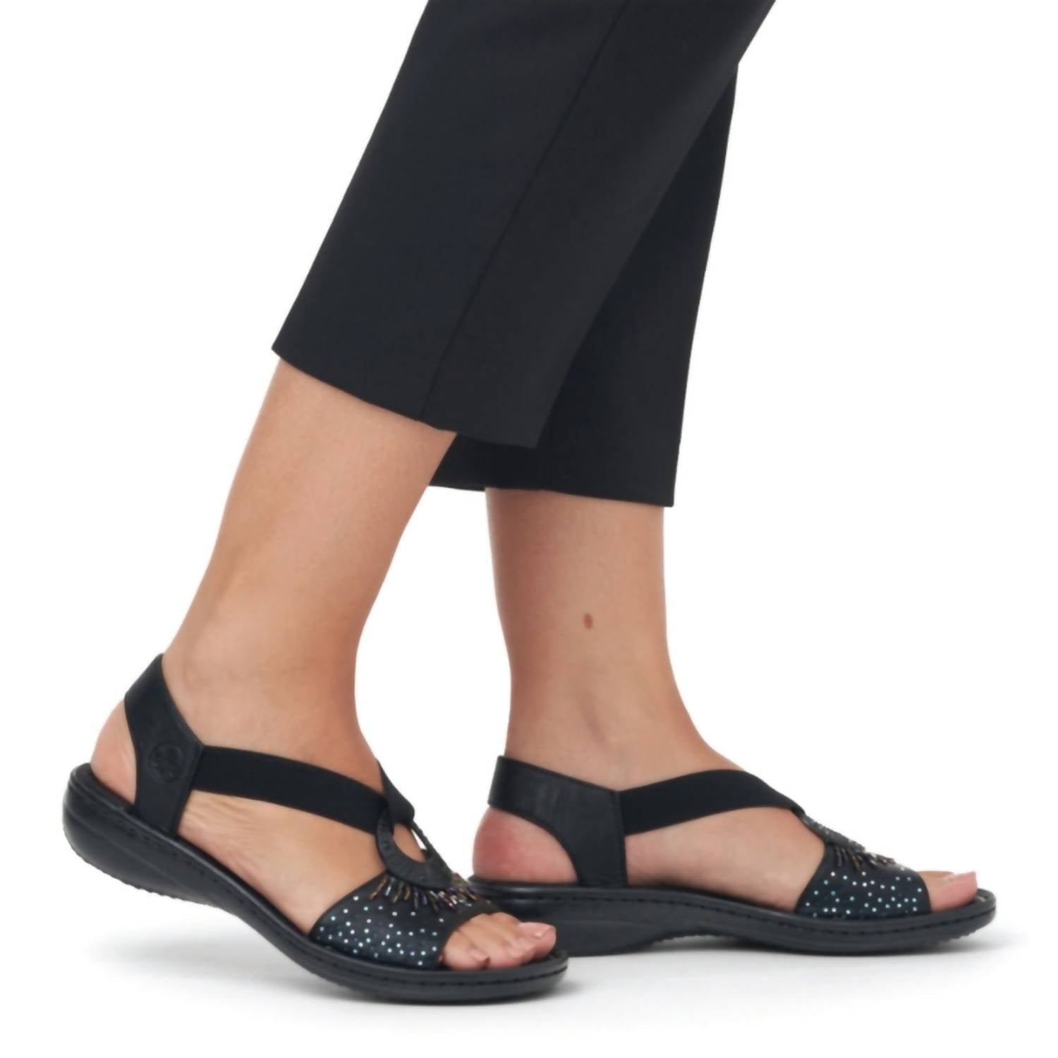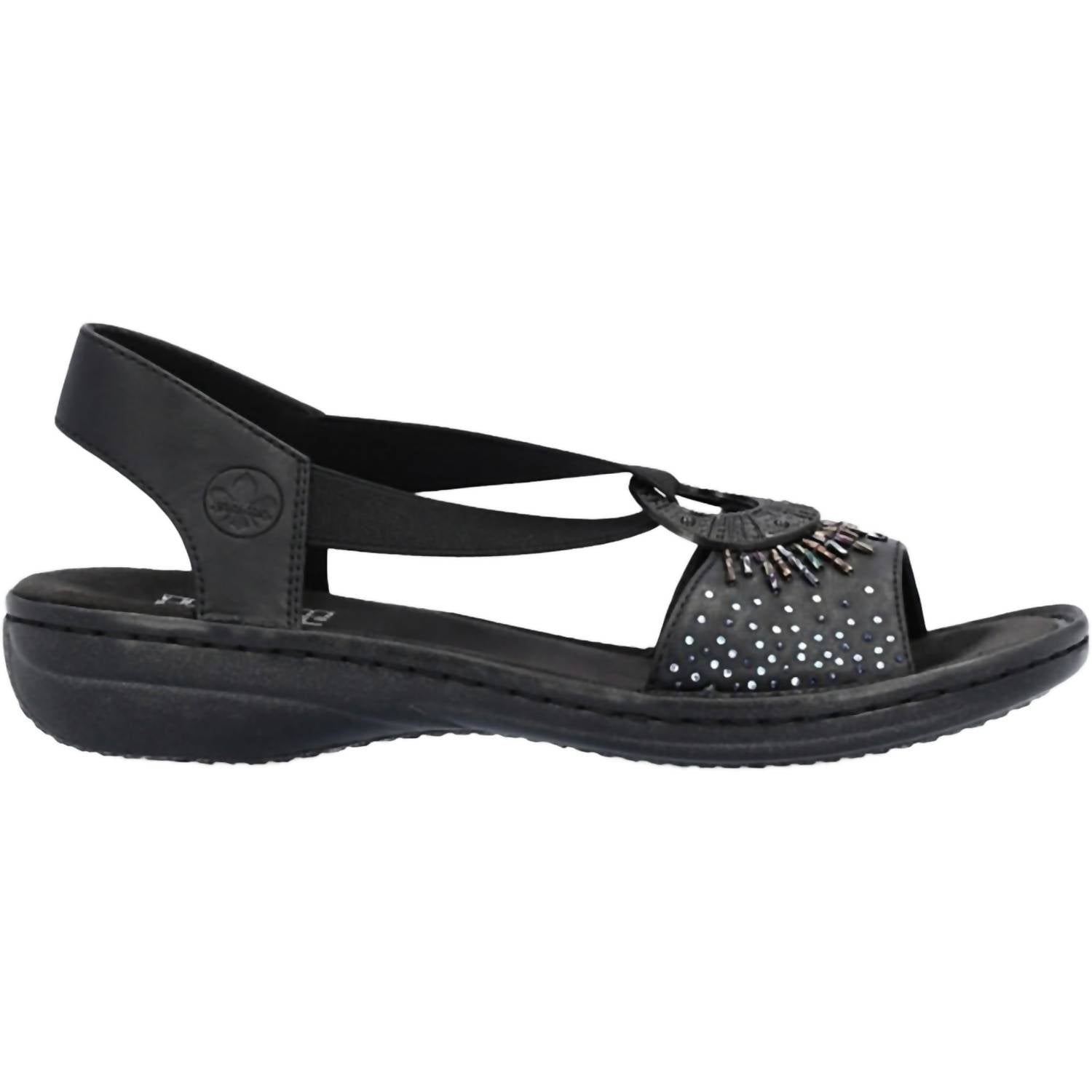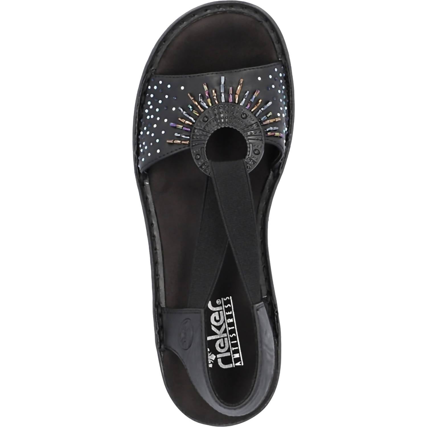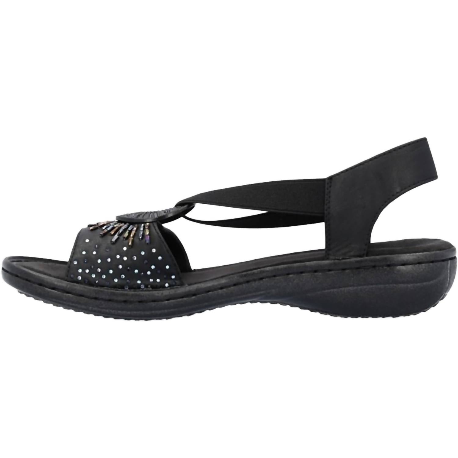 The Women's Synthetic Leather Heel Strap Sandal by RIEKER showcases a sophisticated design in black with decorative beads, perfect for vacations or Mother's Day. These sandals feature a sling-back closure and round toe shape, crafted from synthetic leather for a polished finish. Equipped with RIRICON outsole and Antistress Technology, they provide a comfortable and adaptive walking experience with a light, flexible, and shock-absorbing sole. With a low heel height of 1.4 inches, these sandals blend style and support effortlessly for medium-width feet.