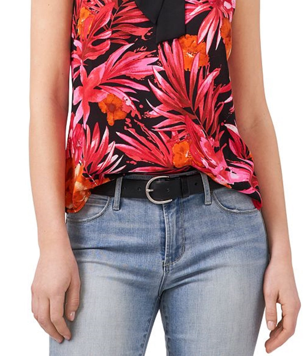 A vibrant tropical print brings all eyes to you when you enter the room while the tie detail on the neckline of this Riley & Rae sleeveless blouse draws attention up towards your face| letting you make fashionable statements with an enraptured audience. | Hits at waist; approx. 23-1/2 long| V-neck with attached tie detail| | Rayon