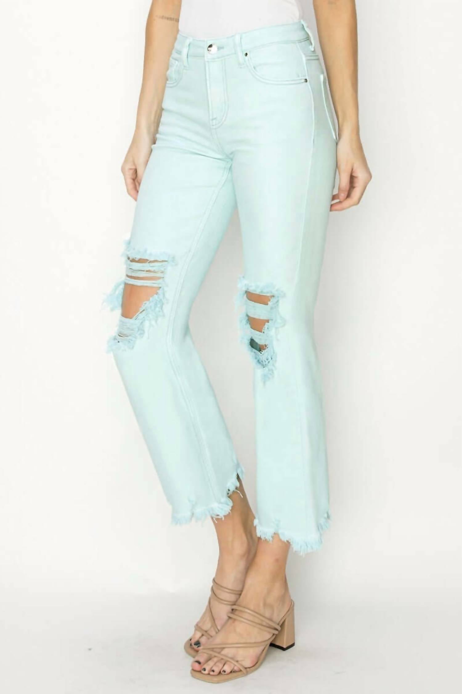 Introducing the Distressed Straight Leg Jean by RISEN, a must-have for your fall travel collection, now available in a vibrant Mint shade. This high-rise jean features a relaxed fit and straight leg style for ultimate comfort and trendy maximalist appeal. Composition: 98% Cotton, 2% Spandex. Closure: Button closure. Designed with functional pockets, it combines style with practicality.