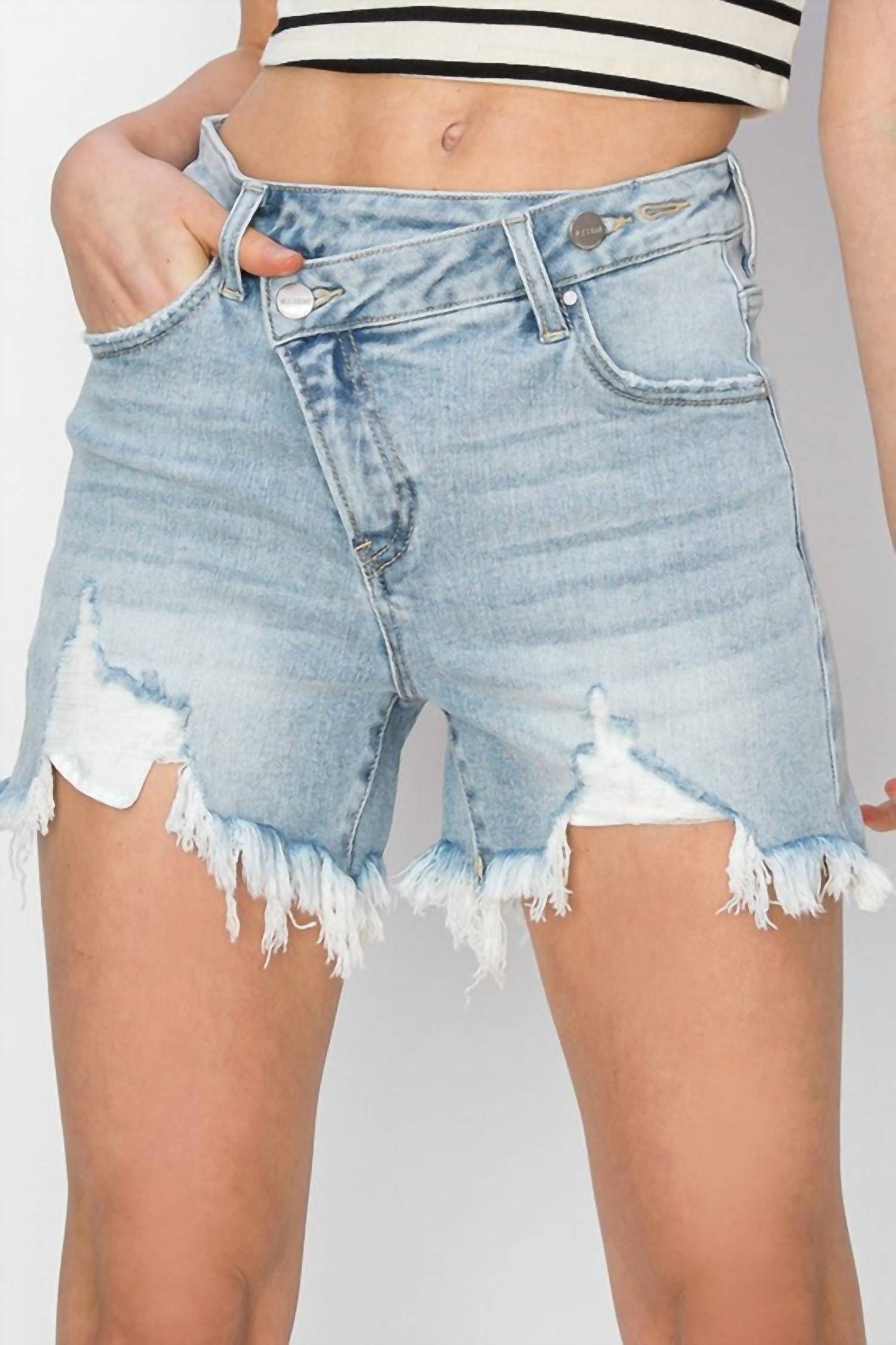 The High Rise Crossover Short by RISEN is a stylish and versatile addition to any wardrobe, made from a comfortable cotton blend in a light wash. These jean shorts feature a crossover design with a textured pattern, an 11" rise, and a 4.25" inseam. Practicality is ensured with pockets and a secure button closure. Care for this item with ease by machine washing. Model is 5'7'' with a waist of 25" and hips of 34".