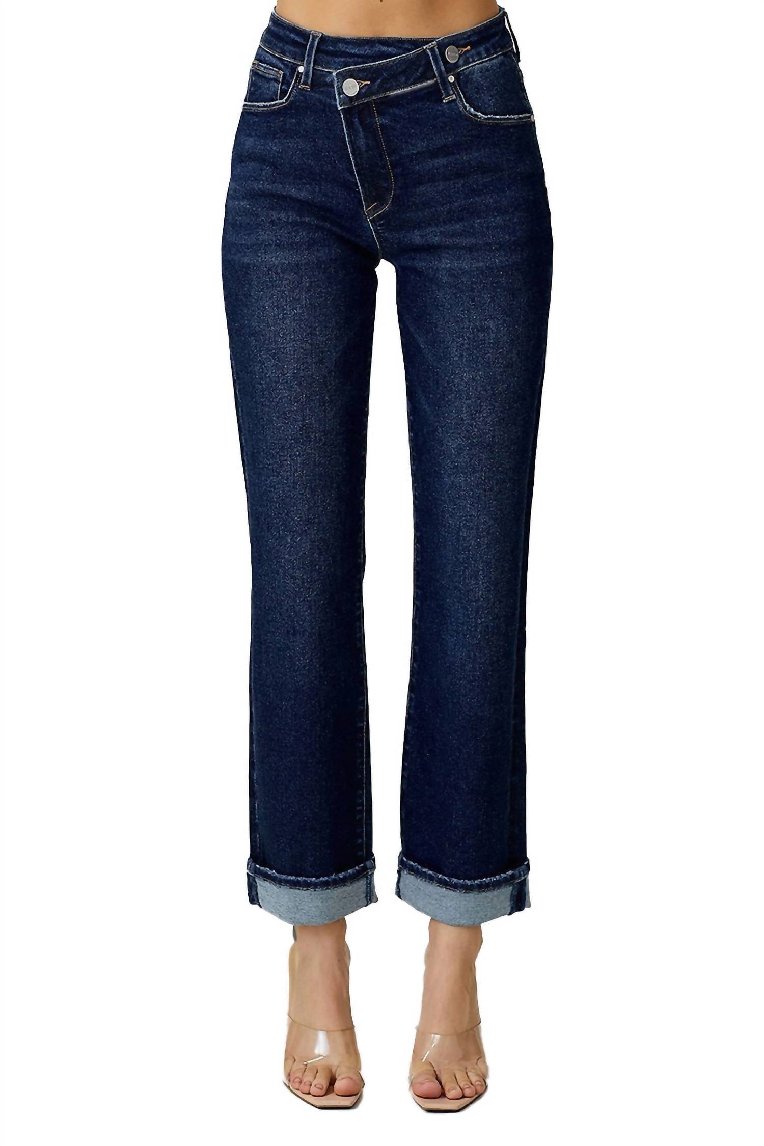 Pair these straight leg jeans with flats, sandals or even heels! You can't go wrong. Elevate your denim collection with the Risen Jeans High Rise Dark Crossover Straight Leg Jeans, a chic choice in dark blue designed for everyday elegance. Crafted from premium denim, these jeans feature a flattering high-rise waist and comfortable straight-leg fit with a button closure for a sleek silhouette. Measuring an 11-inch rise and a 30-inch inseam, they promise both style and comfort. For lasting wear, machine wash and line dry these solid-patterned jeans, an essential staple for any fashion-forward wardrobe.