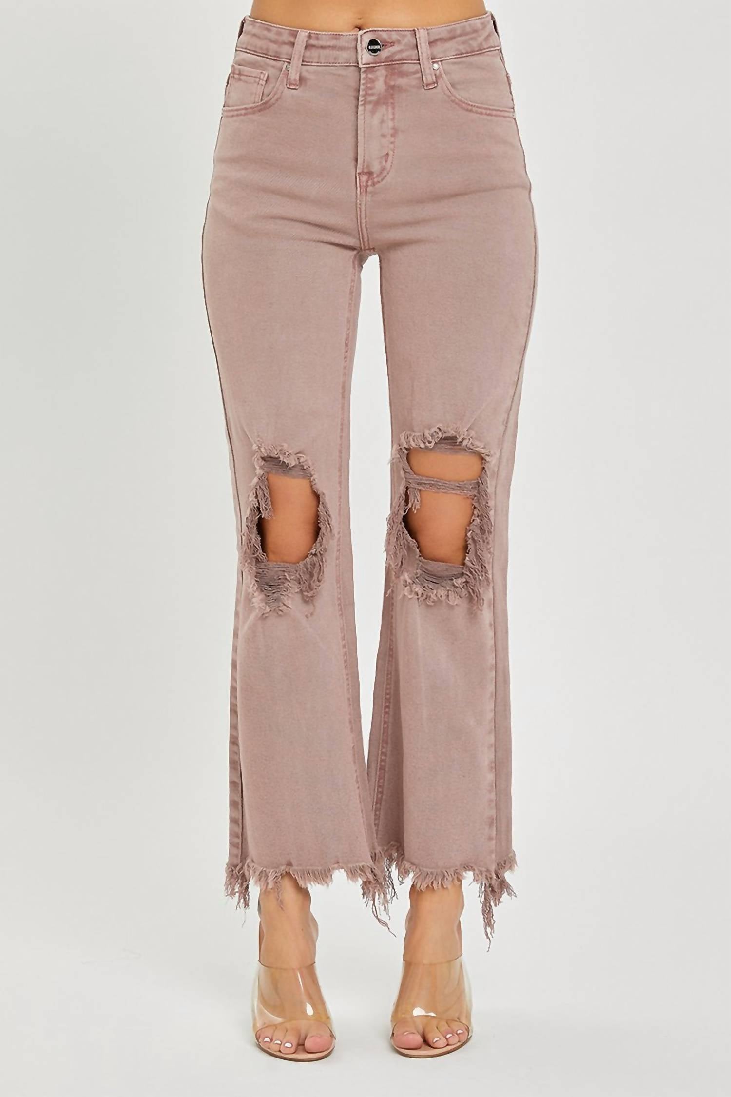 Fit to perfection, we love these high-waist jeans and you will too. Introducing the High Rise Knee Distressed Straight Jean by RISEN in a chic mauve hue, perfect for your casual wardrobe. Crafted from a blend of 98% Cotton and 2% Spandex, these jeans offer both comfort and a flattering fit. Designed with a trendy high rise, the jeans feature a 10" front rise and a 27.5" inseam, coupled with a straight leg style. The button closure adds classic appeal, while the distressed detailing gives it a modern edge. For best care, machine wash and lay flat to dry.