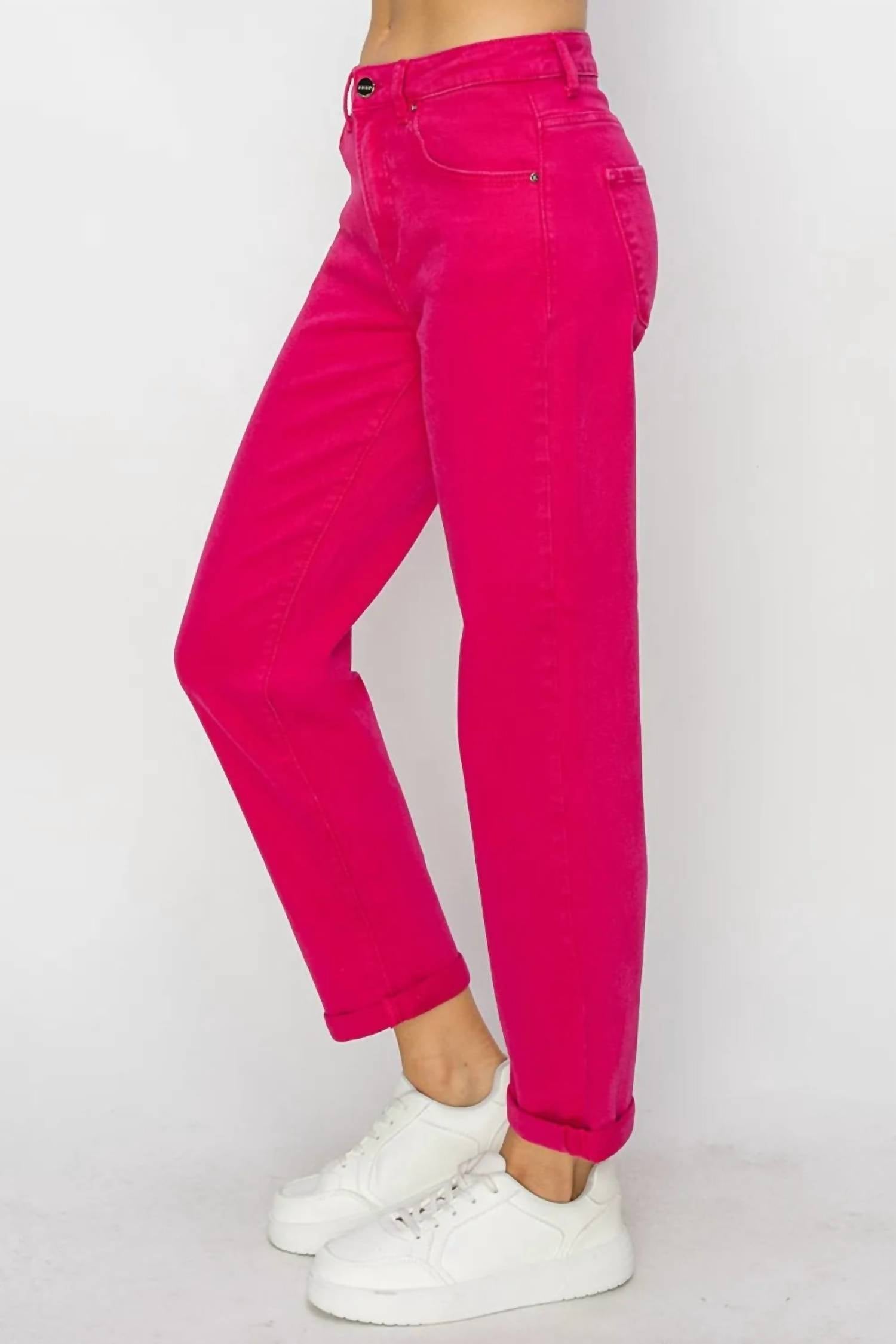 Meet the High Waist Rolled Hem Straight Jeans by RISEN, an embodiment of effortless style and comfort in vibrant fuchsia. Crafted with a cotton blend featuring 98% cotton and 2% spandex, these jeans ensure moderate stretch for a flattering fit that accentuates your curves. The rolled hem and straight leg silhouette add a trendy, laid-back vibe, complemented by functional pockets and a button closure. Imported and easy to care for, simply machine wash cold and tumble dry low for long-lasting wear, making them perfect for a chic dinner party outfit. Available in sizes ranging from XS to 3XL, with waist measurements from 24 to 45 inches and low hip measurements from 34 to 56 inches.