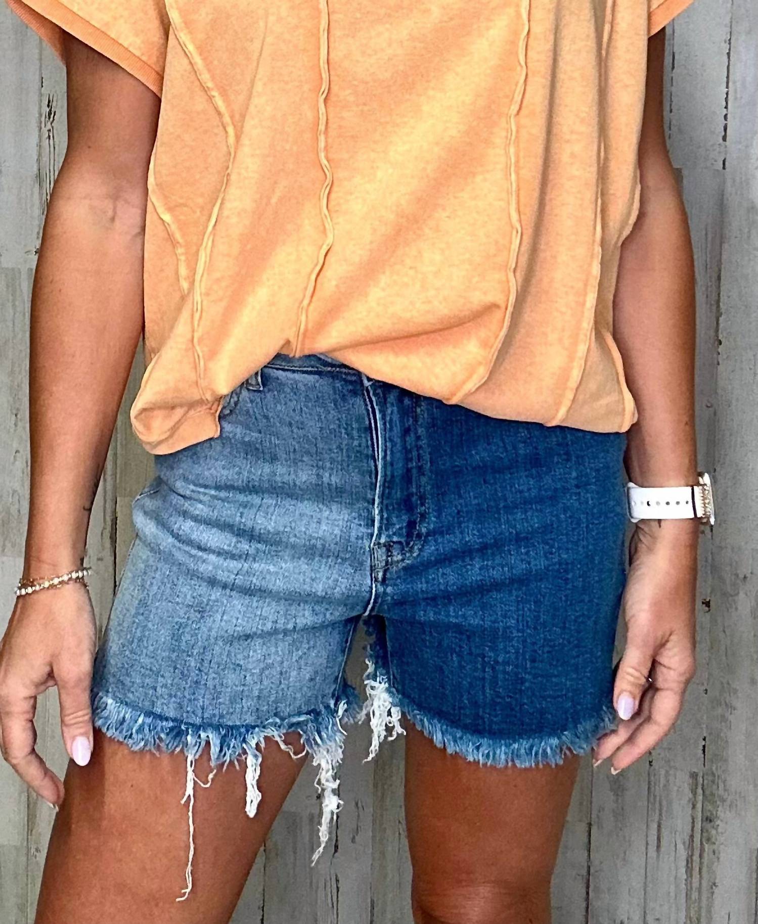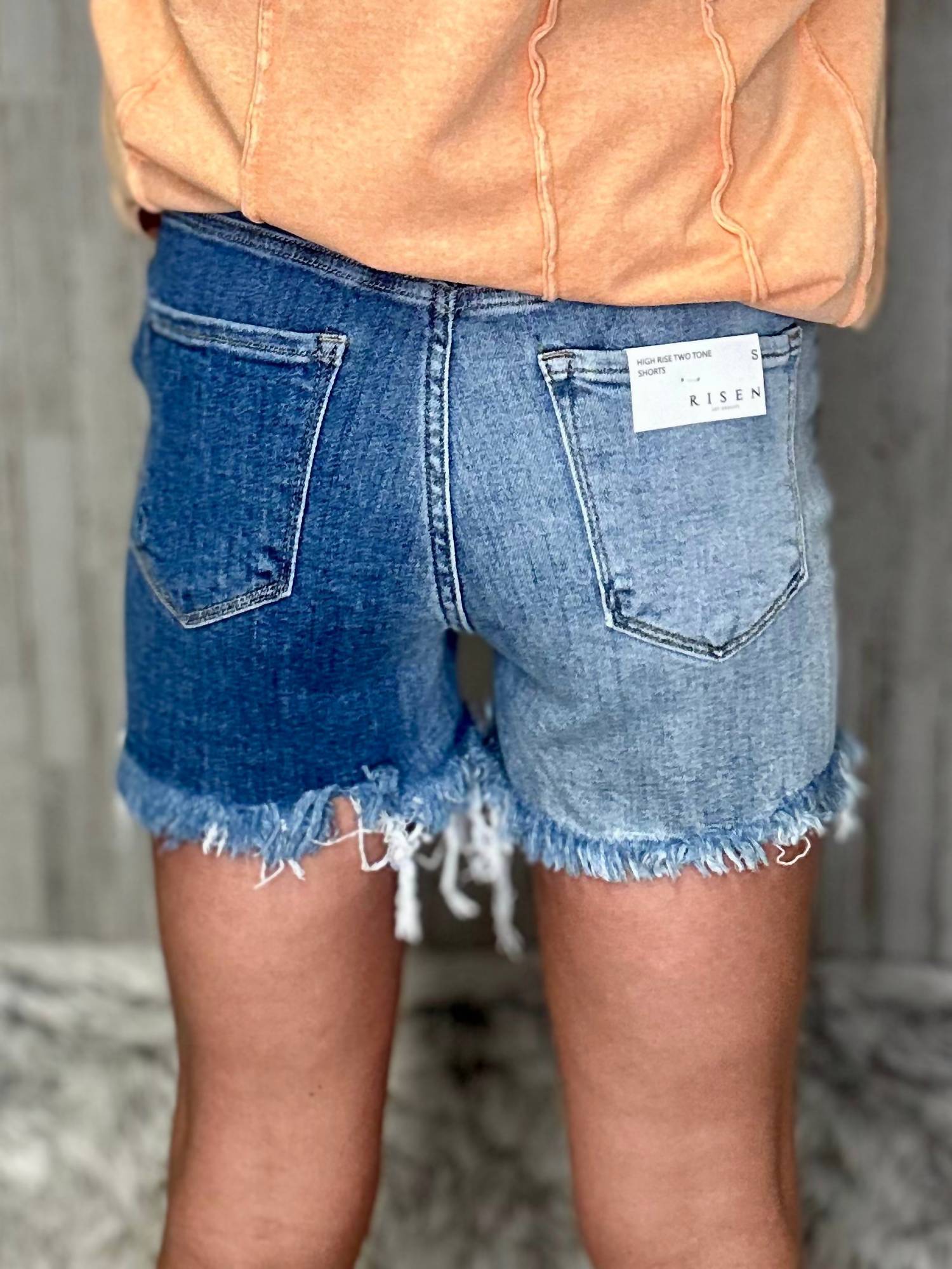Not only cute but extremely comfortable. The jean shorts you will be reaching for all season long. These two-tone jean shorts feature a high-rise fit, partially-frayed hem, and pockets. They have a zip fly closure. Made from 93% cotton, 3.5% rayon, and 1.5% spandex. Machine wash cold, tumble dry low on a gentle cycle.