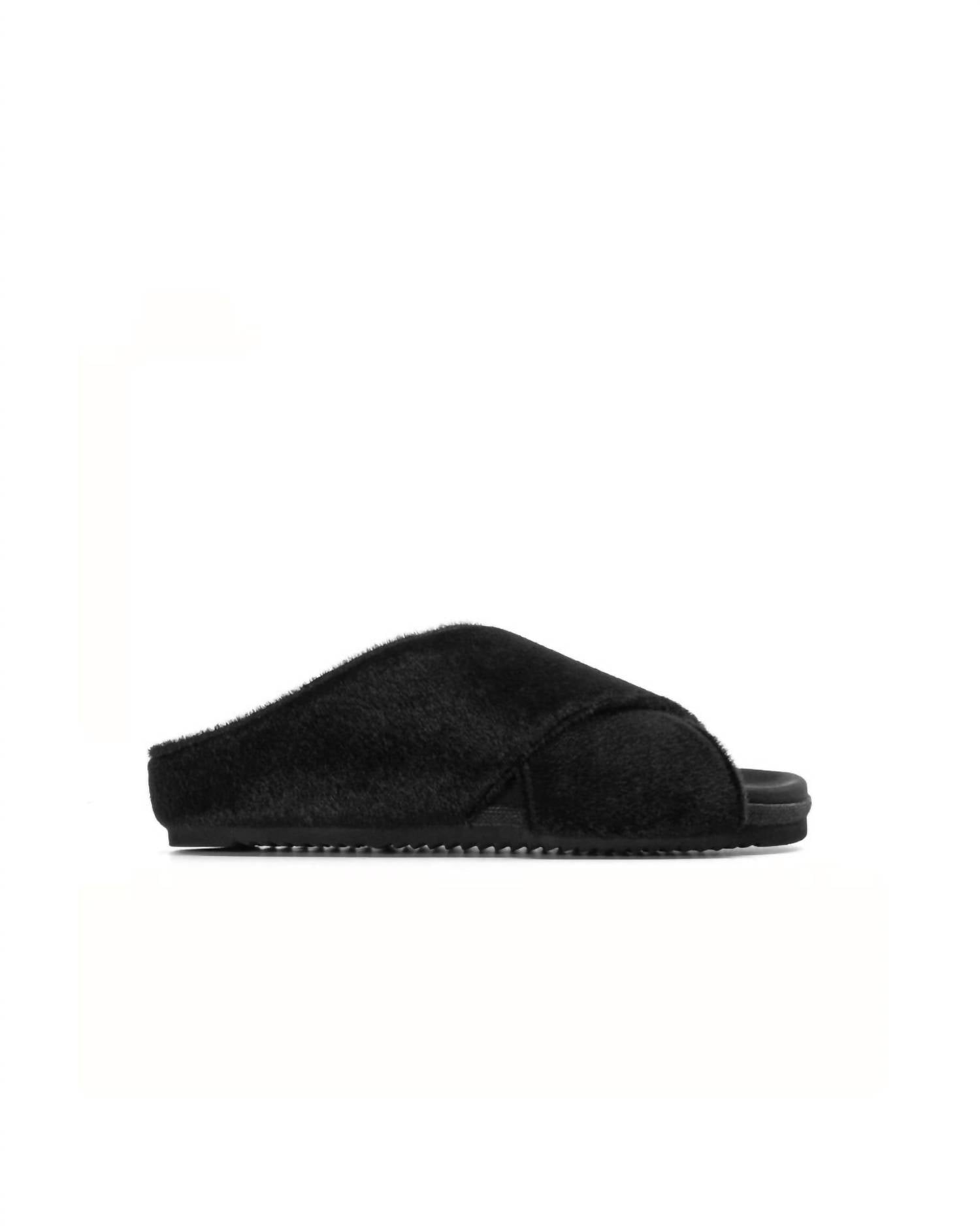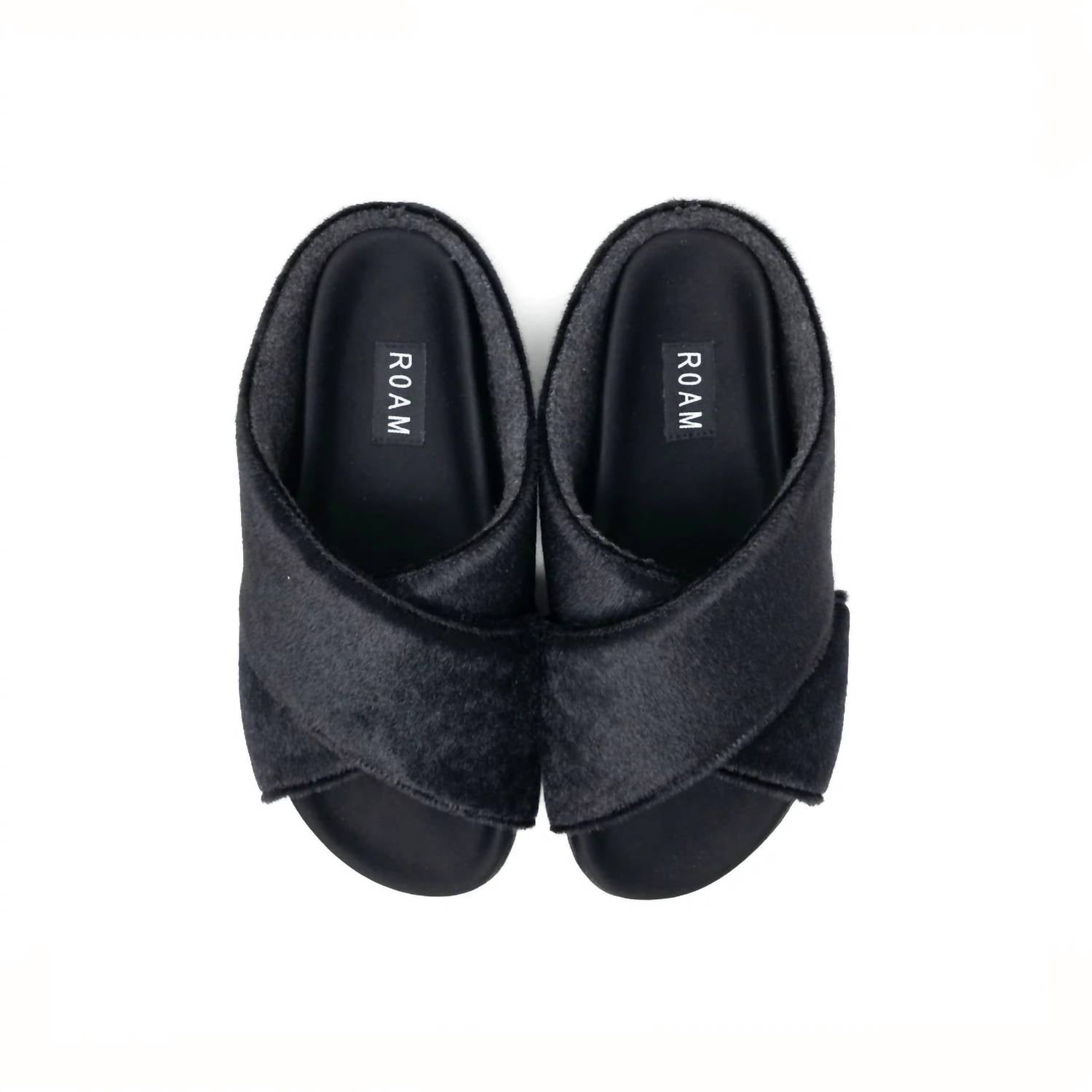 Classicly cute and all-day-wearable. We love this sandal. Embrace year-round comfort and style with the ROAM Women's Pony Ultimate-Cross Sandal in sleek black. Featuring a faux calf hair upper with memory foam padding and a cotton fleece lining, this slip-on sandal provides a plush, custom-fit experience. The neoprene footbed is moisture-wicking and breathable, supported by a durable BIO EVA outsole derived from sustainable sugar cane. Perfect for vacation and streetwear trends, these sandals boast a sole measuring approximately 3/8” for finesse, with a modest 1.5" heel height that complements any spring ensemble.