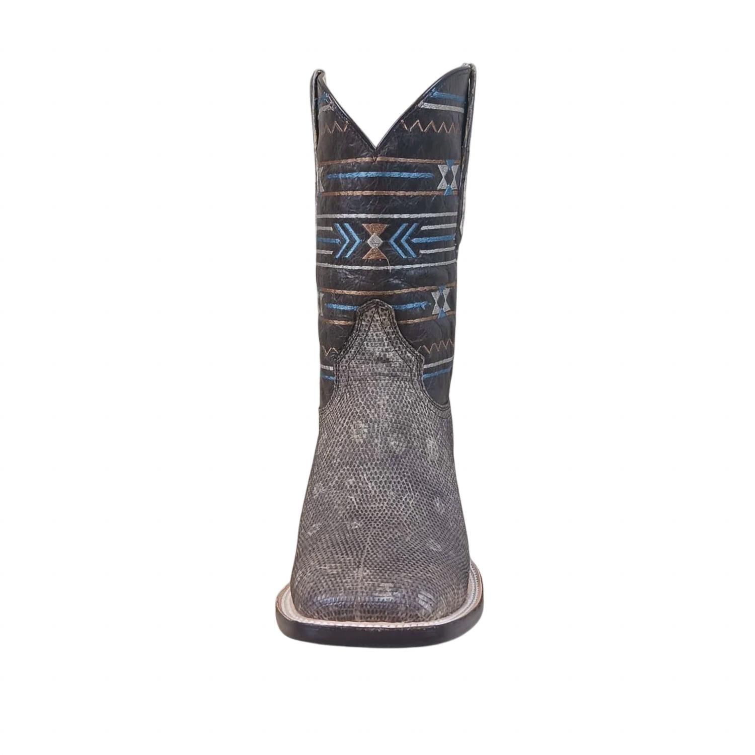 Step into timeless style with the Men's Ritch Lizard Boots by ROPER, a standout in western footwear. These boots feature a squared toe crafted from natural tan ring lizard vamp and are accentuated with native embroidery on a waxy brown leather shaft. The 11" shaft and double welt construction complement the robust design, incorporating an all-leather lining and leather walking heel for ultimate comfort. With a hybrid outsole and a removable REST insole, these grey cowboy boots offer durable practicality with a touch of elegance.
