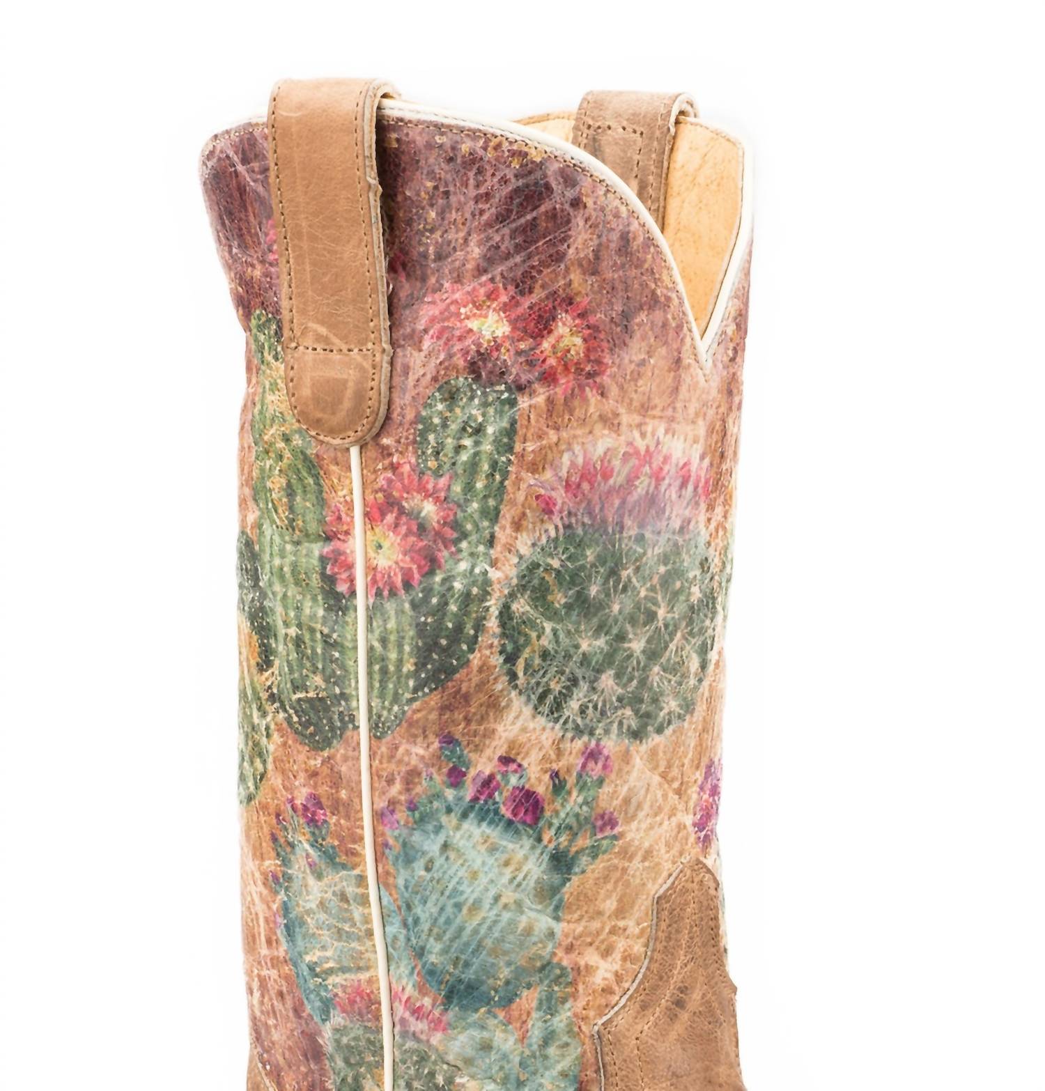 Step out in confidence and showcase your impeccable taste with these fashionable and versatile boots. Their classic style will have you reaching for these boots season after season. Embrace a touch of Western flair with the Women's Prickly Sidewinder CCW Square Toe Cactus Boots by ROPER. Crafted in Mexico from durable cowhide full-grain leather, these heeled boots feature an 11" shaft with a colorful printed cactus design and a tan vamp and shaft. The construction includes a square toe and a double welt, enhanced with an all-leather lining, REST removable insole, and a 3/4 welt sole with nails and lemonwood pegs for durability. Finished with a walking heel and a sleek leather outsole, they blend style and comfort effortlessly.