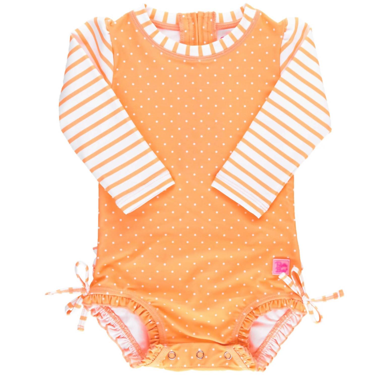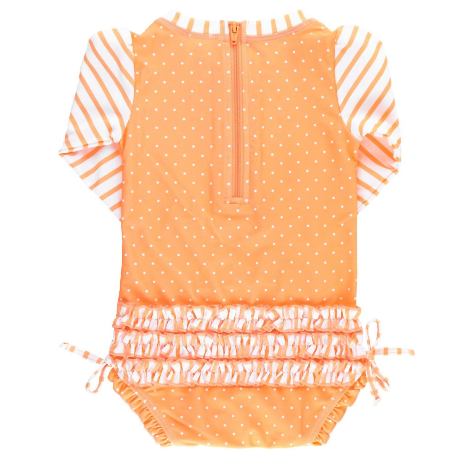 A delicious melon color that's as bright as a sunny day! This Ruffle Butts Melon Polka Dot One Piece Rash Guard swimsuit is made of UPF 50+ fabric so you can feel confident her tender skin will be protected from the harmful sun's rays. Of course, always use sunscreen where skin is exposed. This adorable suit has a zipper back for easy dressing and features the Ruffle Butts signature ruffles on the back.