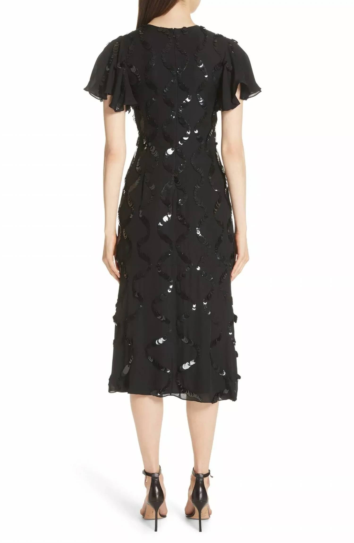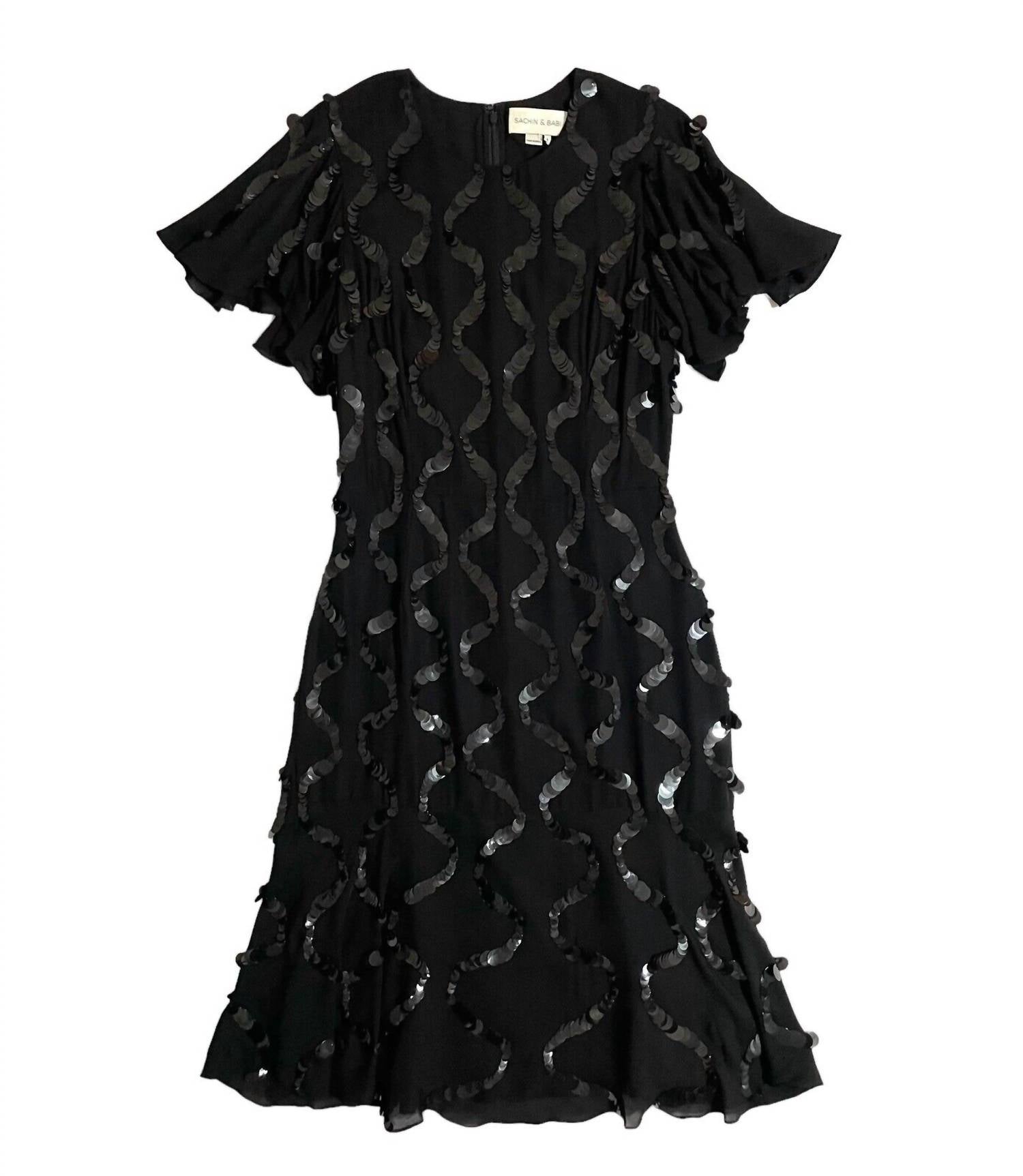 A midi dress so versatile, your options for wearing it are endless. Introducing the Sophia Sequin Silk A-Line Flare Dress by SACHIN & BABI, a perfect blend of elegance and glamour. This cocktail dress features chic flutter sleeves and a slightly flared skirt, beautifully embroidered with paillettes in a wave design. Crafted from sumptuous jet silk georgette, it promises a luxurious feel and is fully lined for comfort. Measuring 43" from shoulder to hem, with a 15" shoulder, 17.5" chest, 14" waist, and 9" sleeve, this dress secures with a convenient back zip closure. Care for it with dry cleaning only, ensuring its elegance lasts.
