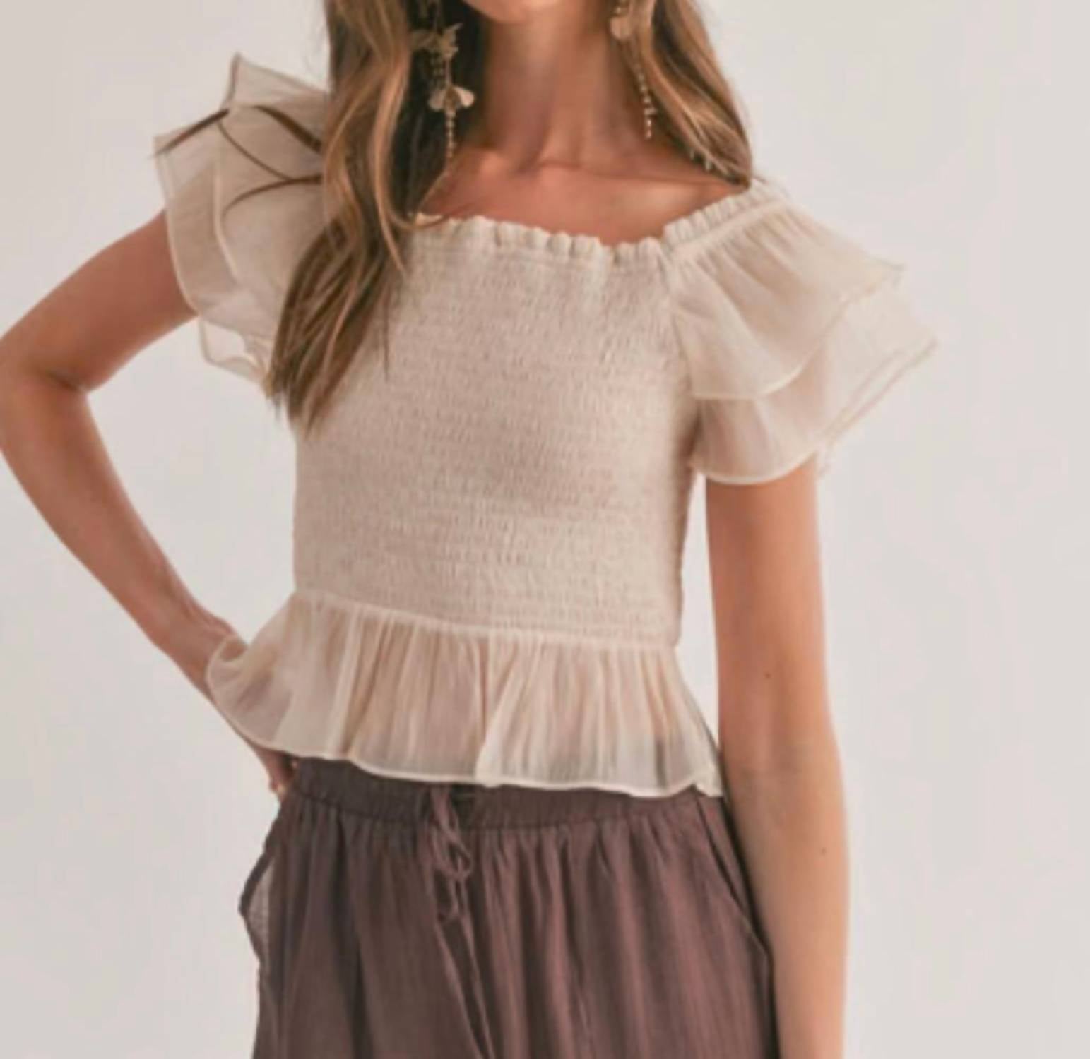 Fit, fabric and functionality. This tank top checks all the boxes. Enhance your wardrobe with the Blurred Smocked Ruffle Peplum Top by SAGE THE LABEL, a stylish piece in a lovely Butter hue. This tank top features a textured pattern with short sleeves and a charming squareneck design. Expertly crafted from a Nylon blend, it offers a comfortable pullover closure for easy wear. Ideal for women seeking effortless elegance in their everyday look.