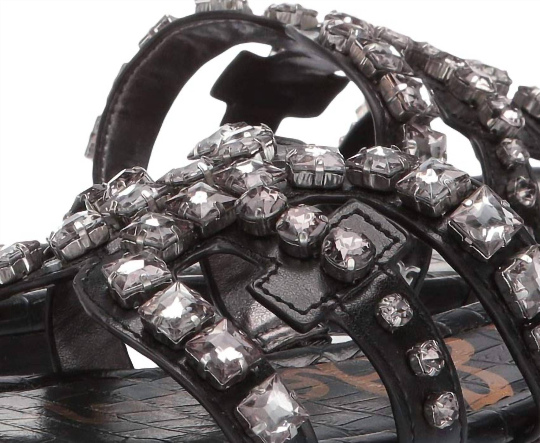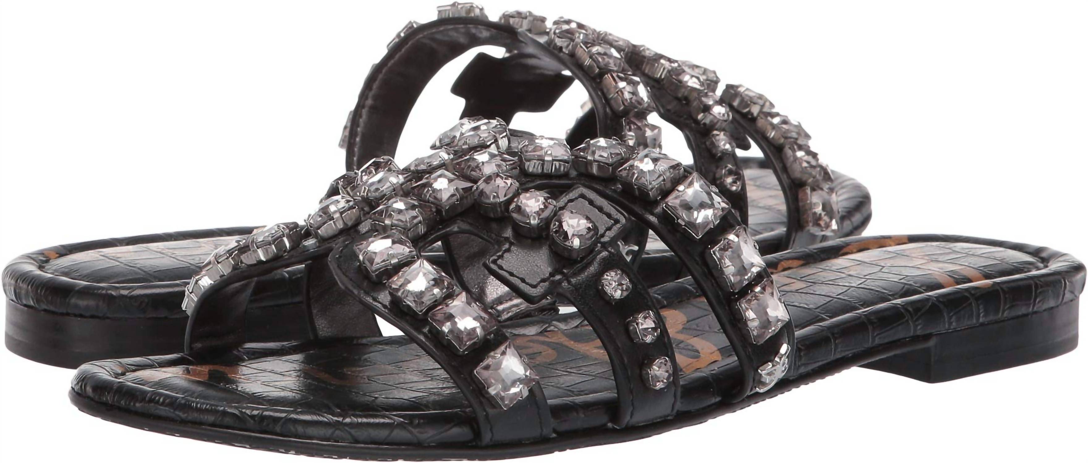 Flowy dresses, cropped pants, and even jumpsuits... this sandal works with them all! Step into style with the Women's Bay Round Toe Slip On Leather Flats Slides by Sam Edelman, featuring a chic geo cutout design in Black Jewel Croco. Crafted with a 100% leather upper and a synthetic sole, these sandals ensure durability while providing maximum comfort with their cushioned footbed. The open toe and slip-on design enhance wearability, making them perfect for any occasion. Toe Shape: Round Toe. Heel Style: Flat Heel.