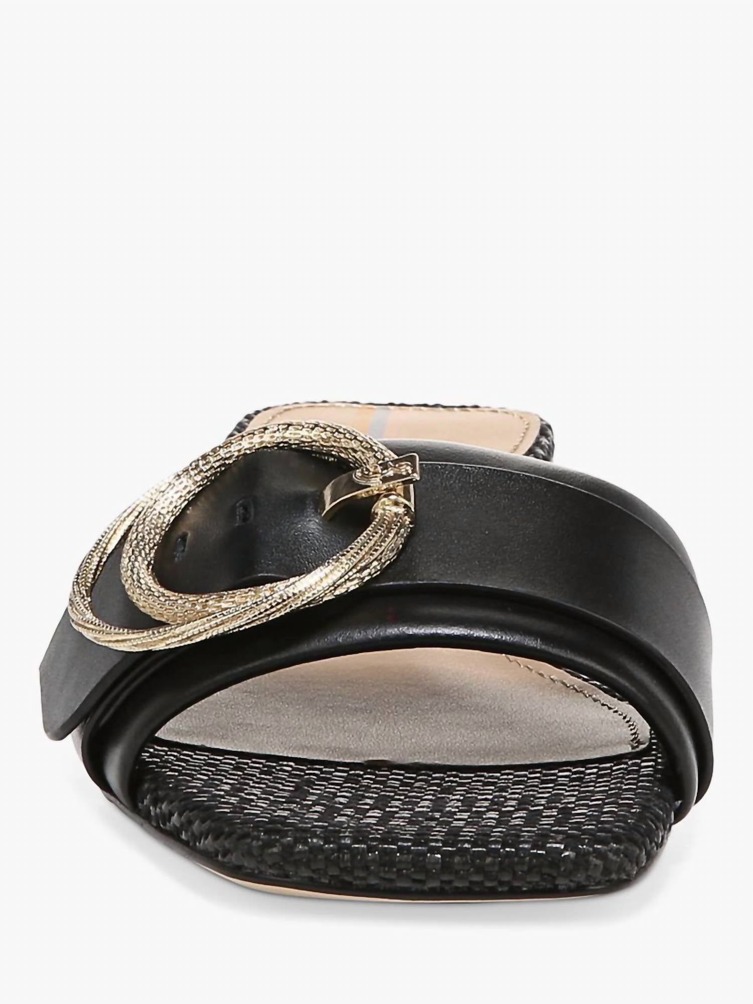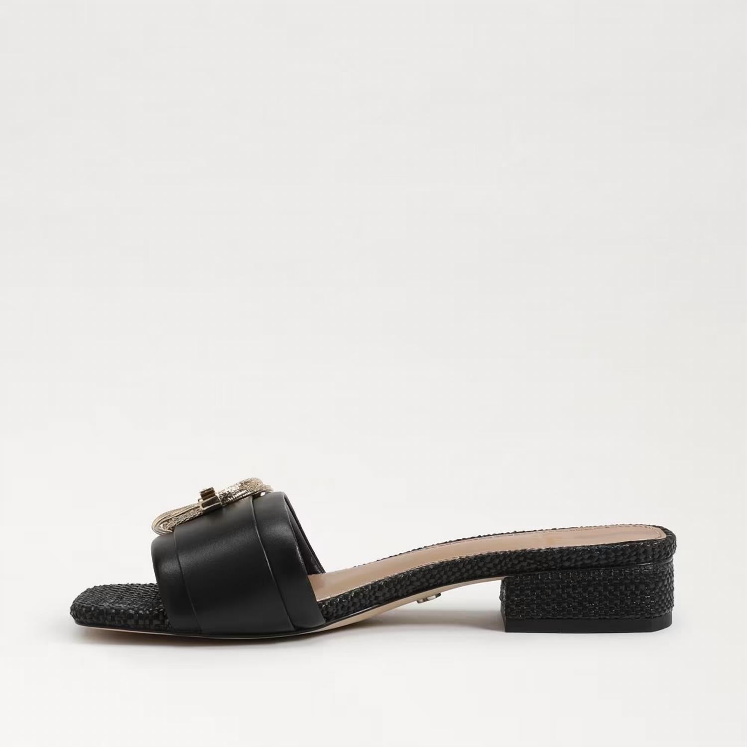 Pair these with a cozy robe and we call this loungewear luxe. Step into elegance with the Women's Delfi Slip-On Open Squared Toe Block Heel Fashion Slide Sandal by Sam Edelman, where sharp edges meet sophisticated rounded curves. Crafted from luxurious leather, these sandals feature a stylish open toe and a distinctive double circle buckle, all set on a comfortable 1-inch block heel. The slip-on design ensures easy wear, while the synthetic insole promises comfort for a night out. Perfect for fall occasions, like a dinner party or Thanksgiving celebration.