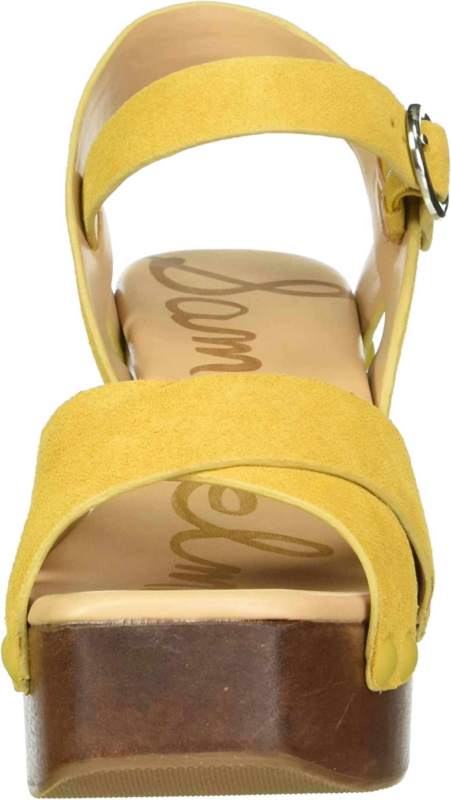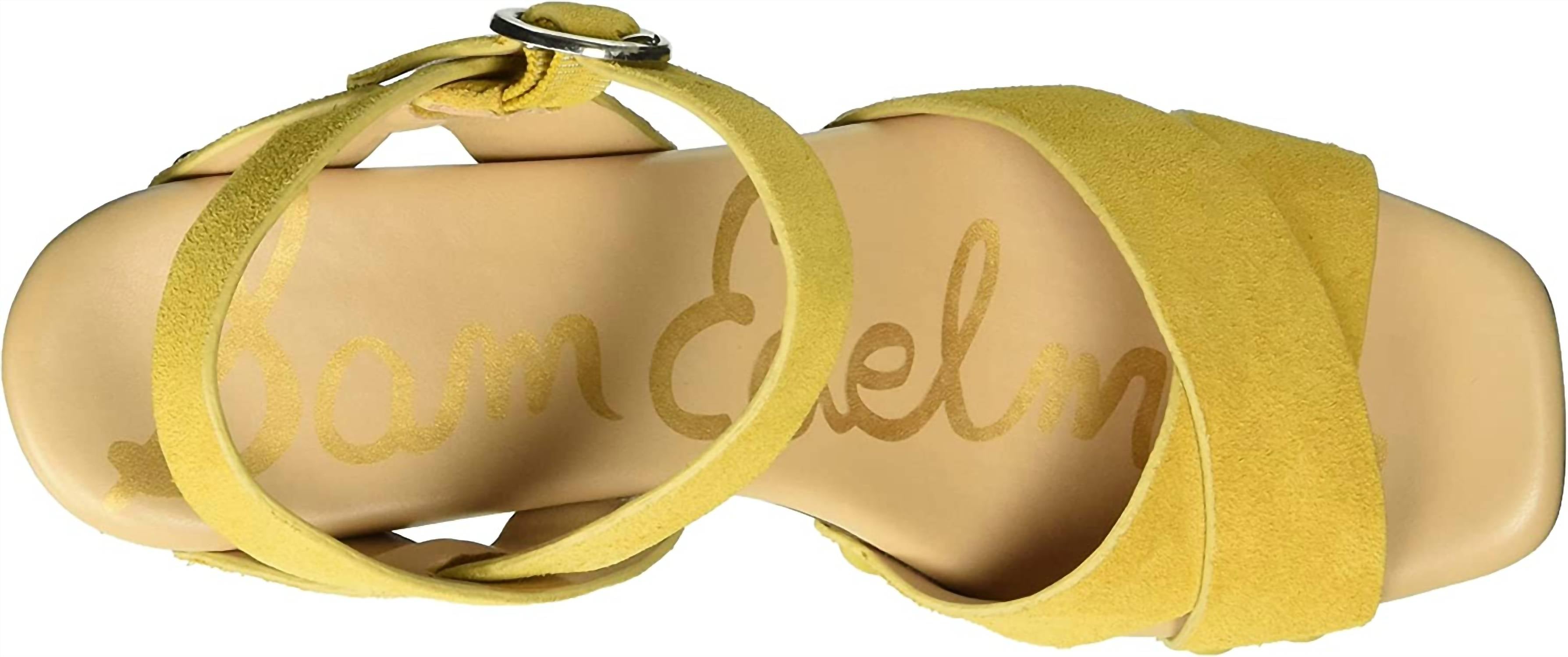 Classicly cute and all-day-wearable. We love this sandal. Step into confidence with the Women's Josefine Platform Heeled Sandal by Sam Edelman, crafted in striking mustard yellow suede. Featuring an open toe design with a comfortable 3.7-inch block heel and a 1.5-inch platform, these sandals are perfect for making a statement. The buckle closure adds a secure fit, and the leather material ensures durability and style. Ideal for adult women seeking a high-heeled sandal with a bold flair.