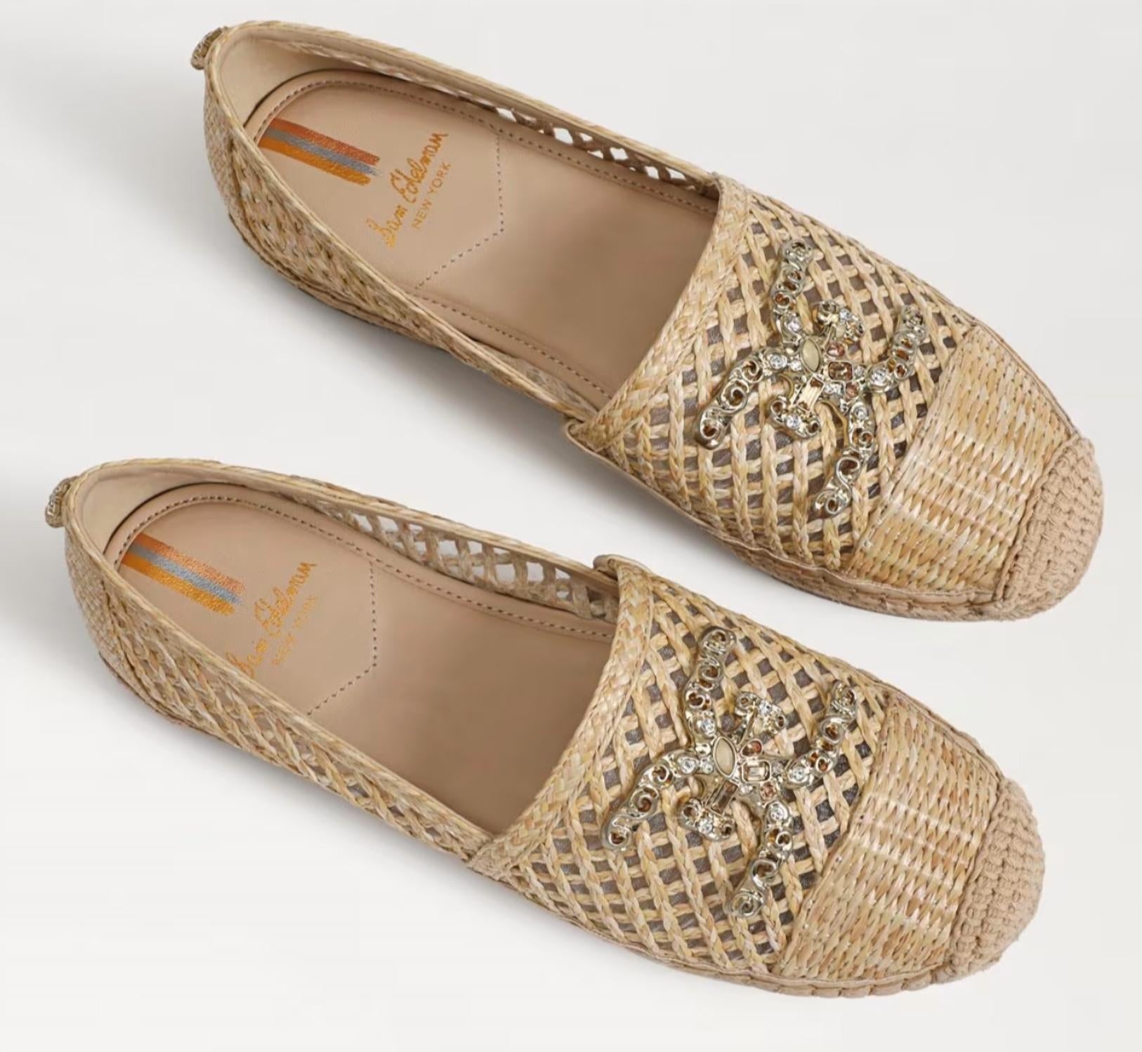 Classicly cute and all-day-wearable. We love this sandal. Unveiling the Women's Khiara Sandal by Sam Edelman in eye-catching gold, perfect for those seeking a chill-chic vibe. Featuring a platform height of 1 inch and a round toe, this slip-on espadrille embodies the essence of boho chic. Made from a blend of fabric and other materials, the shoe includes a synthetic insole for comfort. Ideal for summer vacations, these sandals bring a touch of blingy allure with their logo details.